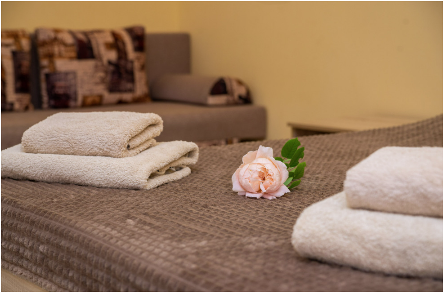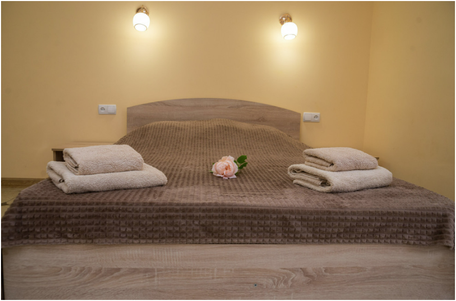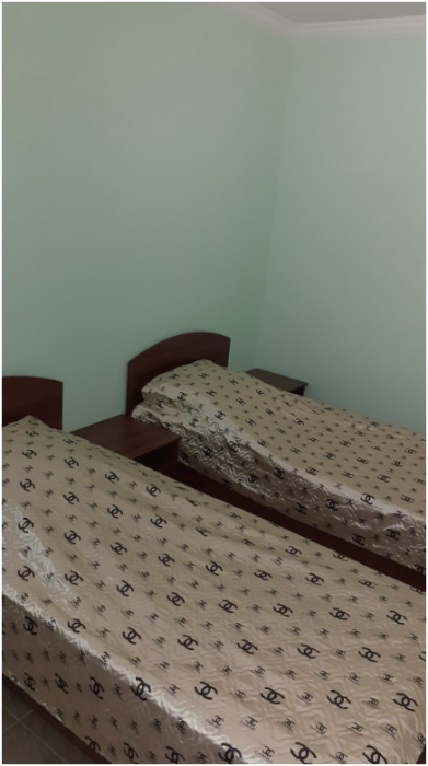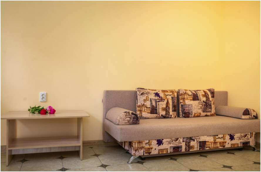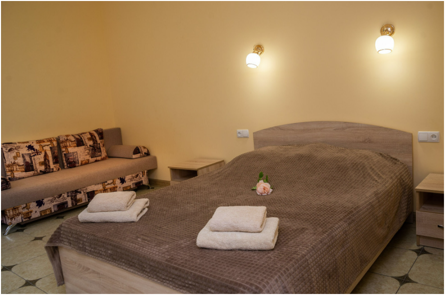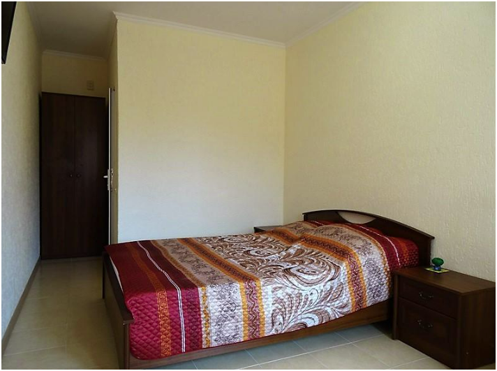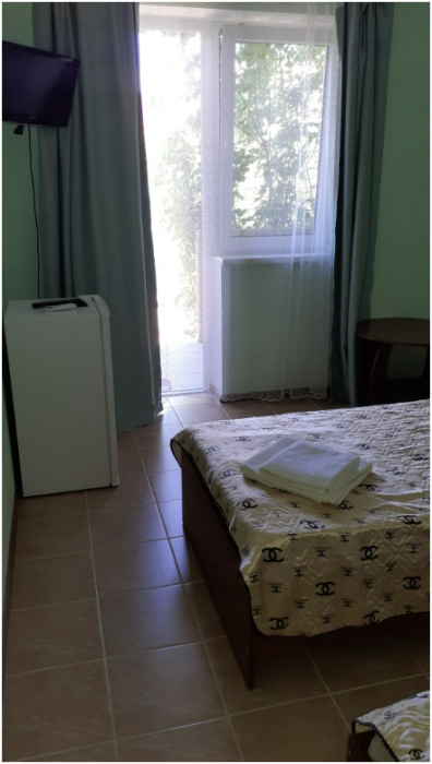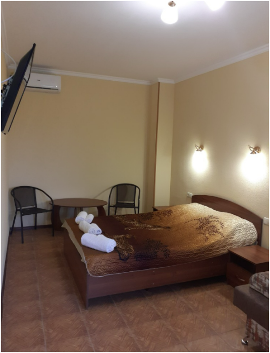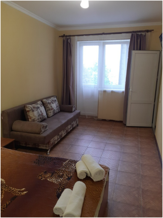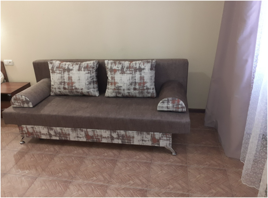 В комнате есть 2-спальная кровать с ортопедическим матрасом, 2-спальный диван, кондиционер, холодильник, телевизор, необходимая мебель для комфортного проживания, санузел и душ.