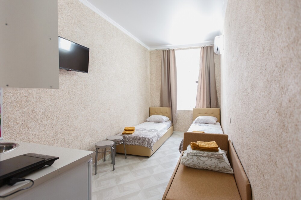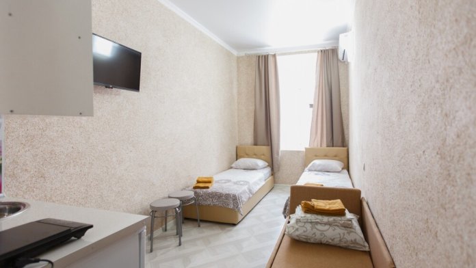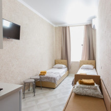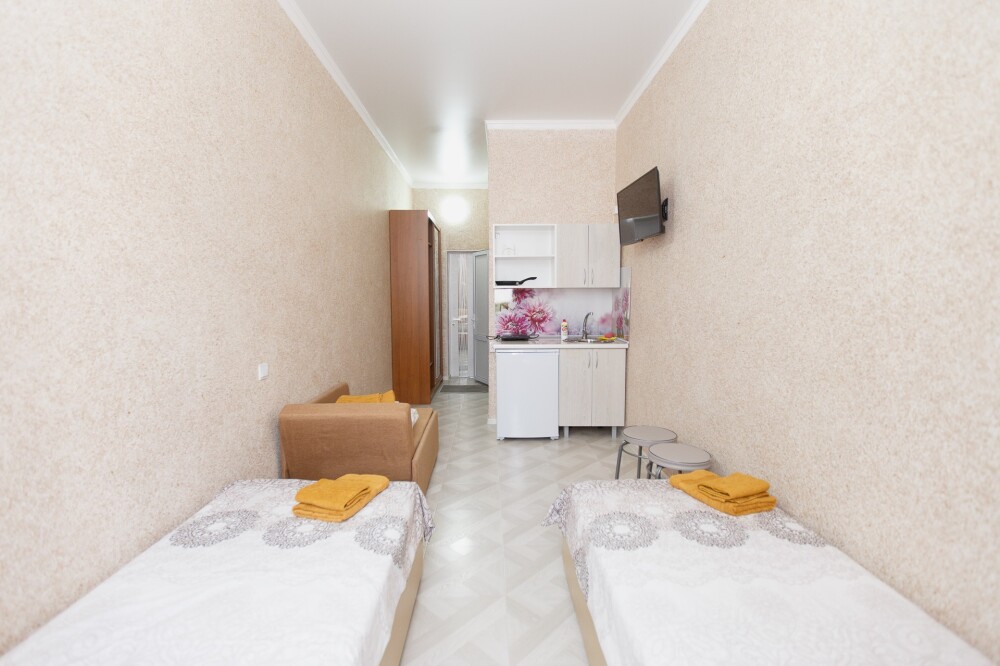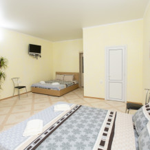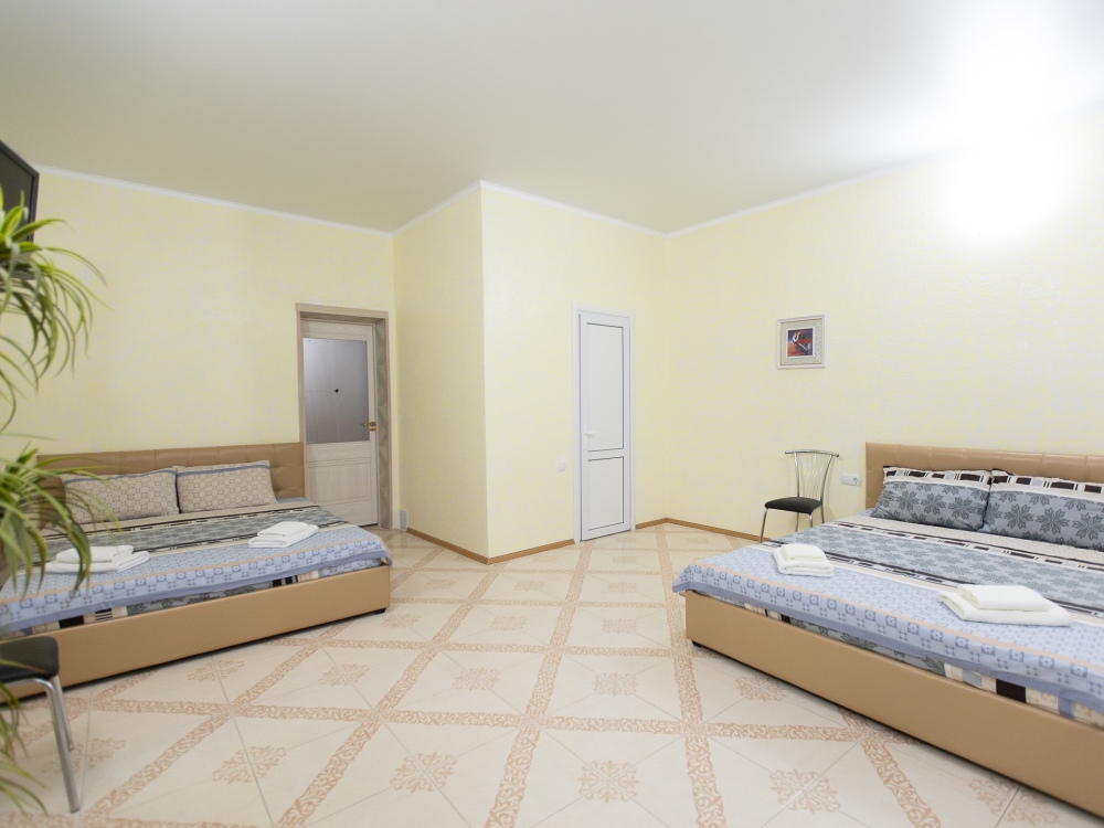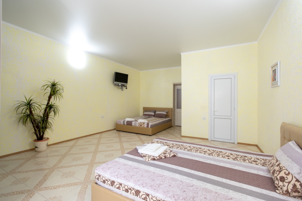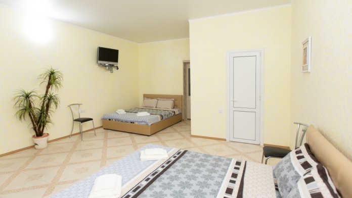 Номер семейный: просторный двухкомнатный номер с кухней, с двумя отдельными выходами на улицу и во двор к бассейну. В первой комнате две двухспальные кровати, шкаф, телевизор, кондиционер, санузел с душем.