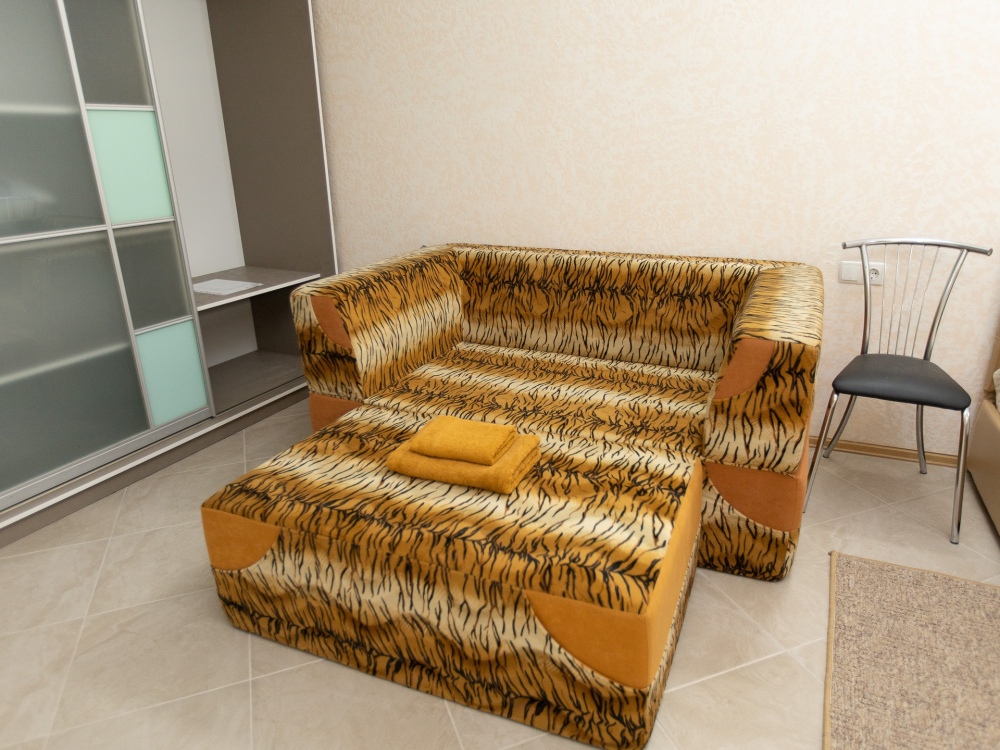 Во второй комнате двухспальная кровать и раскладной двухспальный диван, шкаф, телевизор, обеденный стол, кухня с однокомфорочной электрической плитой, холодильником, необходимой посудой, раковиной, микроволновкой. Максимальное количество человек - 8.