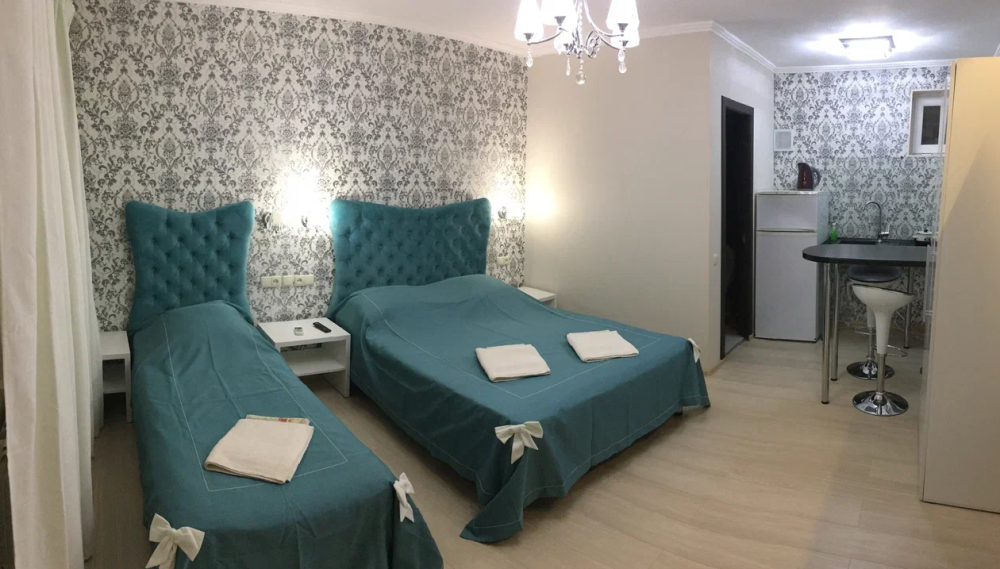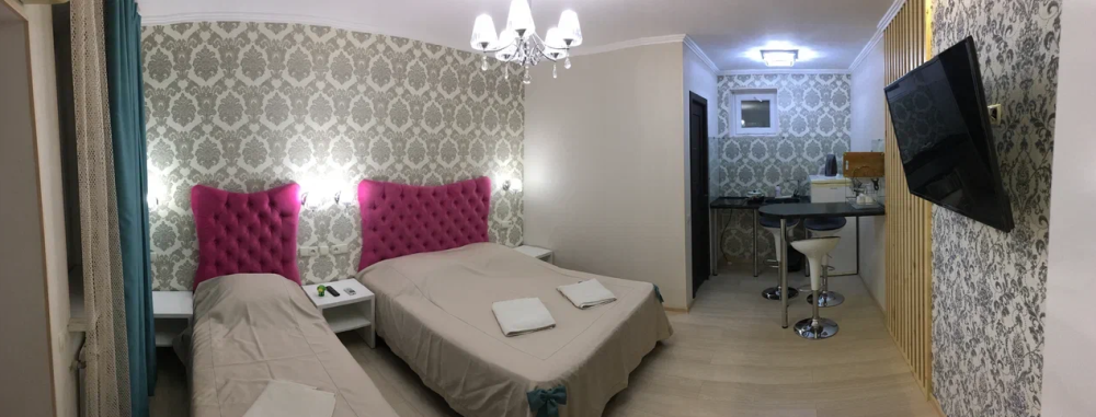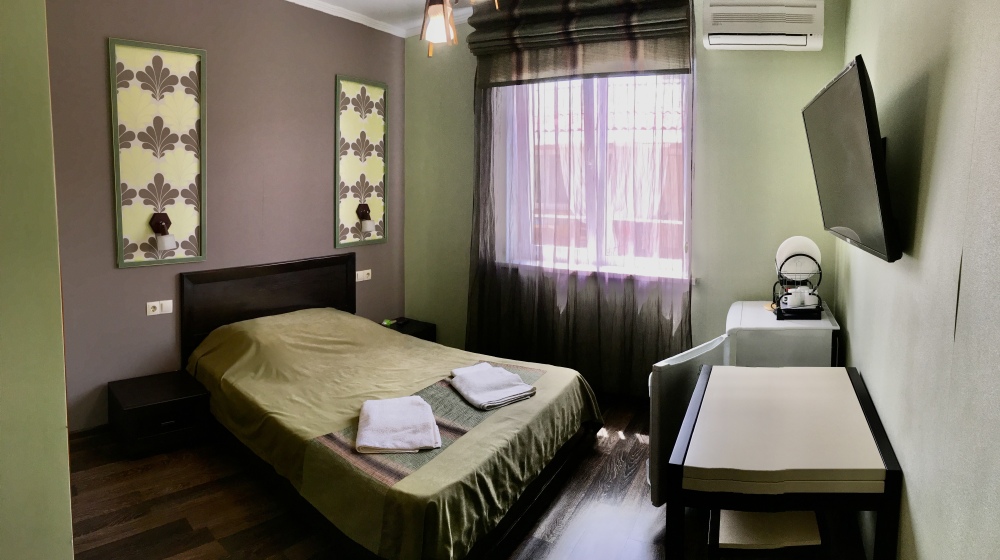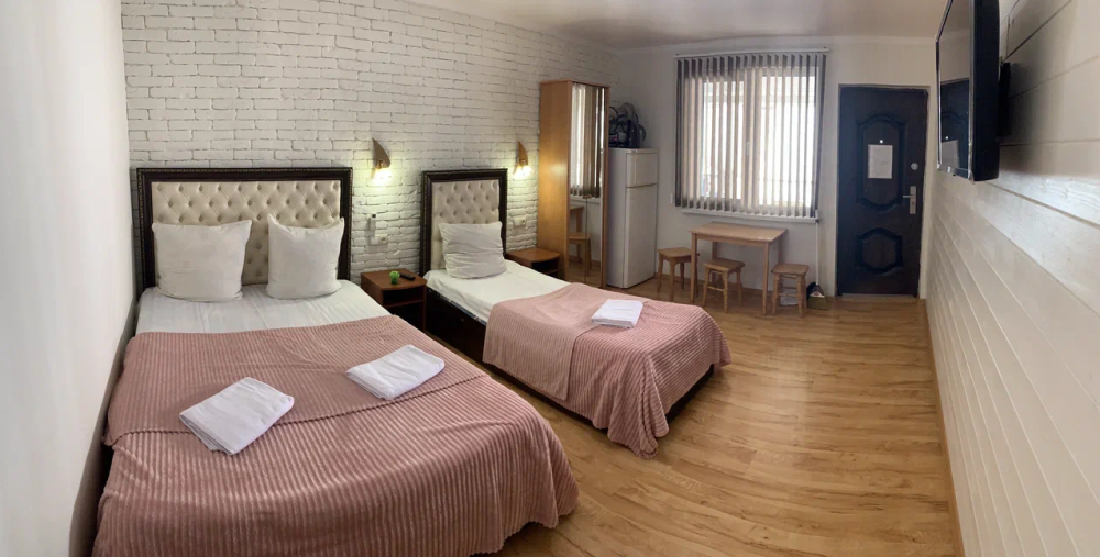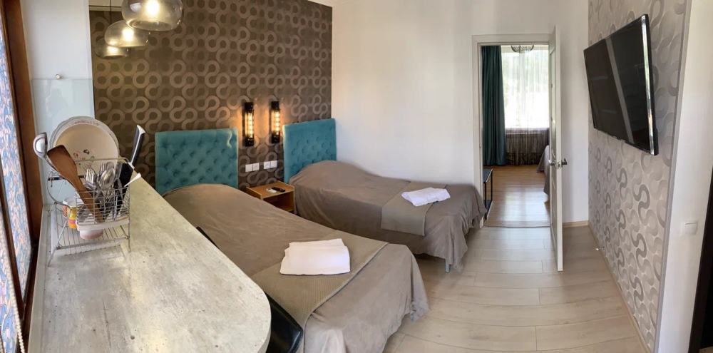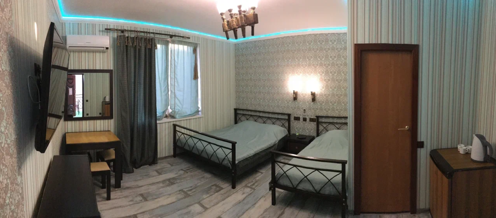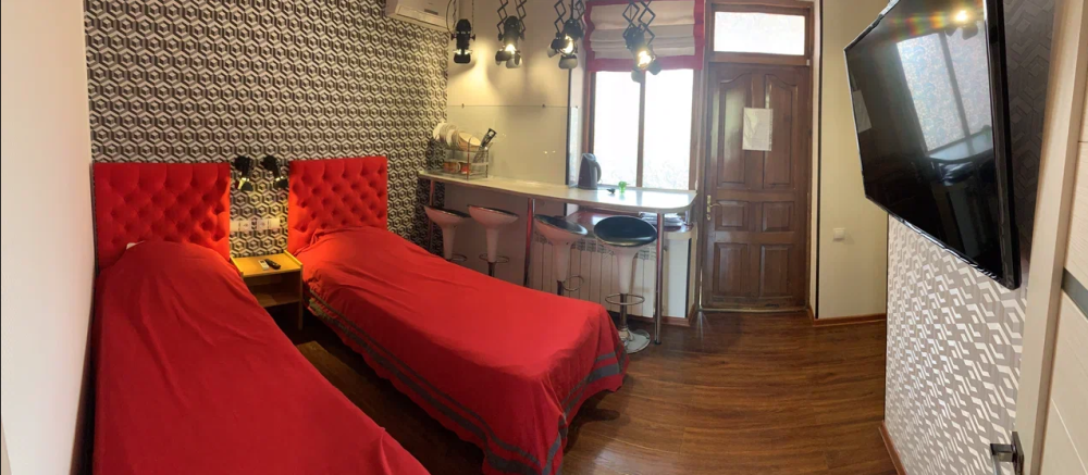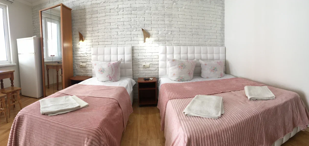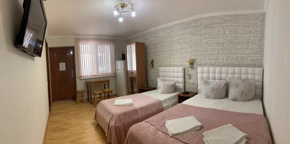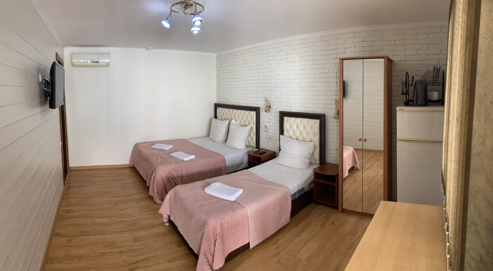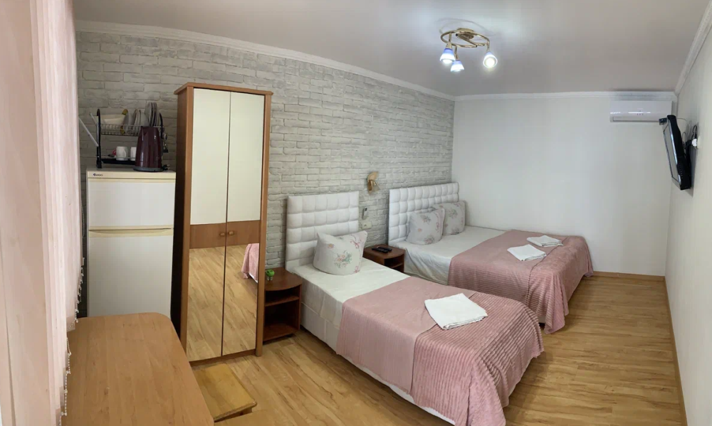 В доме всего 20 комнат. Все комнаты имеют индивидуальный дизайн и прекрасный вид. Мы предлагаем номера с кухней в номере и номера с общей кухней для приготовления пищи. Каждый номер оборудован туалетом и душем, в нем есть доступ к горячей и холодной воде. Номера оборудованы холодильником, кондиционером, телевизором, феном, собственным сан.узлом, есть выход в интернет через Wi-Fi. В номере хорошая мебель, кровати с ортопедическими матрасами.