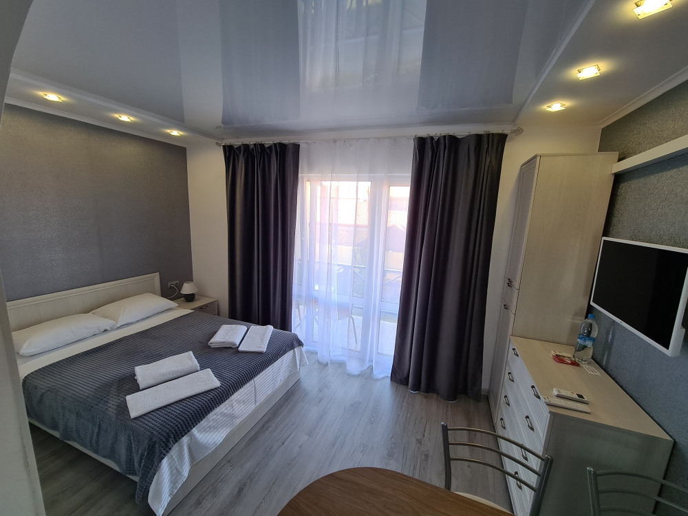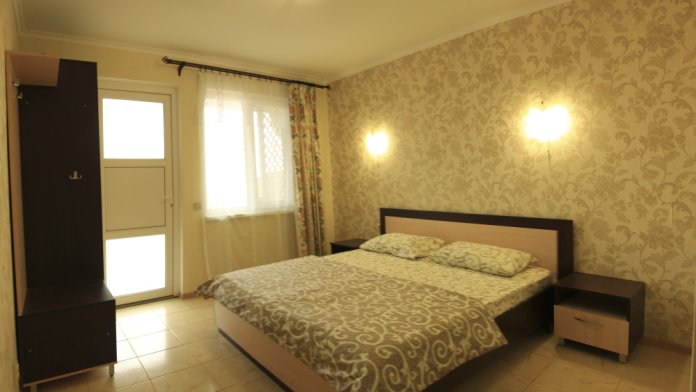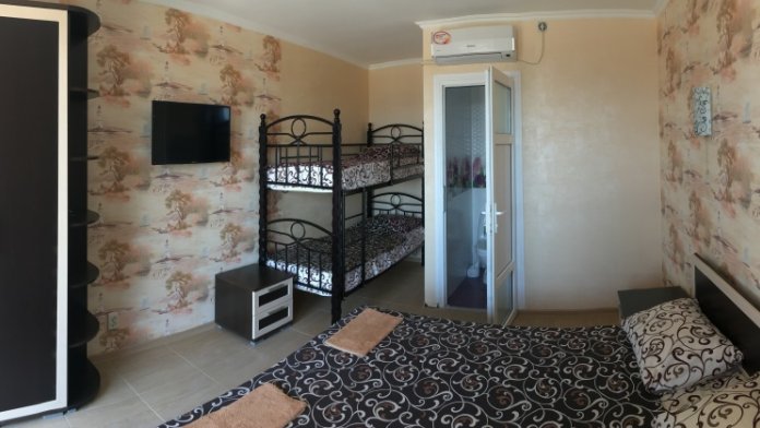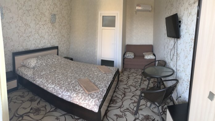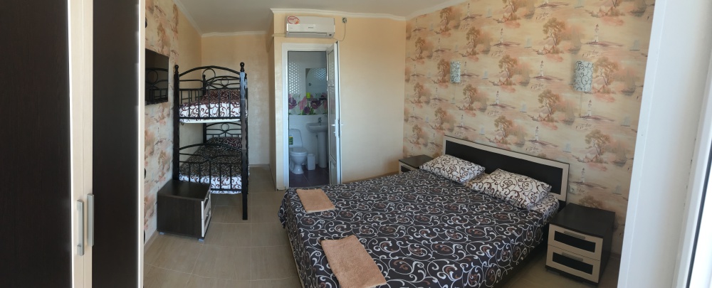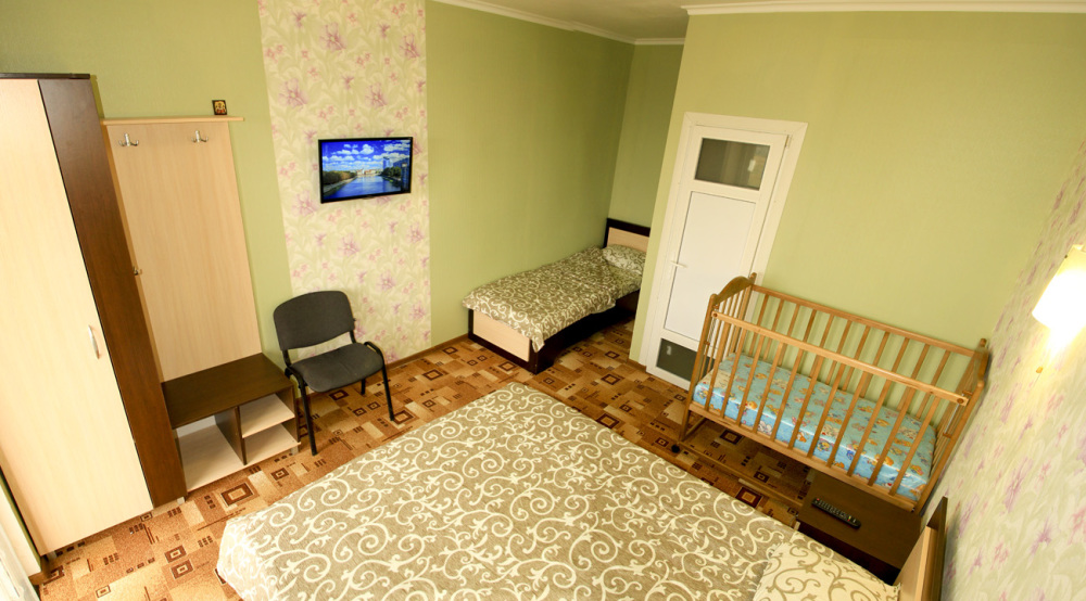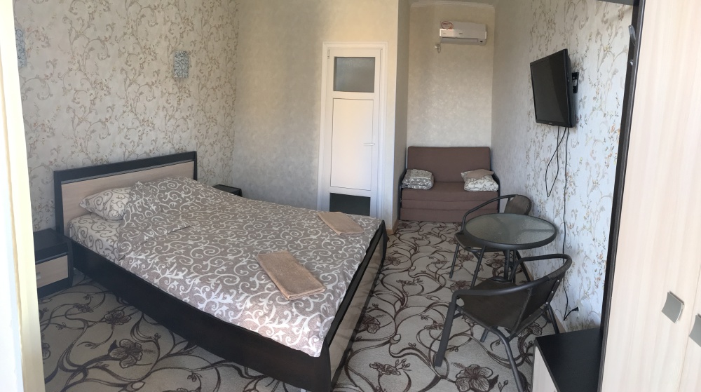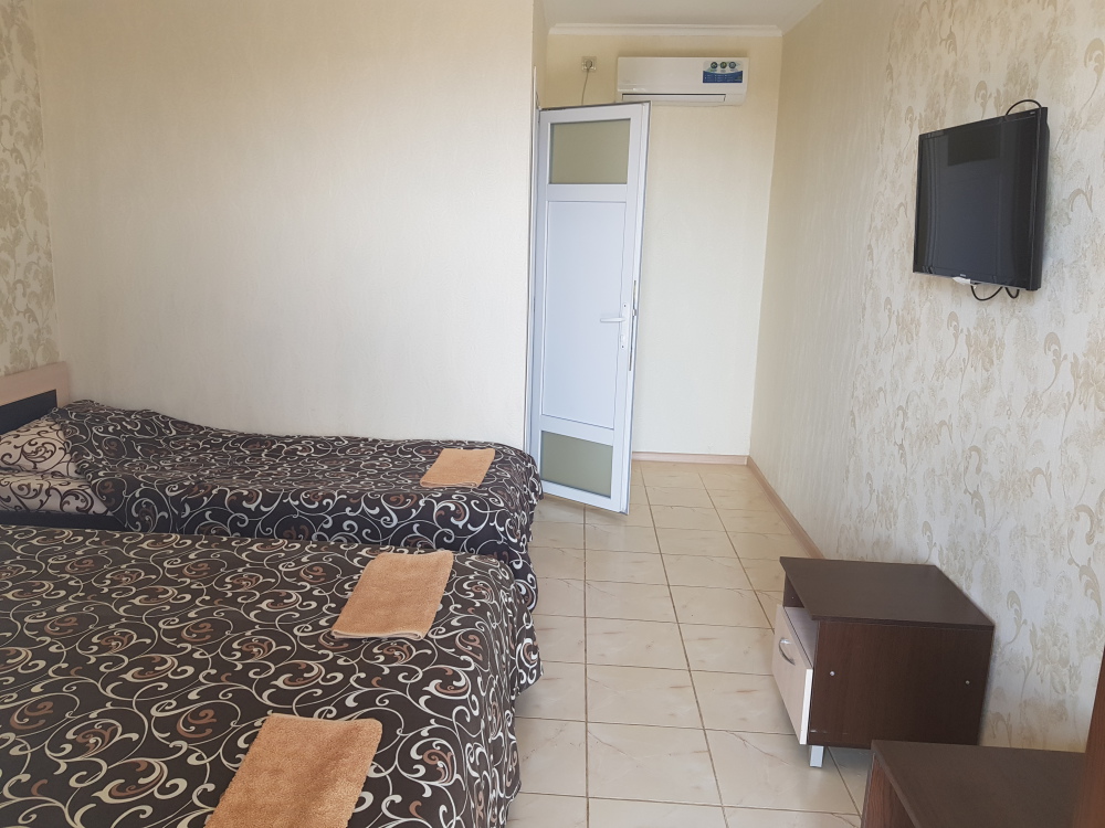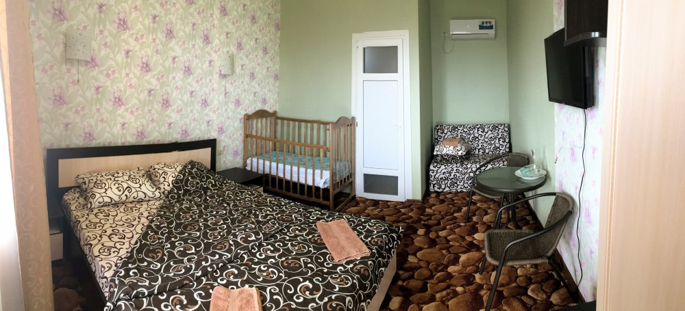 В наших комнатах - вся необходимая мебель, кондиционеры, телевизоры, санузел (холодная/горячая вода круглосуточно). Дополнительные места для Ваших детей, детские кроватки, стульчики для кормления, манеж. Из окон всех номеров открывается вид на море. На территории гостиницы комфортная обеденная зона с большим телевизором, просторная кухня с холодильником и плитой, уютная беседка с барбекю, детская площадка, парковка, Wi-Fi.