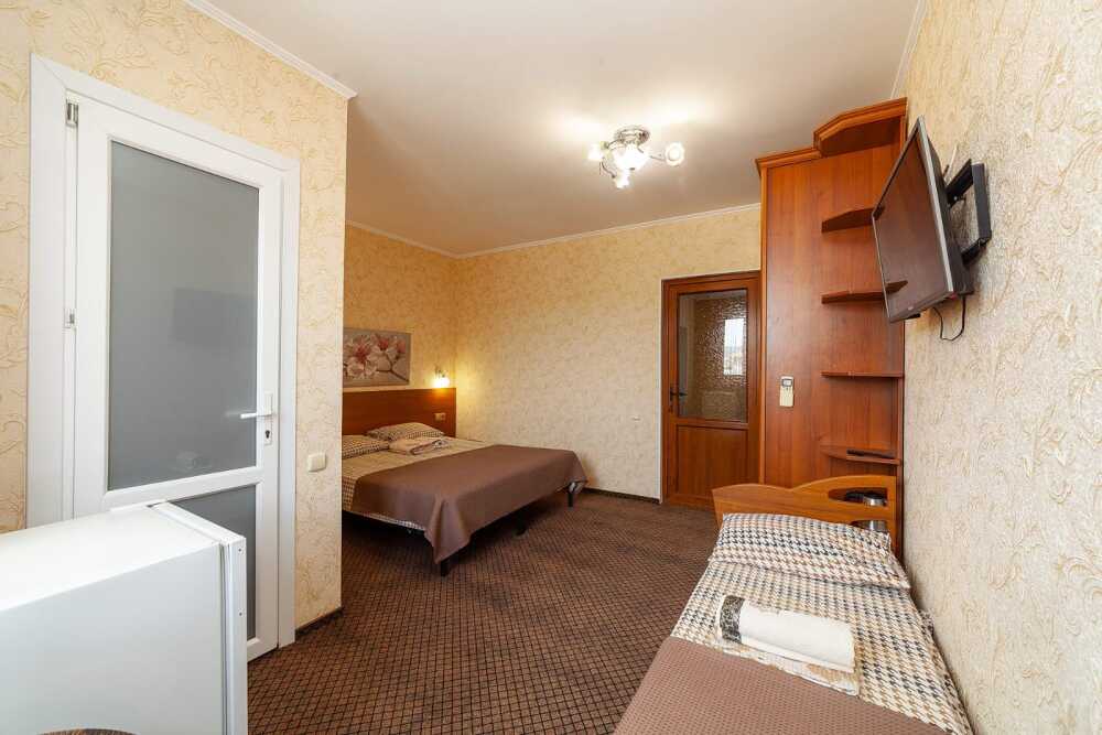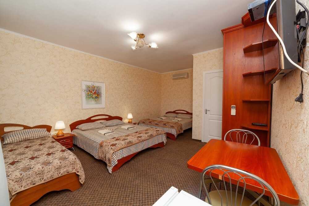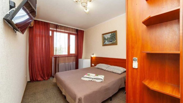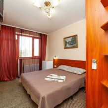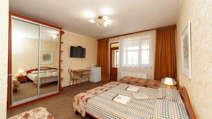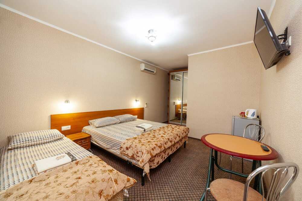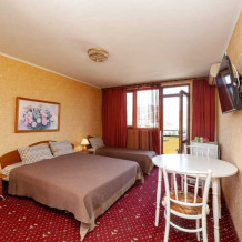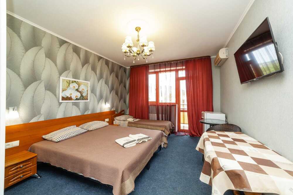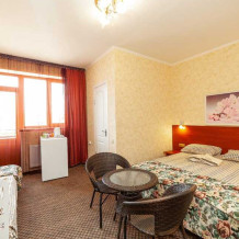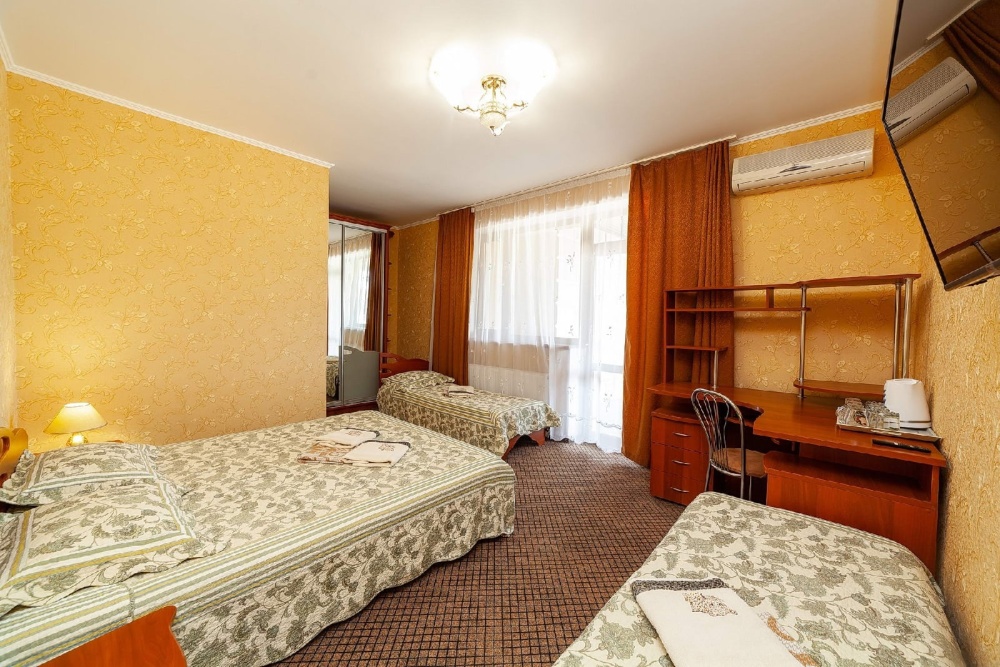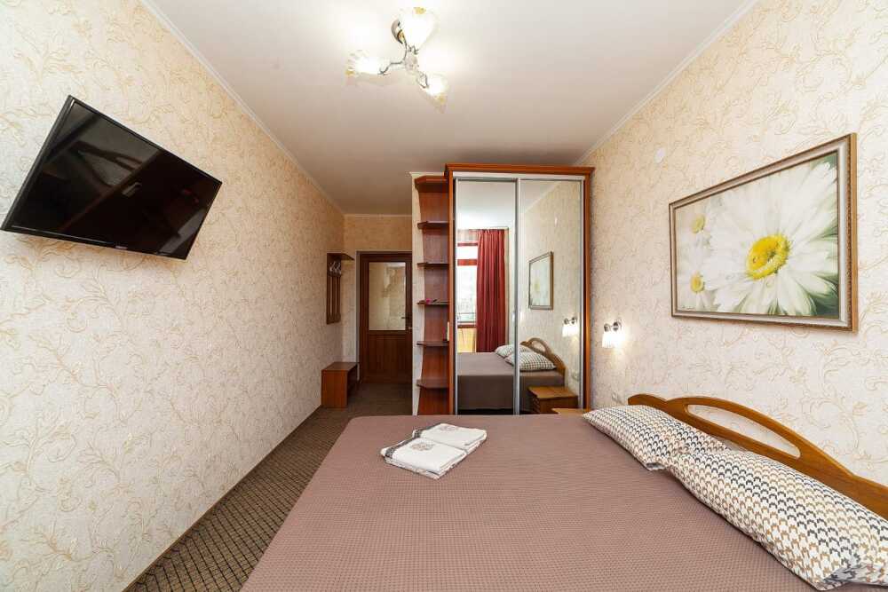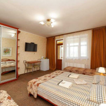 Комнаты от 2х до 3х мест, с отдельным стандартным балконом, площадь от 14 ., санузел в номере, сатиновое постельное белье, махровые полотенца, кровати по наличию мест, шкаф-гардероб с большим зеркалом, кондиционер, холодильник, плазменный телевизор, кабельные каналы, посуда для чая и напитков , разделочная доска, горячая и холодная вода постоянно, информационная папка.