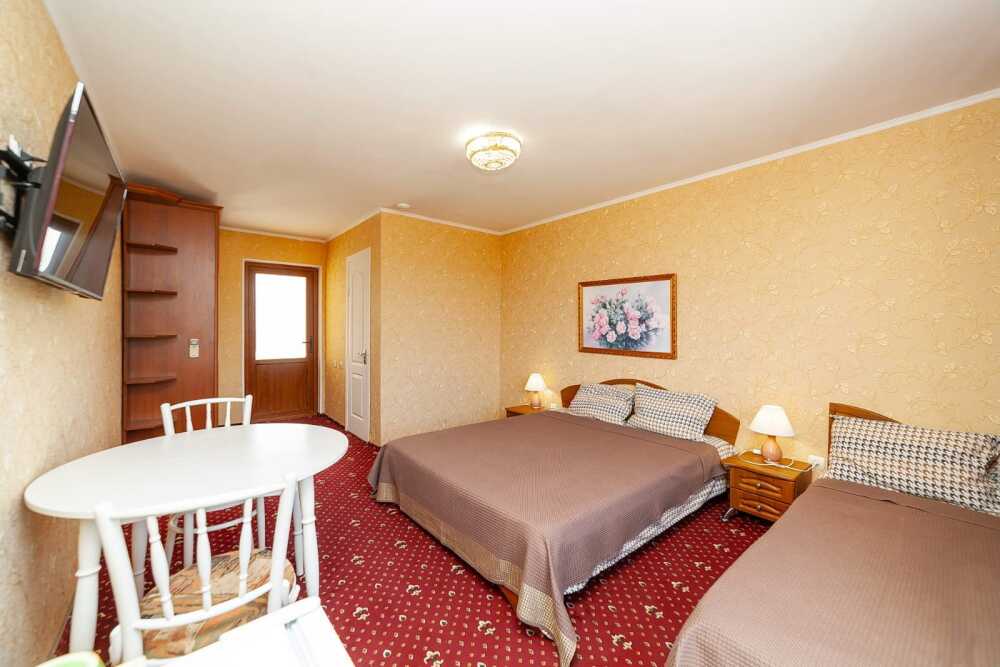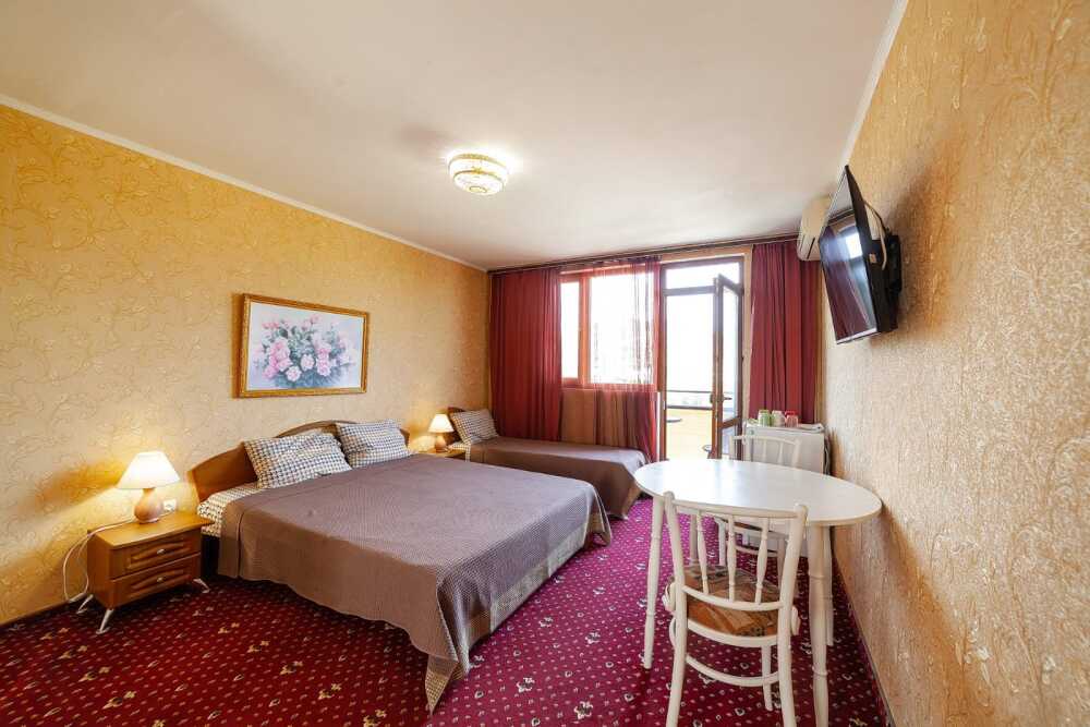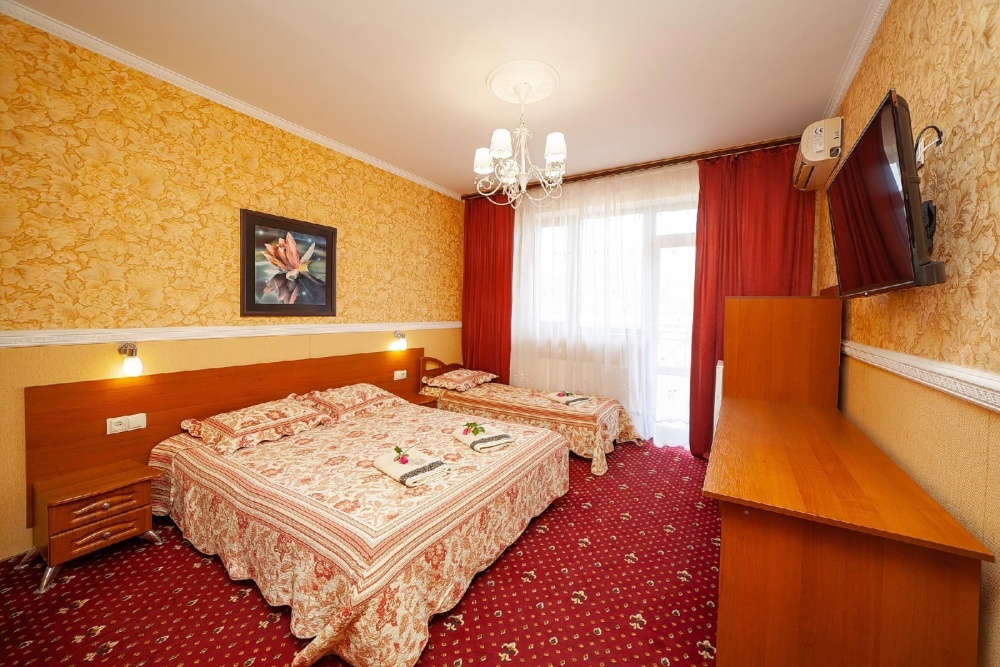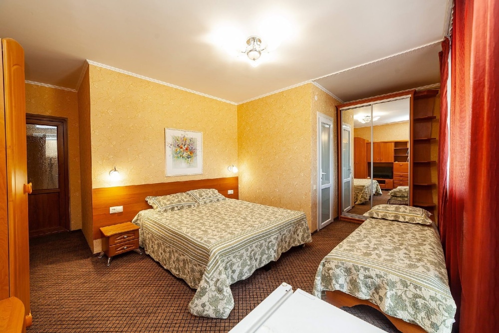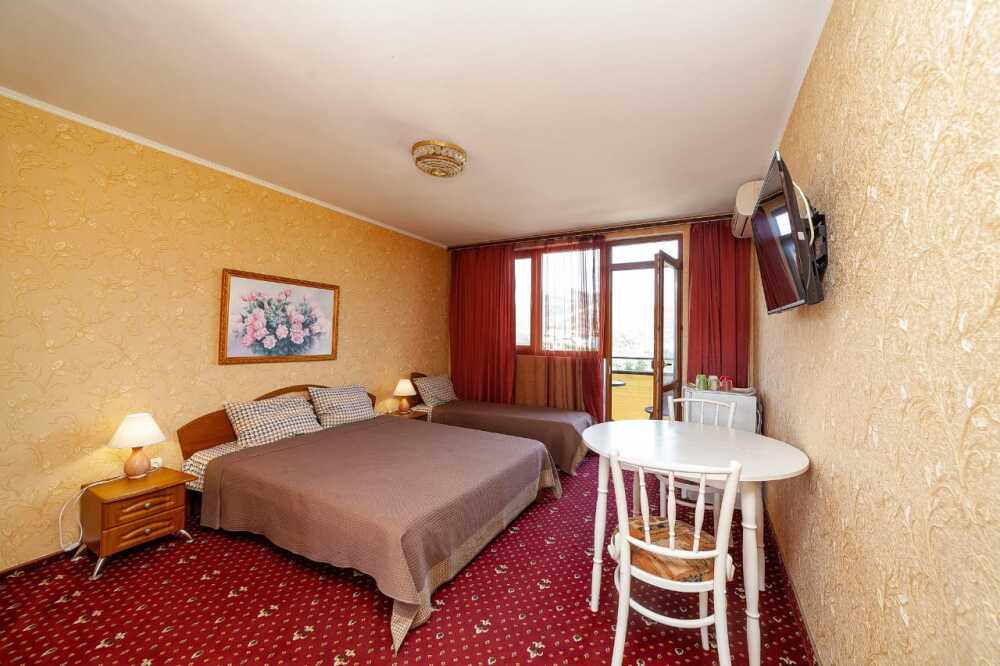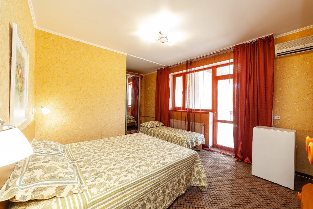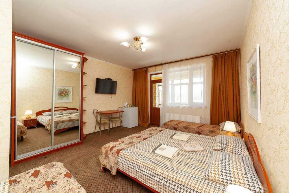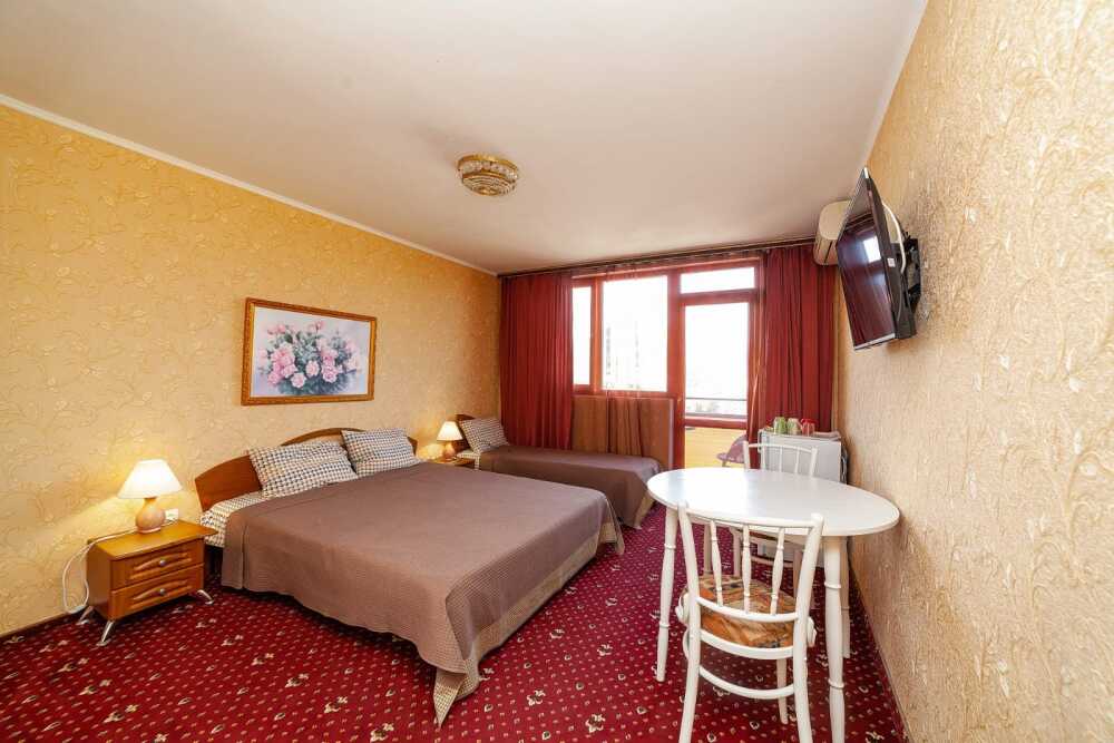 Комнаты от 2х до 3х мест, с отдельным стандартным балконом, площадь от 14 ., санузел в номере, сатиновое постельное белье, махровые полотенца, кровати по наличию мест, шкаф-гардероб с большим зеркалом, кондиционер, холодильник, плазменный телевизор, кабельные каналы, посуда для чая и напитков , разделочная доска, горячая и холодная вода постоянно, информационная папка.