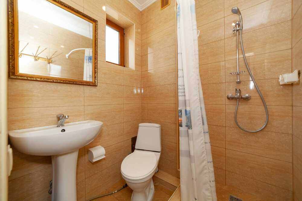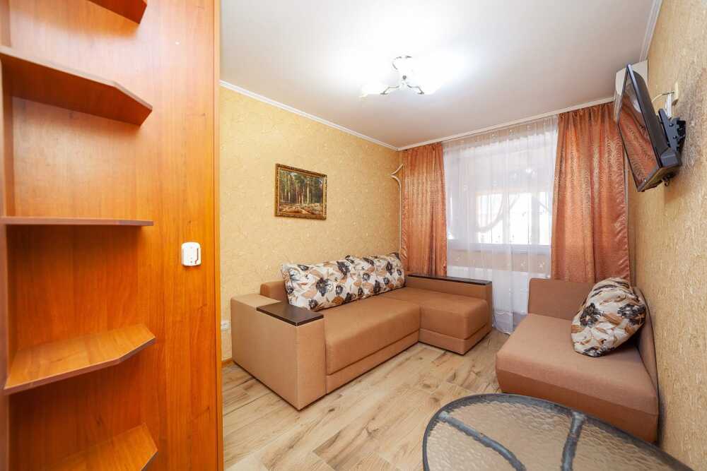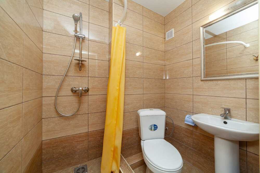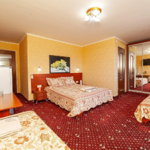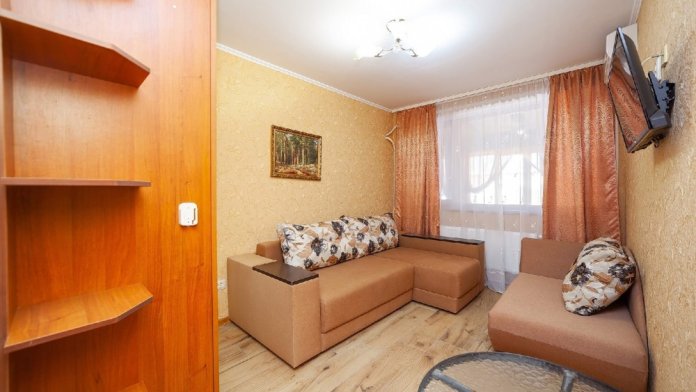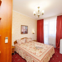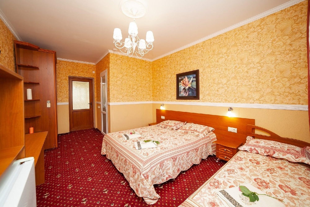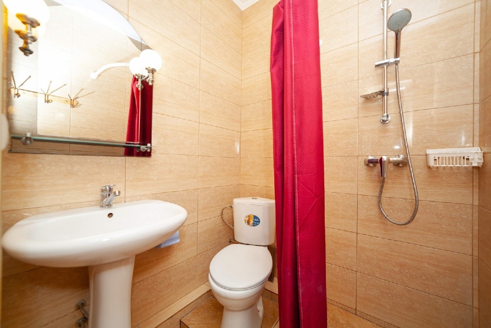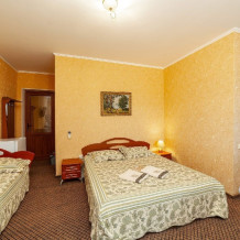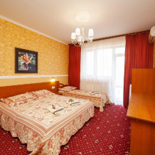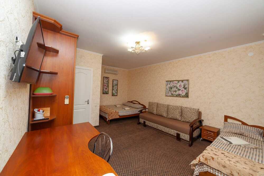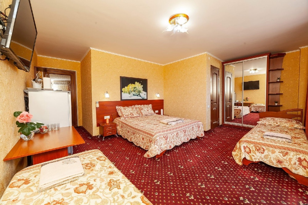 Комнаты от 2х до 3х мест, с отдельным стандартным балконом, площадь от 14 ., санузел в номере, сатиновое постельное белье, махровые полотенца, кровати по наличию мест, шкаф-гардероб с большим зеркалом, кондиционер, холодильник, плазменный телевизор, кабельные каналы, посуда для чая и напитков , разделочная доска, горячая и холодная вода постоянно, информационная папка.