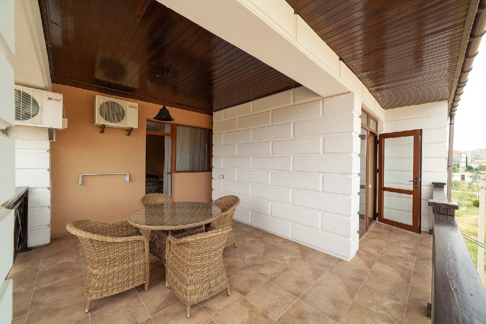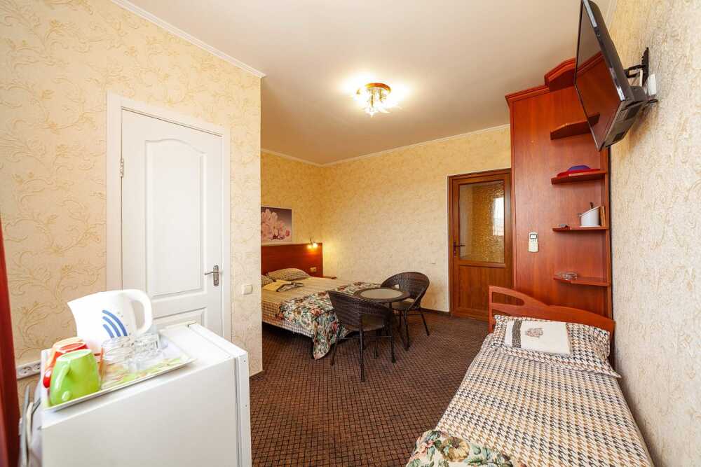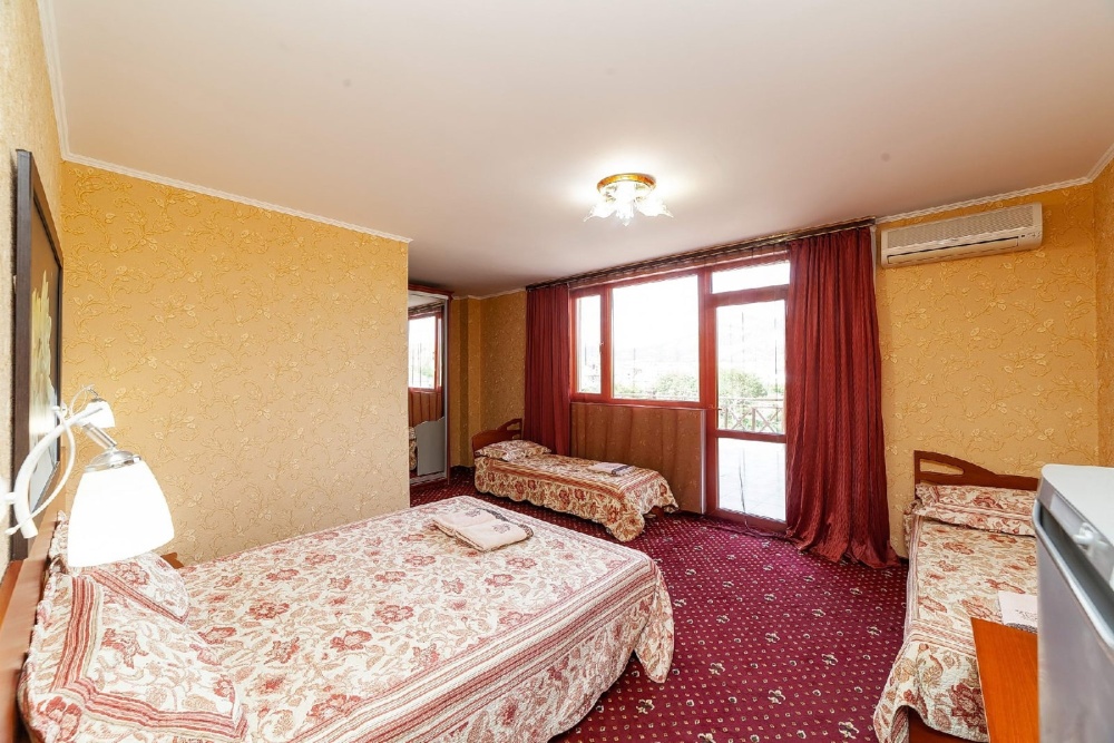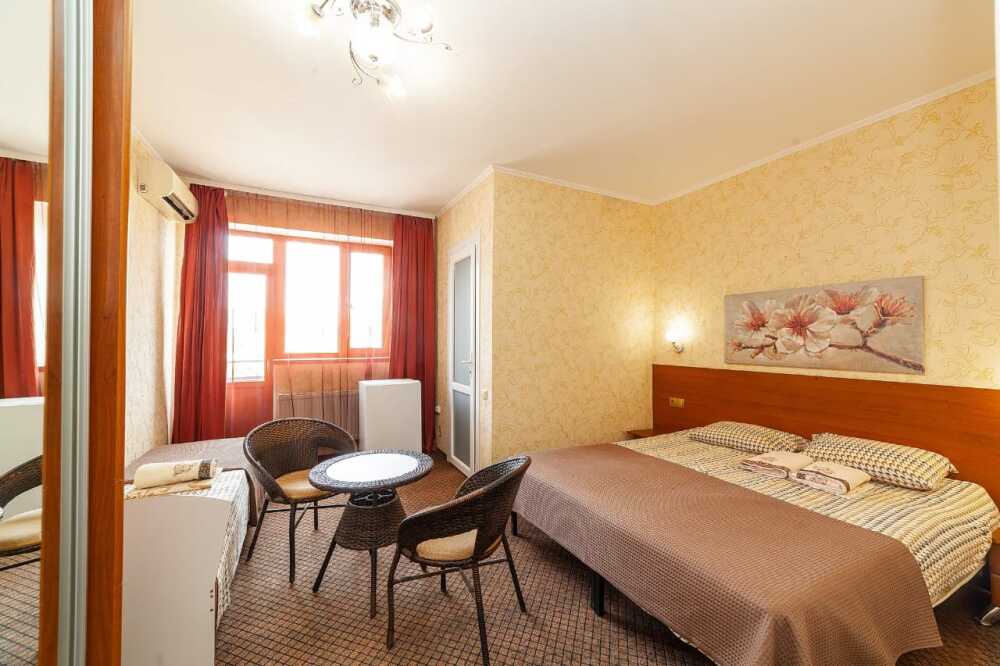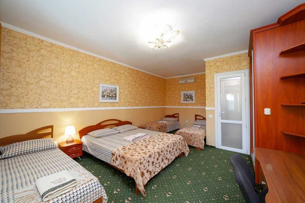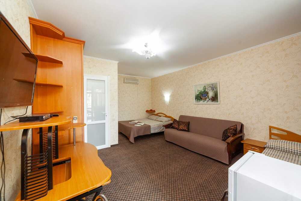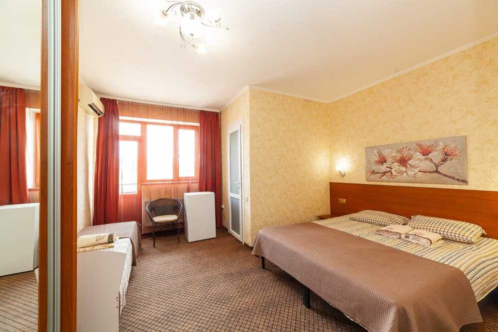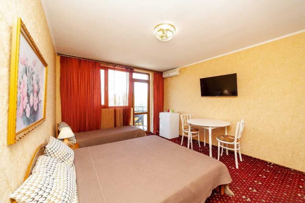 Комната для 2х -3х с выходом на террасу. Площадь от 14кв.м. Количество кроватей по наличию мест: диван 2х спальный + доп. место, при необходимости. Санузел находится в комнате, горячая и холодная вода постоянно. Комната оснащена шкафом с зеркалом, прикроватными тумбочками, столом, стульями, светильниками, кондиционером, холодильником, кабельным TV, набором посуды, разделочной доской для фруктов, постельным бельем, махровыми полотенцами, информационной папкой.