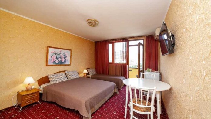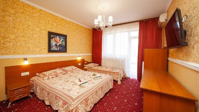 Комнаты от 2х до 4х мест с большим балконом, Площадь от 14 до 22 кв.м.кв.м., санузел в комнате, кровати по наличию мест , 2х спальная кровать (+1), шкаф-гардероб с большим зеркалом, плечики для одежды, сатиновое постельное белье, махровые полотенца, кондиционер, холодильник, электрический чайник, посуда для чая и напитков, посуда для фруктов, разделочная доска, плазменный телевизор, спутниковые каналы, горячая и холодная вода постоянно, информационная папка.