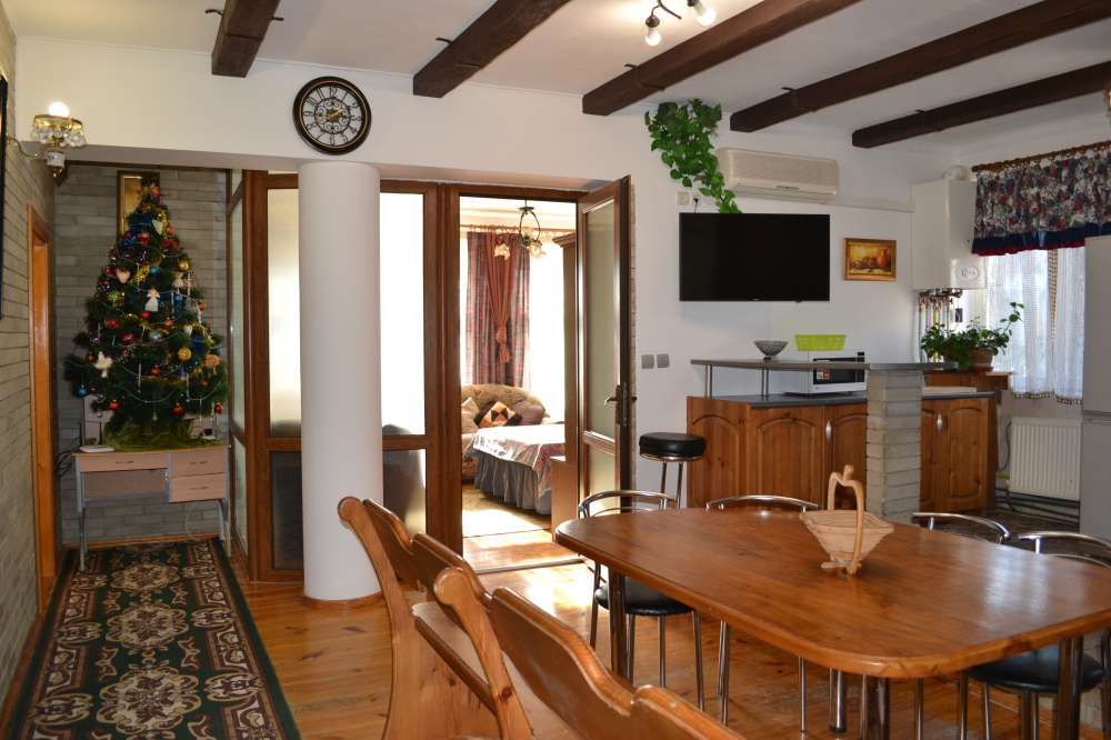 В 3-х отдельных уютных спальнях могут разместиться до 11 гостей. В каждой спальне большая кровать 2х2 м и раскладное кресло, при необходимости есть детская кроватка для малыша. Провести совместное время Вы можете в просторной гостиной столовой, за большим столом в дружной компании, всем хватит места!