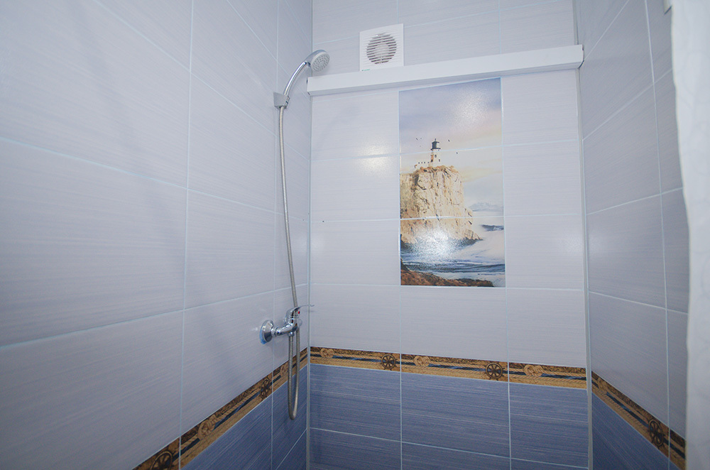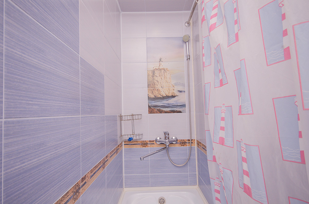- отделка (на полу кафельная плитка, на стенах структурная краска, натяжной потолок)