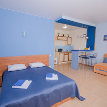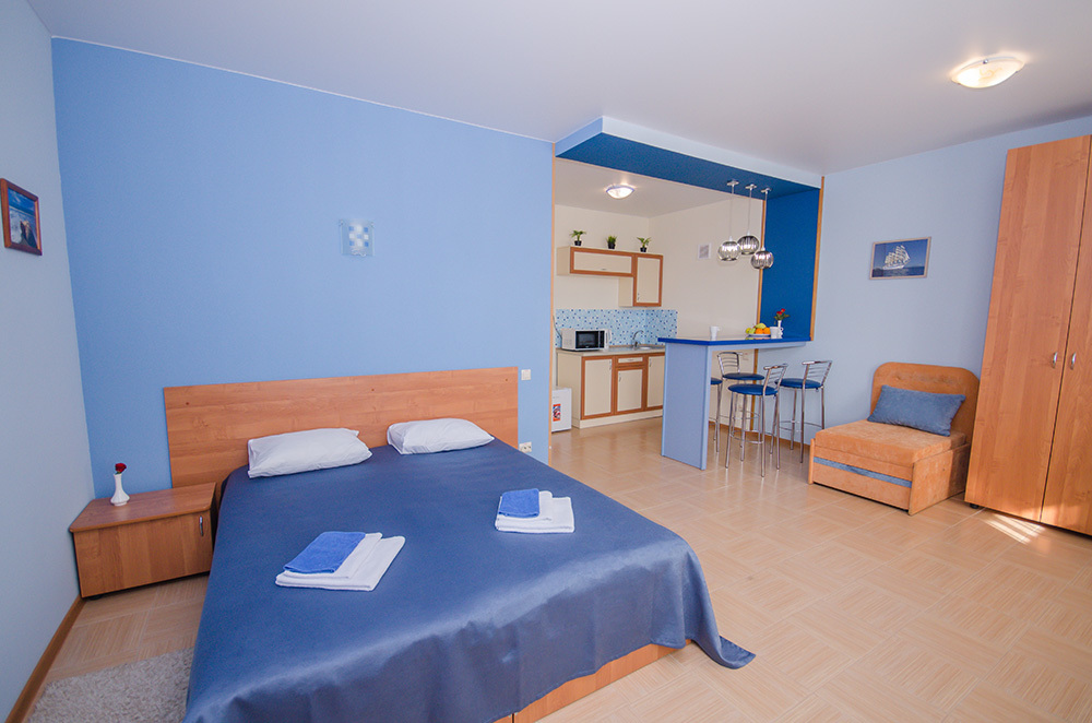 Рядом с номерами категории «Студия» расположена просторная открытая площадка-солярий с лежаками и летней мебелью. В номерах установлена мини-кухня и барная стойка.