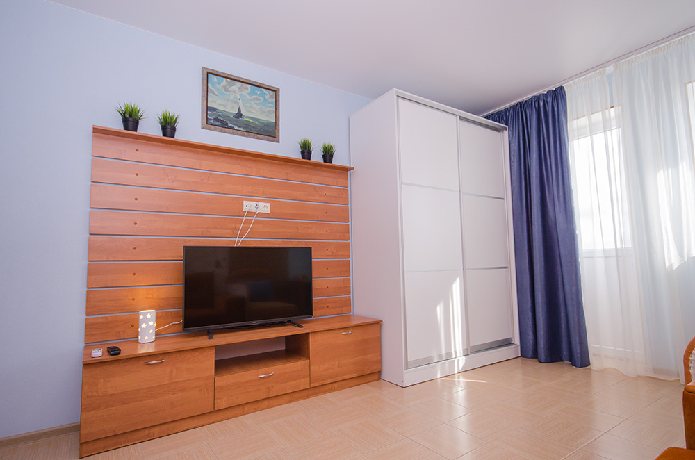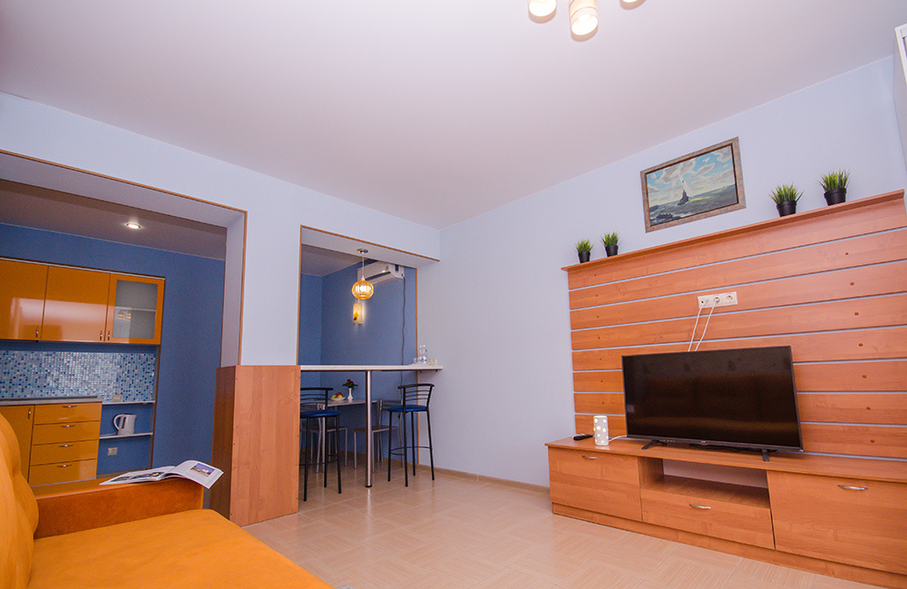 - гостиная: прихожая, трюмо, зеркало, мини-кухня, обеденный стол с 4-мя стульями, барная стойка, барные стулья, раскладной двуспальный диван, шкаф-купе, тахта, стол, стул, тумба под телевизор с полками, балкончик, кондиционер, телевизор, холодильник