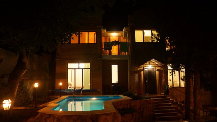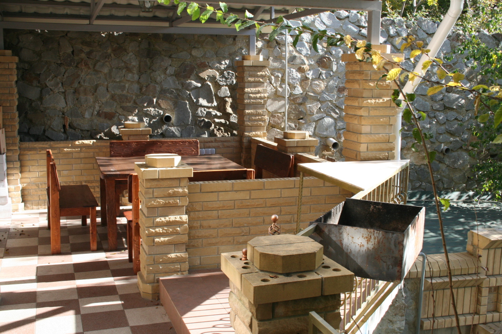 На улице беседка с барбекю и бассейн.