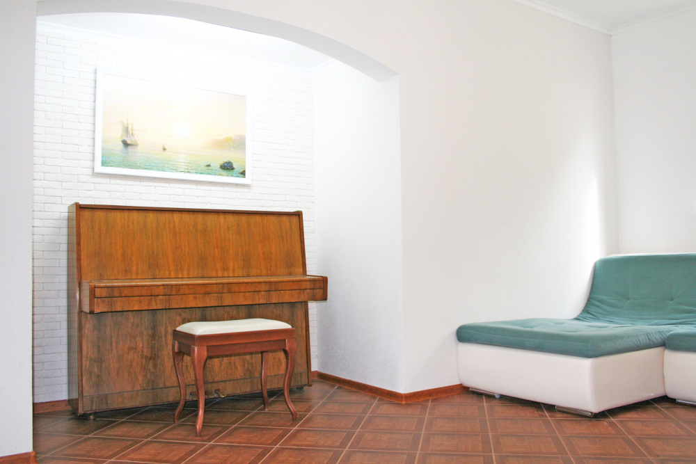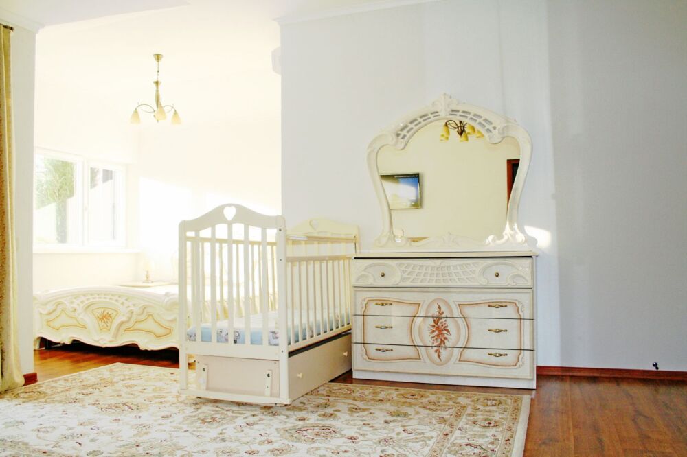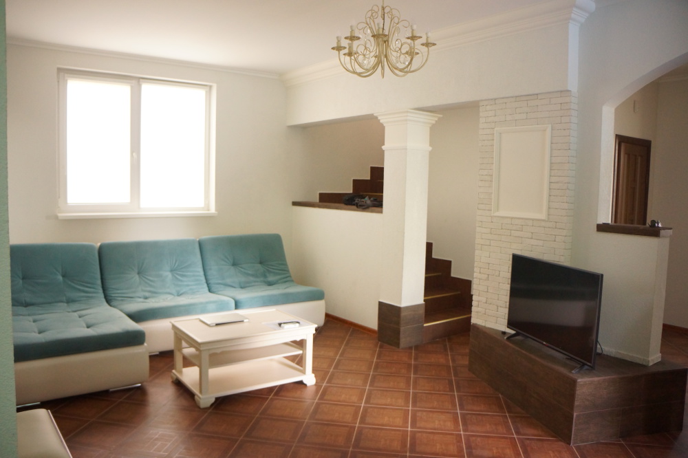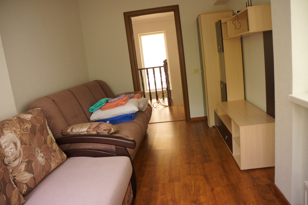 Новый просторный дом, построенный по индивидуальному проекту. В доме два этажа. На втором этаже три комнаты - две спальни с двуспальными кроватями и санузлом в каждой спальне, детская с двумя раскладывающимися диванами. На первом этаже общая комната с эркером, кухня, санузел и прихожая. В общей комнате и эркере раскладные диваны. В доме есть фортепиано.