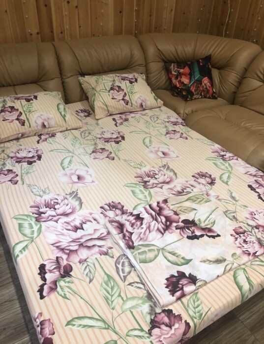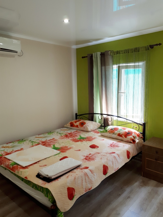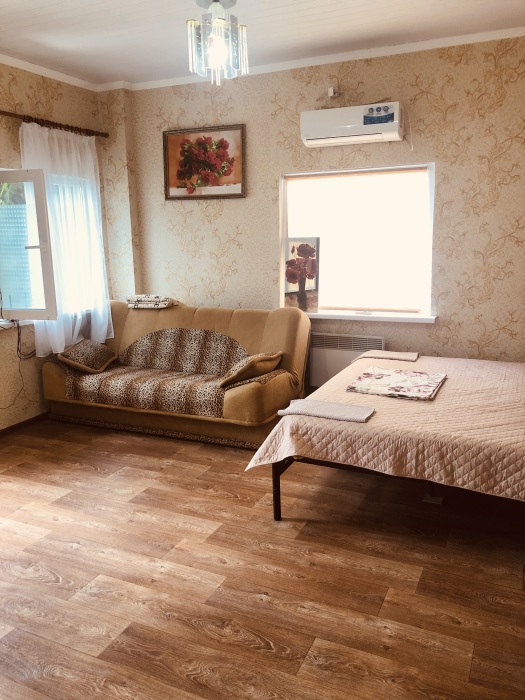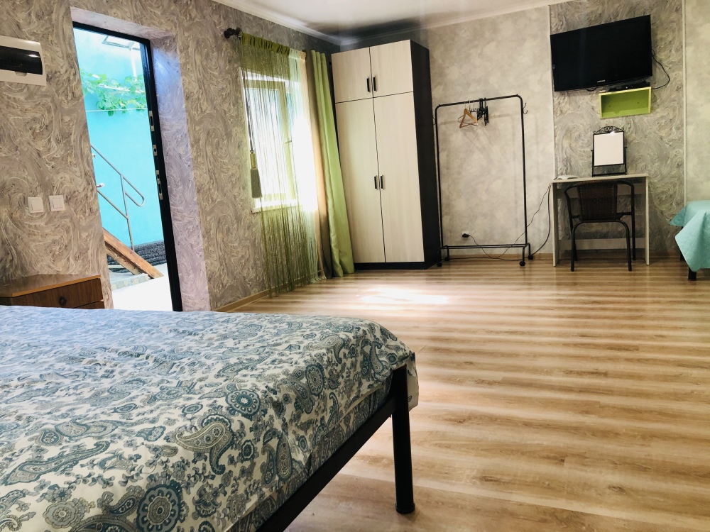В номере: 2-спальняя кровать и диван, кухонная зона, личный санузел, кондиционер, телевизор, интернет.