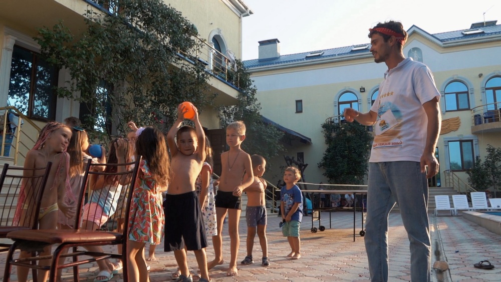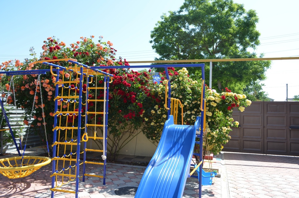 На территории гостевого дома расположены 2 корпуса, 2 летних крытых беседки (чайная зона + кафе и беседка для занятий аниматора с детьми), открытый бассейн с подогревом, гидромассажем и раздельными взрослой и детской чашами, столовая, детская площадка, вечерний кинозал, батут, настольный теннис, открытая парковка под видеонаблюдением перед территорией гостевого дома.