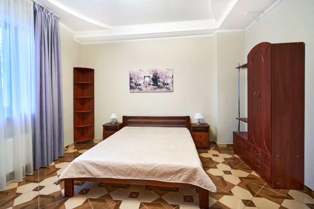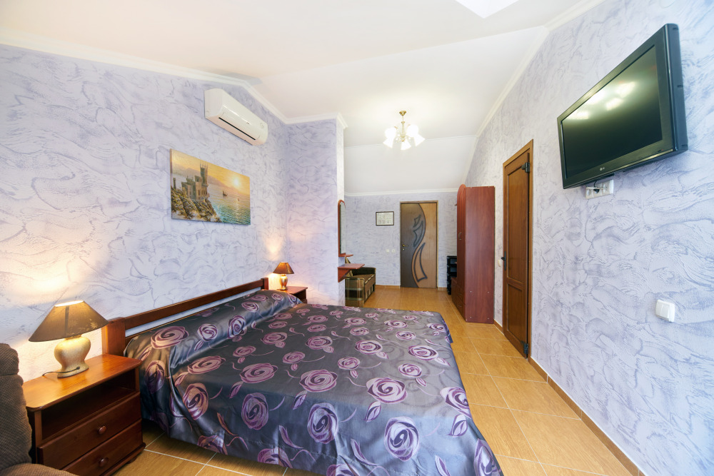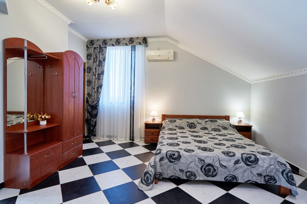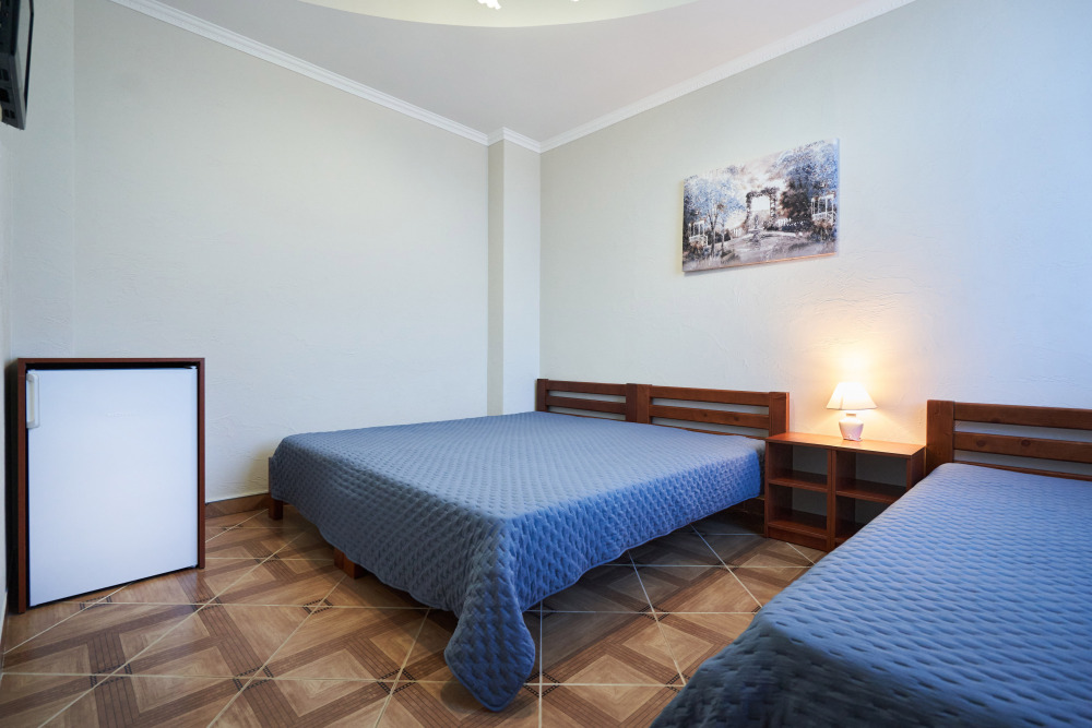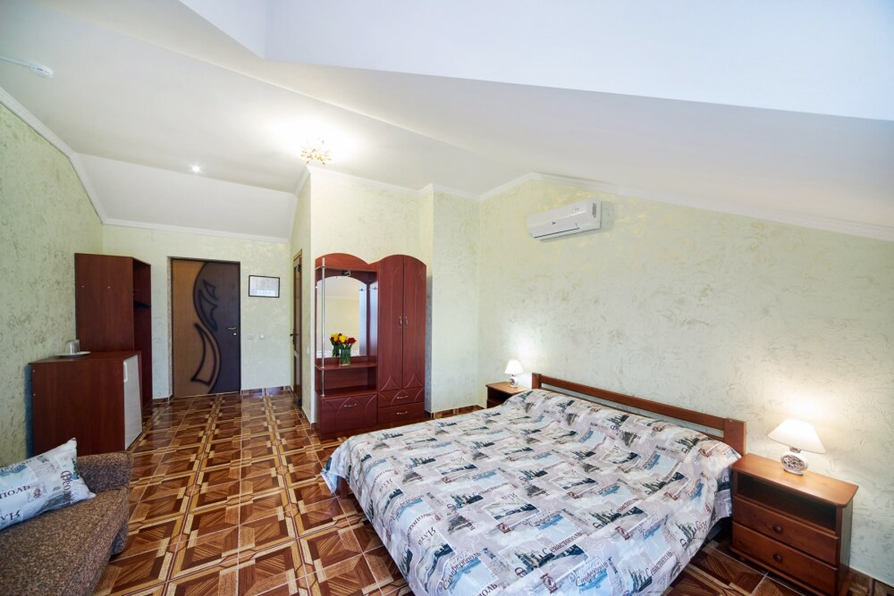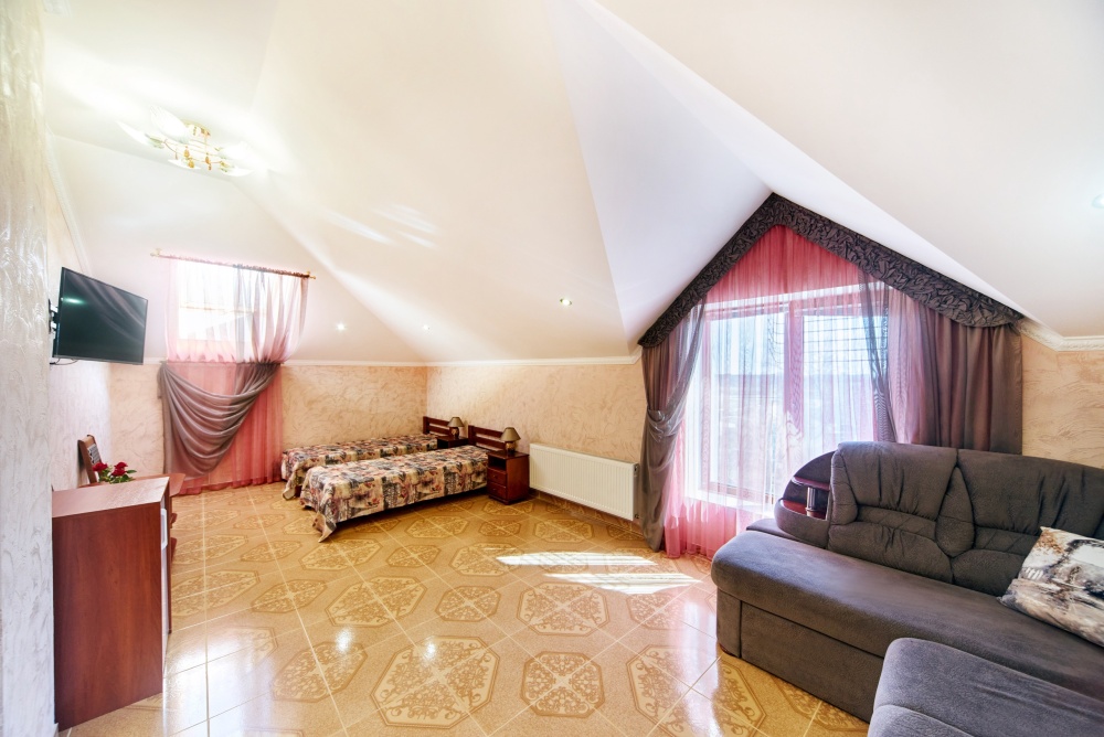 В гостевом доме есть номера, которые подойдут как небольшой семье или компании, так и большие двухкомнатные номера, которые вмещают в себя до 6 человек.