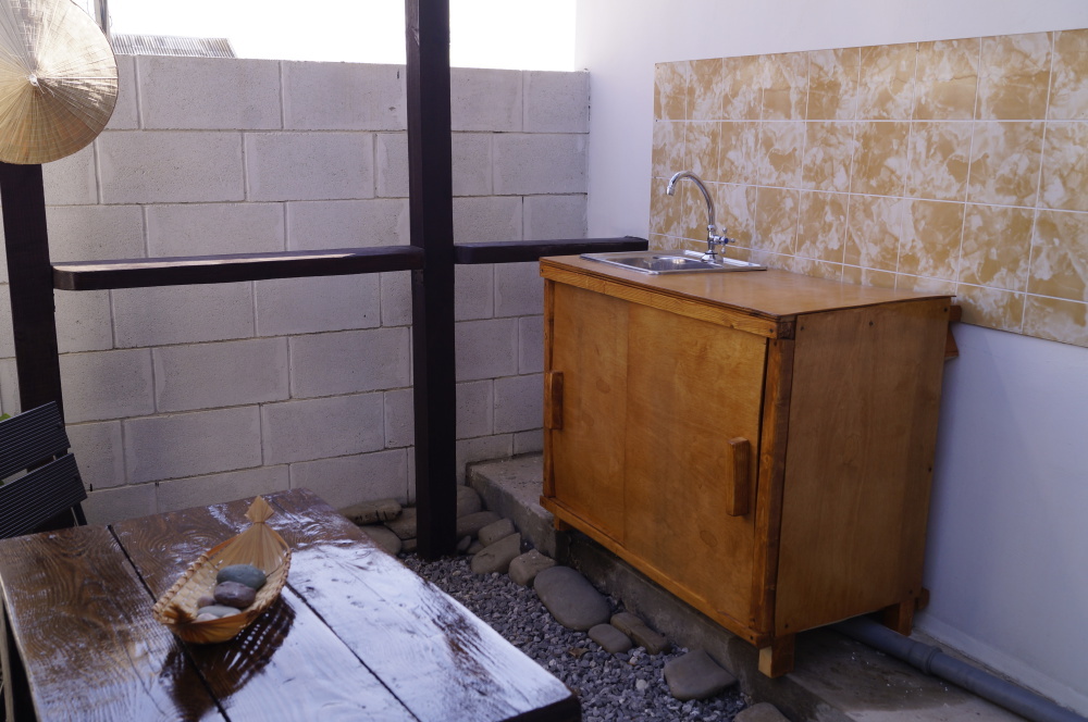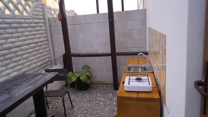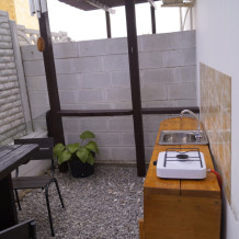 Трёхместный номер оснащённый личной кухней с газовой плитой, комплектом посуды и раковиной, патио и обеденной зоной.
