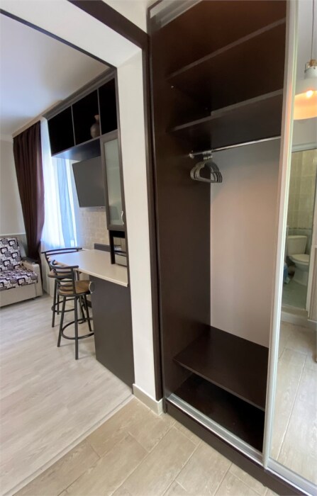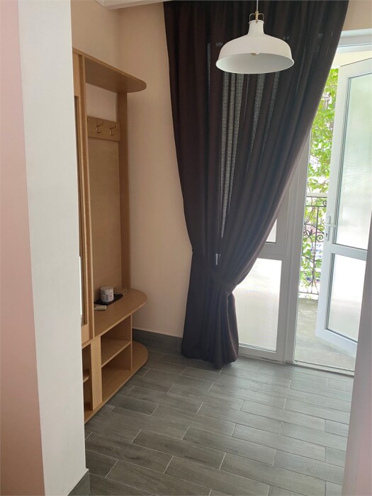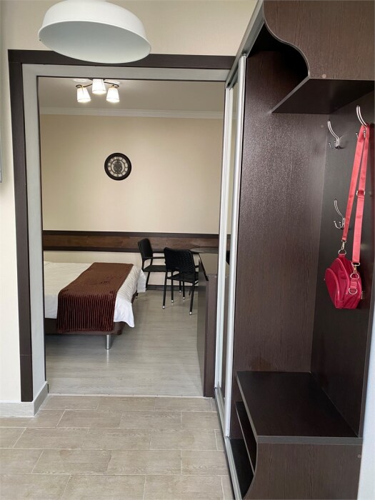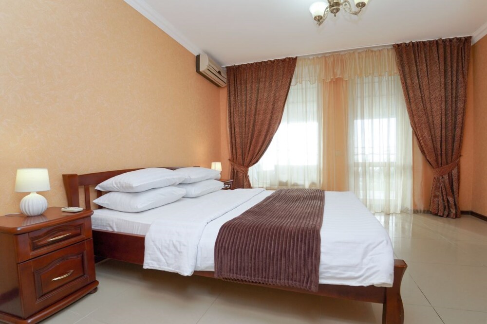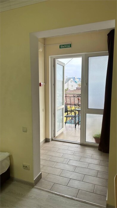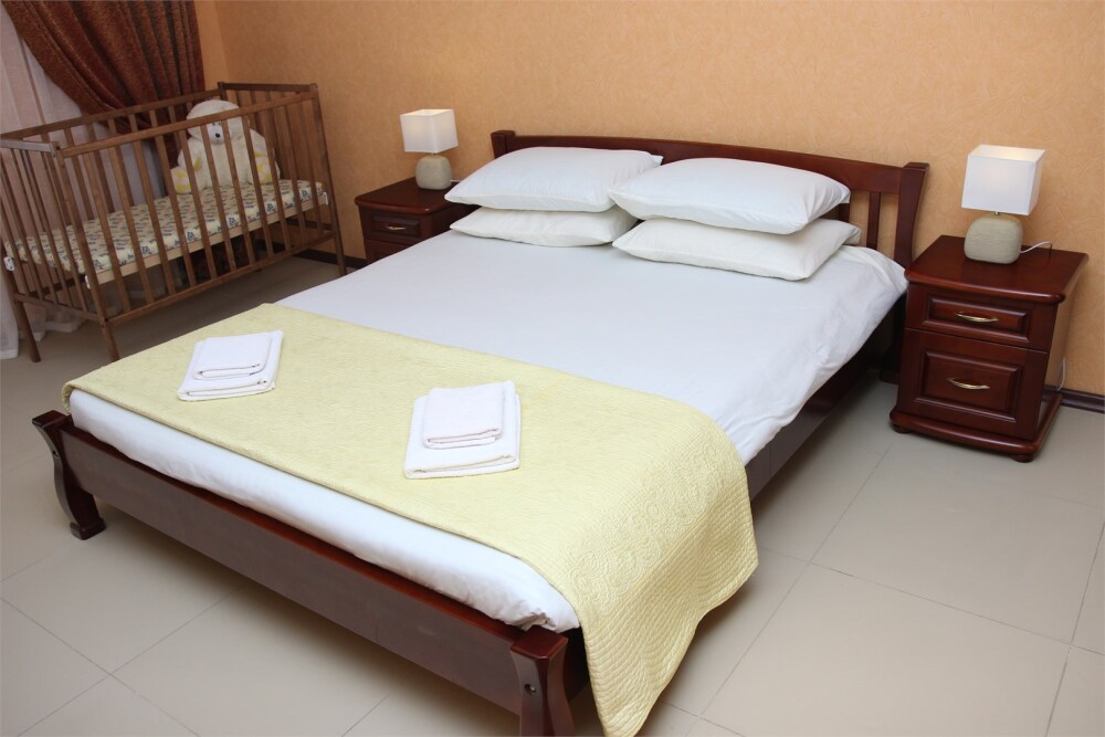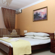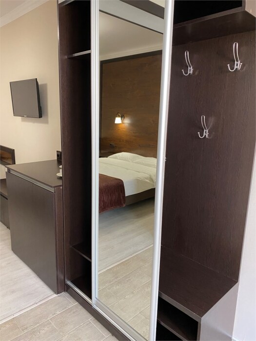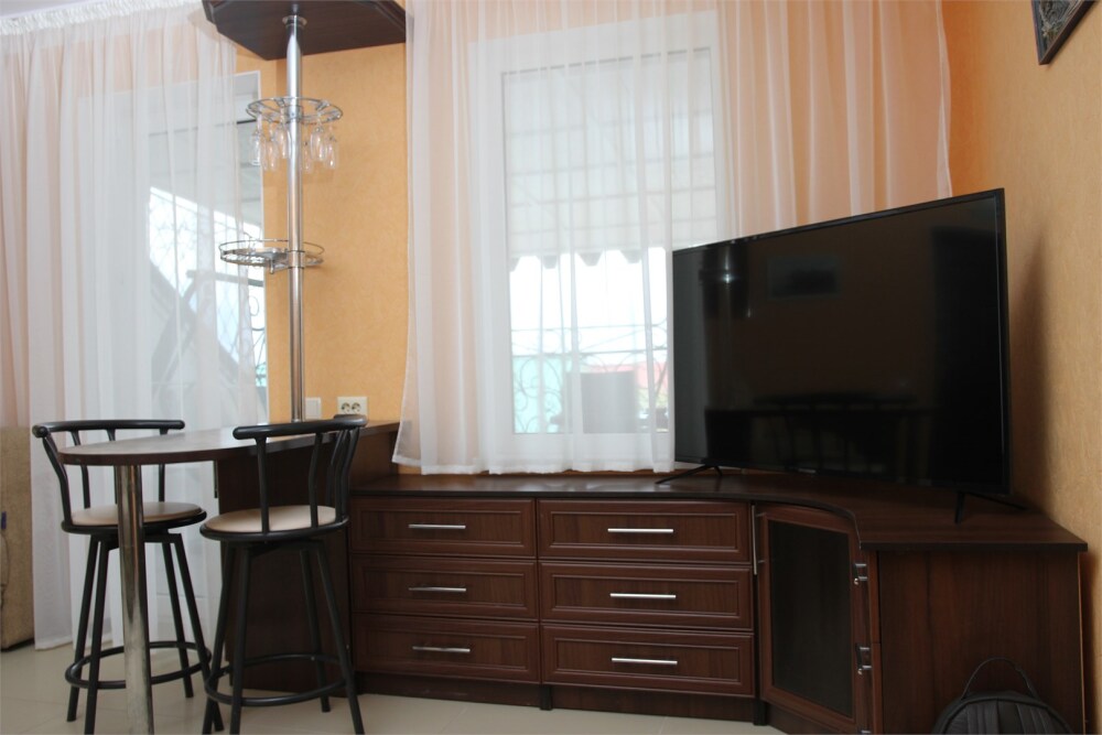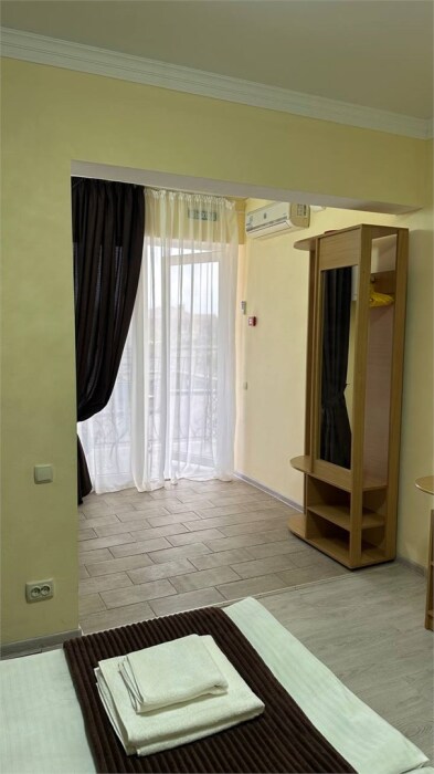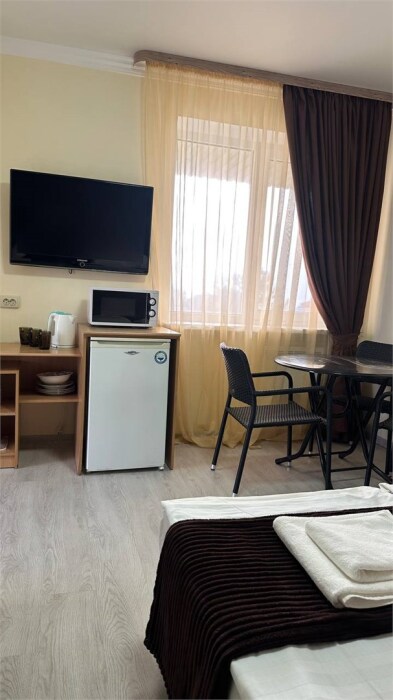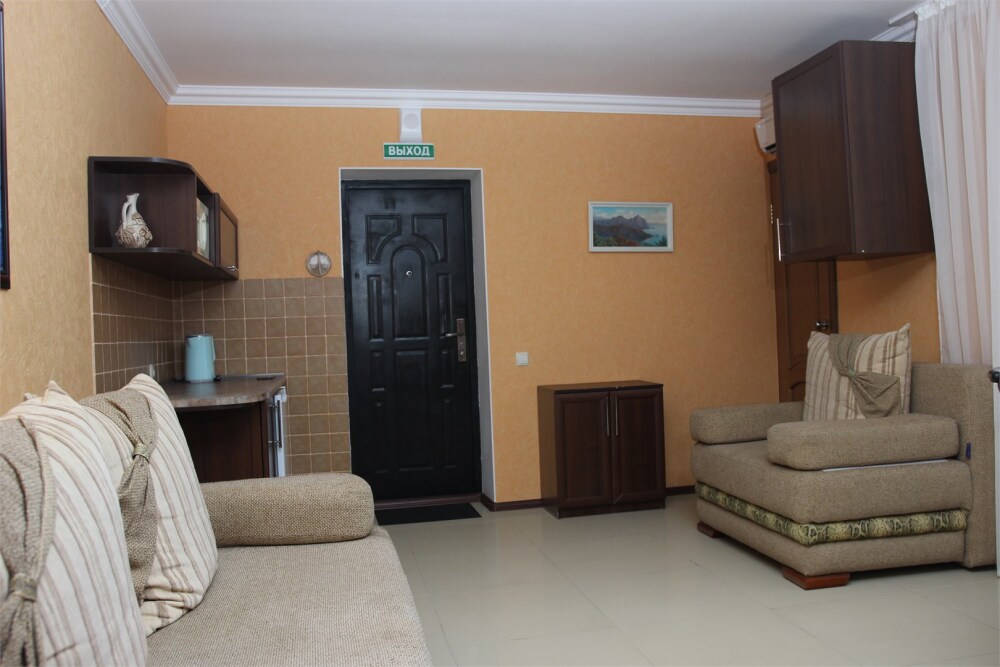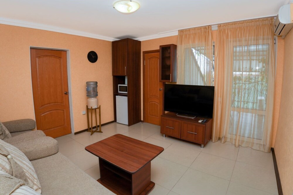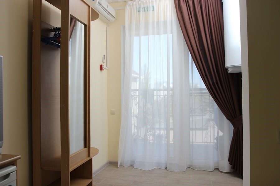 В номере отдельный балкон с ротанговой мебелью, вход в номер осуществляется с балкона. В номере: телевизор, холодильник, кондиционер, шкаф-купе, стол, стулья, чайник, печь свч, мини-кухня, куллер с водой, санузел, горячая/холодная вода круглосуточно, душ, тапочки. Смена полотенец и первая уборка номера происходят на 3-й день проживания. Смена постельного белья, полотенец и уборка происходят на 6й день проживания. Отопление: кондиционер и электробатарея. На кроватях ортопедические матрасы. Возможна трансформация двуспальной кровати в две односпальные. Полуторный диван.