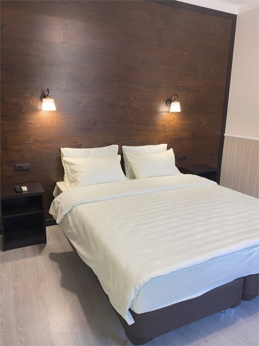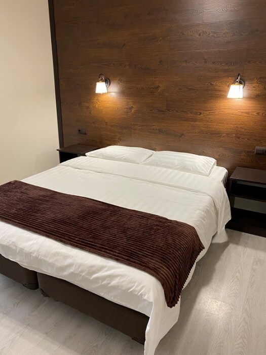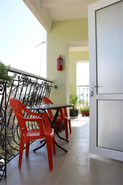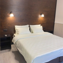 Номера находятся в мансарде здания. В номере отдельный балкон с ротанговой мебелью. В номере: телевизор, холодильник, кондиционер, шкаф, стол, стулья, чайник, санузел, горячая/холодная вода круглосуточно, душ. Смена полотенец и первая уборка номера происходят на 3й день проживания. Смена постельного белья, полотенец и уборка происходят на 6й день проживания. Отопление: кондиционер, электробатарея. На кроватях ортопедические матрасы. Возможна трансформация двуспальной кровати в две односпальные.