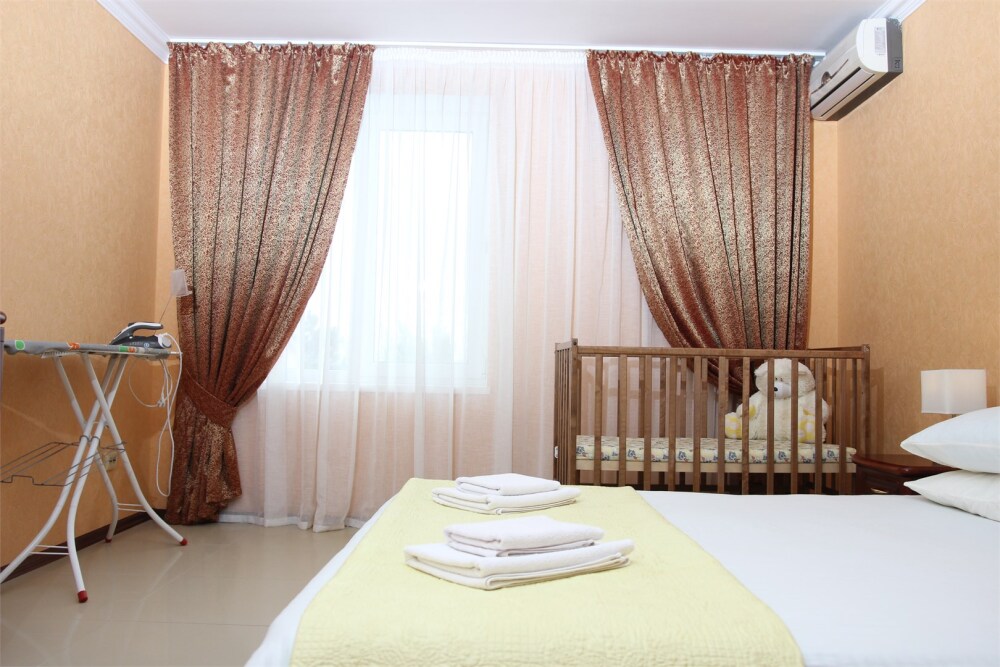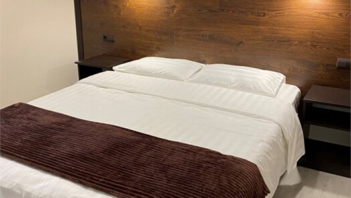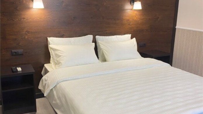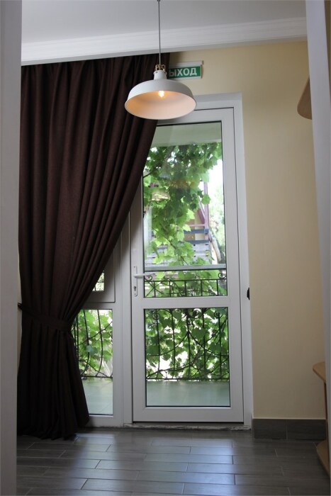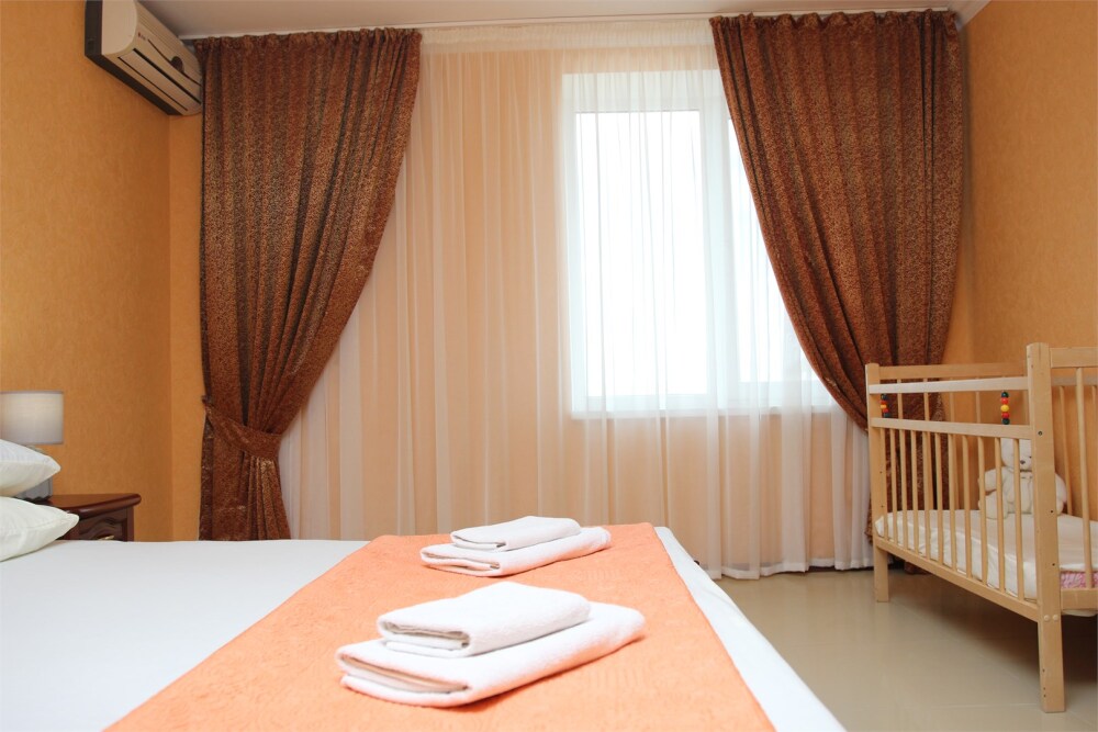 Вход в номер осуществляется с проходного балкона (у каждого гостя есть своя часть балкона для отдыха). В номере: телевизор, холодильник, кондиционер, шкаф-купе, стол, стулья, чайник, печь свч, санузел, горячая/холодная вода круглосуточно, душ, тапочки. Смена полотенец и первая уборка номера происходят на 3й день проживания. Смена постельного белья, полотенец и уборка происходят на 6й день проживания. Отопление: кондиционер + электробатарея. На кроватях ортопедические матрасы. Возможна трансформация двуспальной кровати в две односпальные.