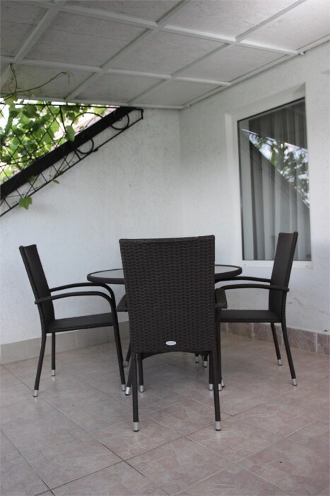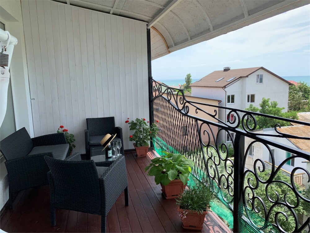 Номер находятся в мансарде здания. В номере просторная гостиная, комфортная спальня, балкон с обеденной мебелью. Видовая терраса с ротанговой мебелью и садовой качелью. В гостиной диван трансформируется в спальное место для двоих гостей. В номере: телевизор, холодильник, кондиционер, шкаф-купе, стол, чайник, посуда, столовые приборы, печь свч, мини-кухня, куллер с водой, санузел, горячая/холодная вода круглосуточно, душ, халаты, тапочки. Отопление: кондиционер, электробатарея. На кроватях ортопедические матрасы.