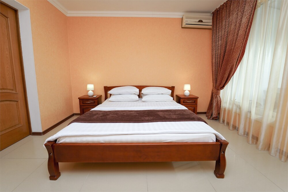 Вход в номер осуществляется с проходного балкона (у каждого гостя есть своя часть балкона для отдыха). В номере: телевизор, холодильник, кондиционер, шкаф-купе, стол, стулья, чайник, печь свч, санузел, горячая/холодная вода круглосуточно, душ. Смена полотенец и первая уборка номера происходят на 3й день проживания. Смена постельного белья, полотенец и уборка происходят на 6й день проживания. Отопление: кондиционер, электробатарея. На кроватях ортопедические матрасы. Возможна трансформация двуспальной кровати в две односпальные.