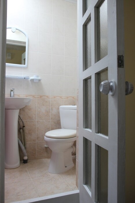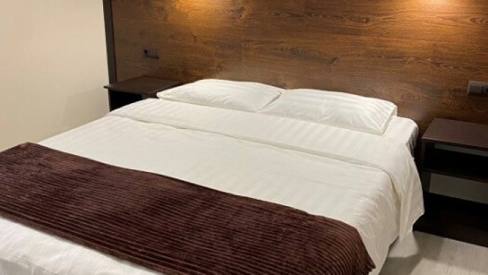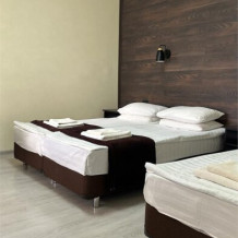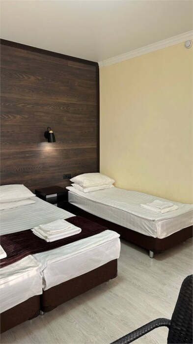 Номера находятся на 1 и 2 этажах. Вход в номер осуществляется с проходного балкона (у каждого гостя есть своя часть балкона для отдыха). В номере: телевизор, холодильник, кондиционер, шкаф, стол, стулья, чайник, санузел, горячая/холодная вода круглосуточно, душ. Смена полотенец и первая уборка номера происходят на 3-й день проживания. Смена постельного белья, полотенец и уборка происходят на 6й день проживания. Отопление: кондиционер и электробатарея. На кроватях ортопедические матрасы. Возможна трансформация двуспальной кровати в две односпальные.