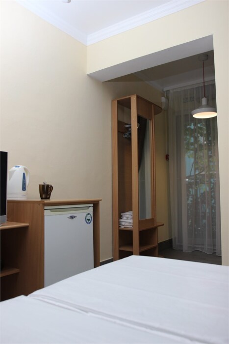 Вход в номер осуществляется с проходного балкона (у каждого гостя есть своя часть балкона для отдыха). В номере: телевизор, холодильник, кондиционер, шкаф, стол, стулья, чайник, санузел, горячая/холодная вода круглосуточно, душ. Смена полотенец и первая уборка номера происходят на 3й день проживания. Смена постельного белья, полотенец и уборка происходят на 6й день проживания. Отопление: кондиционер, электробатарея. На кроватях ортопедические матрасы. Возможна трансформация двуспальной кровати в две односпальные.