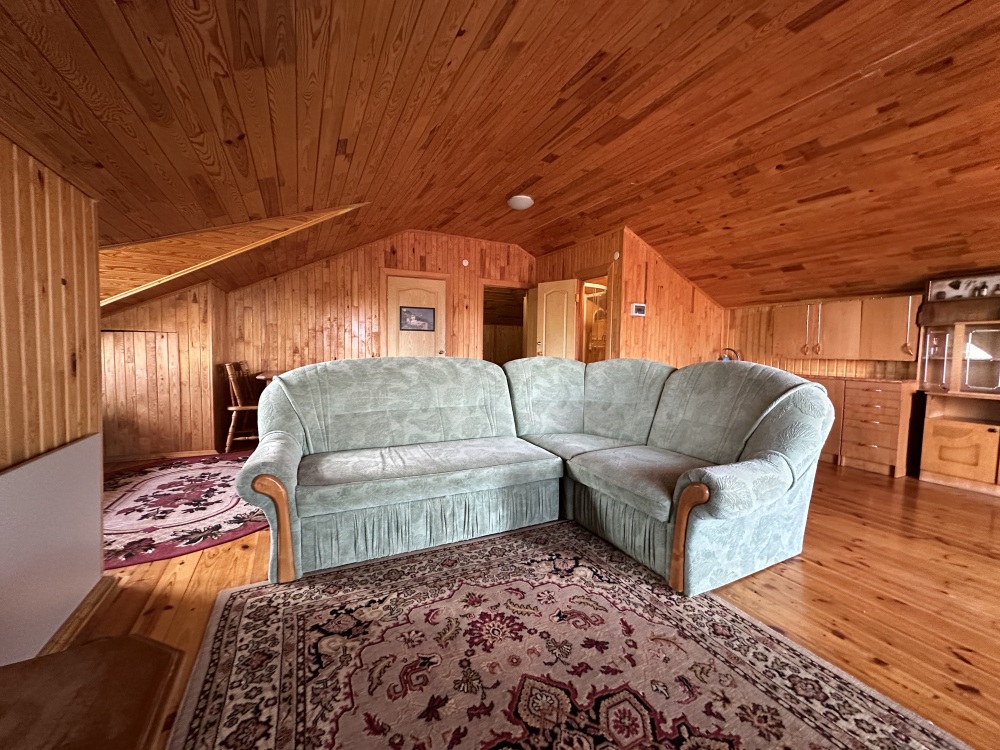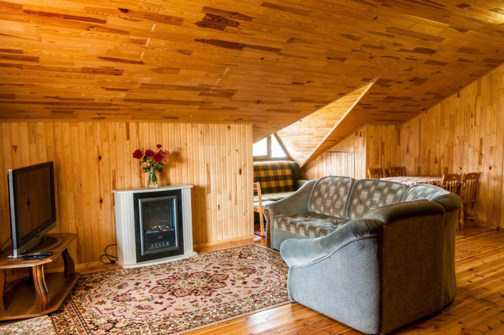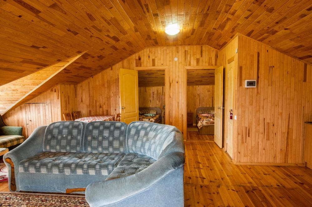 Трехкомнатный семейный номер находится на третьем этаже (мансардный). В номере две спальни с двуспальными кроватями и большой зал. В зале раскладной диван двухместный, мягкий уголок, камин, обеденный стол, небольшой кухонный уголок с раковиной, чайником и микроволновкой. Также в номере есть кондиционер, холодильник, телевизор и электро обогреватели. Перед номером небольшая терраса со столом и стульями.