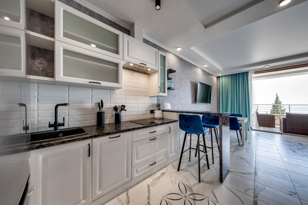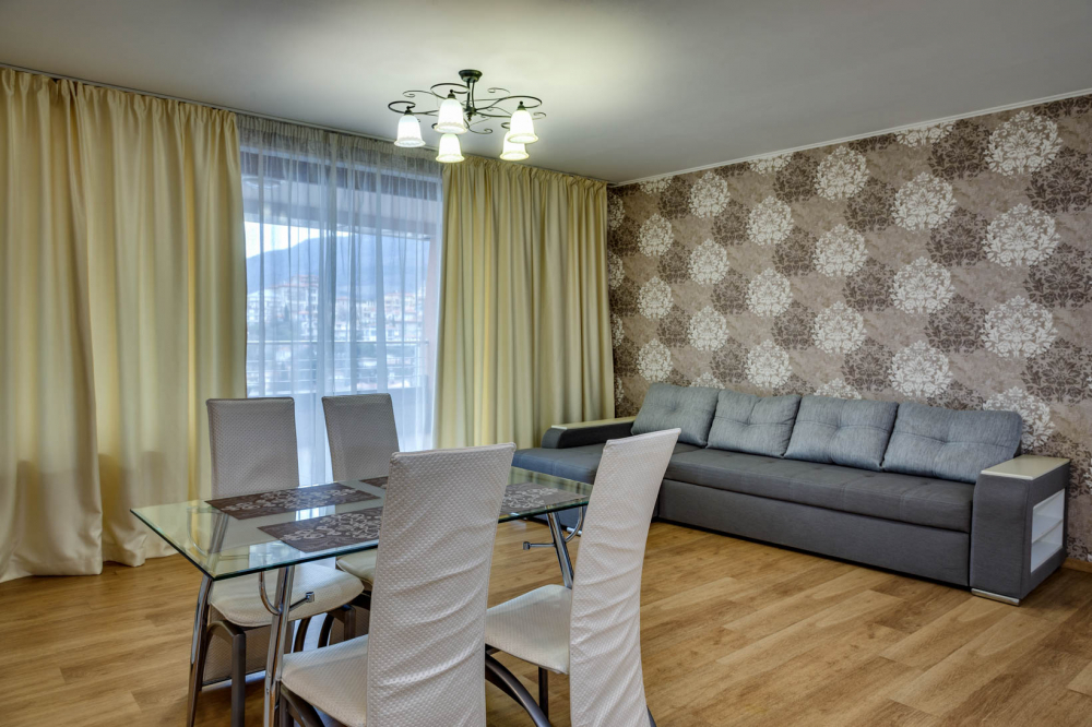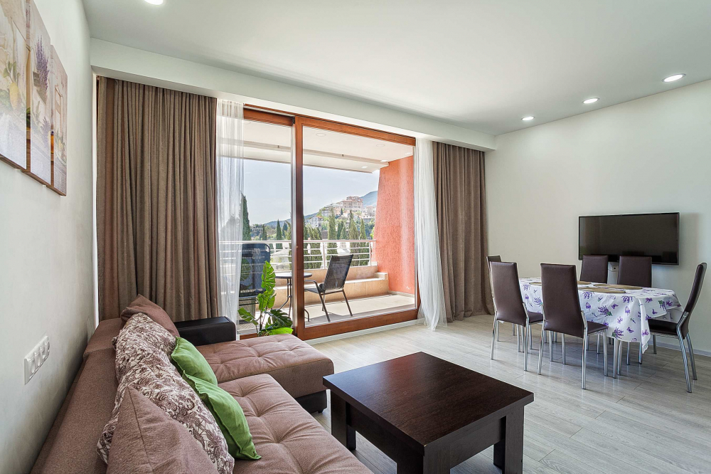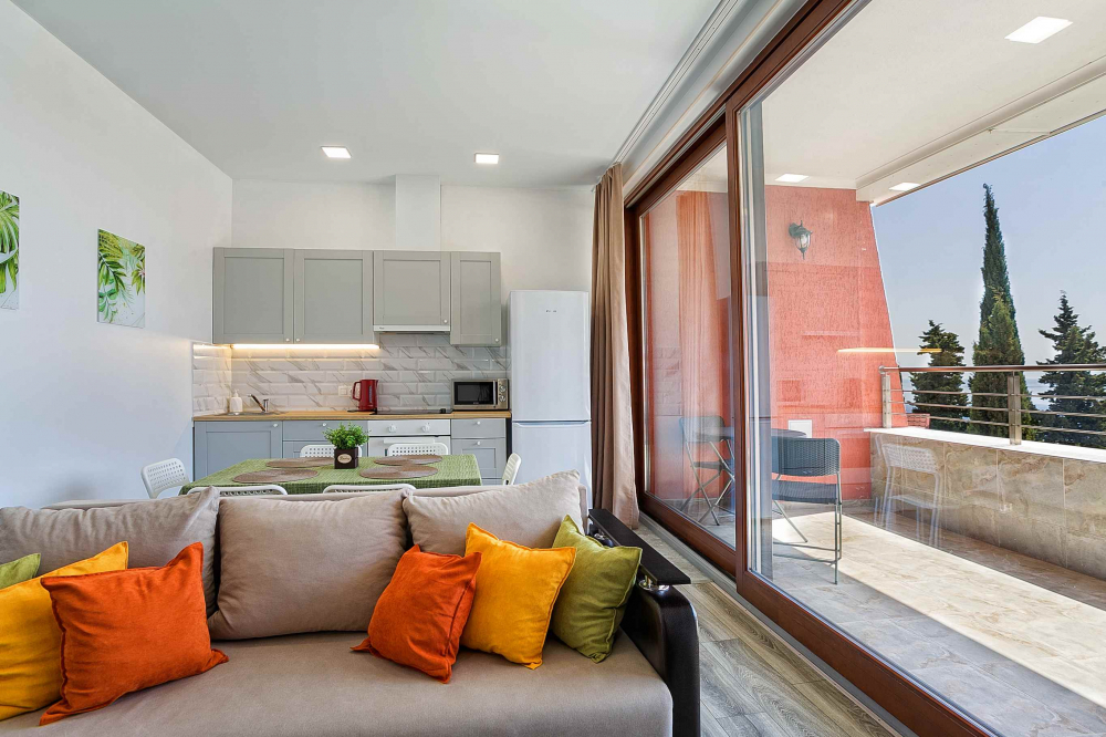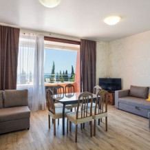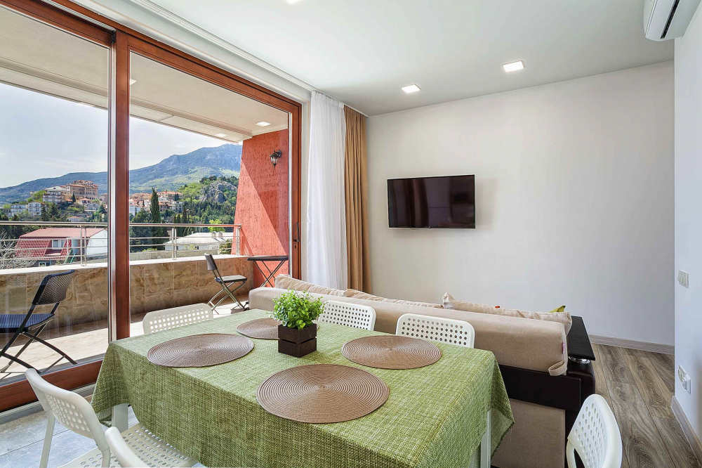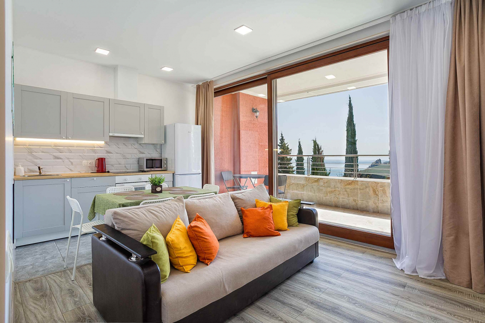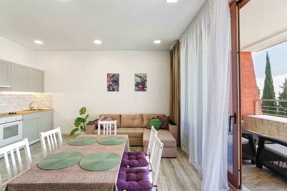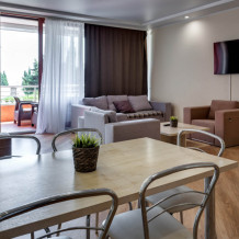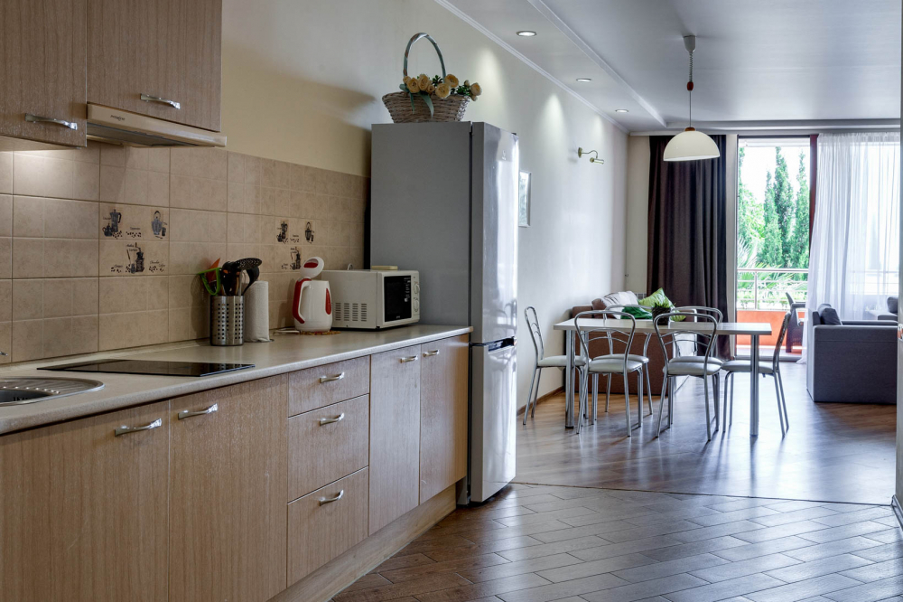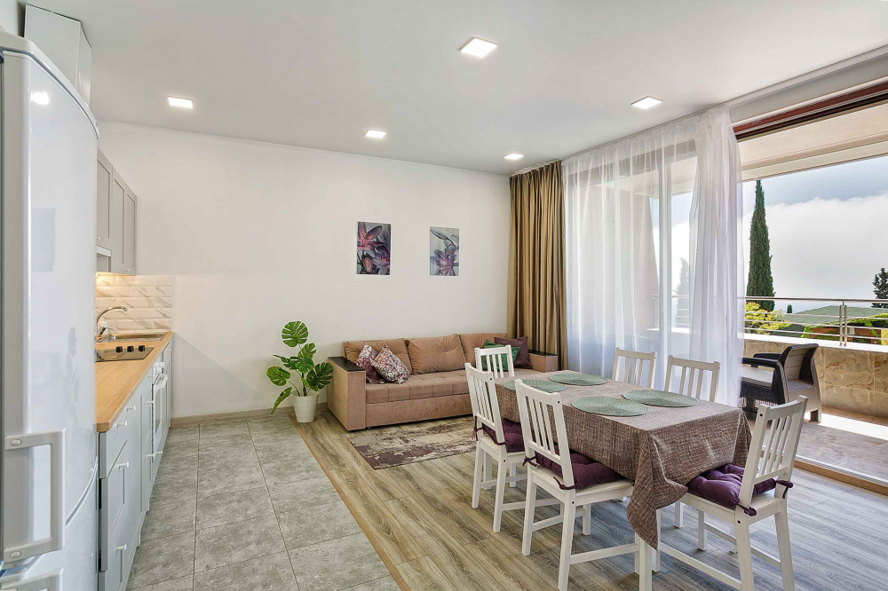 Все апартаменты укомплектованы современной бытовой техникой. В каждых апартаментах имеются постельные принадлежности - белье и полотенца, а так же необходимый набор кухонных принадлежностей и посуды. Комплектация апартаментов отвечает самым высоким требованиям. Из всех апартаментов открывается незабываемый вид на море и горы.
