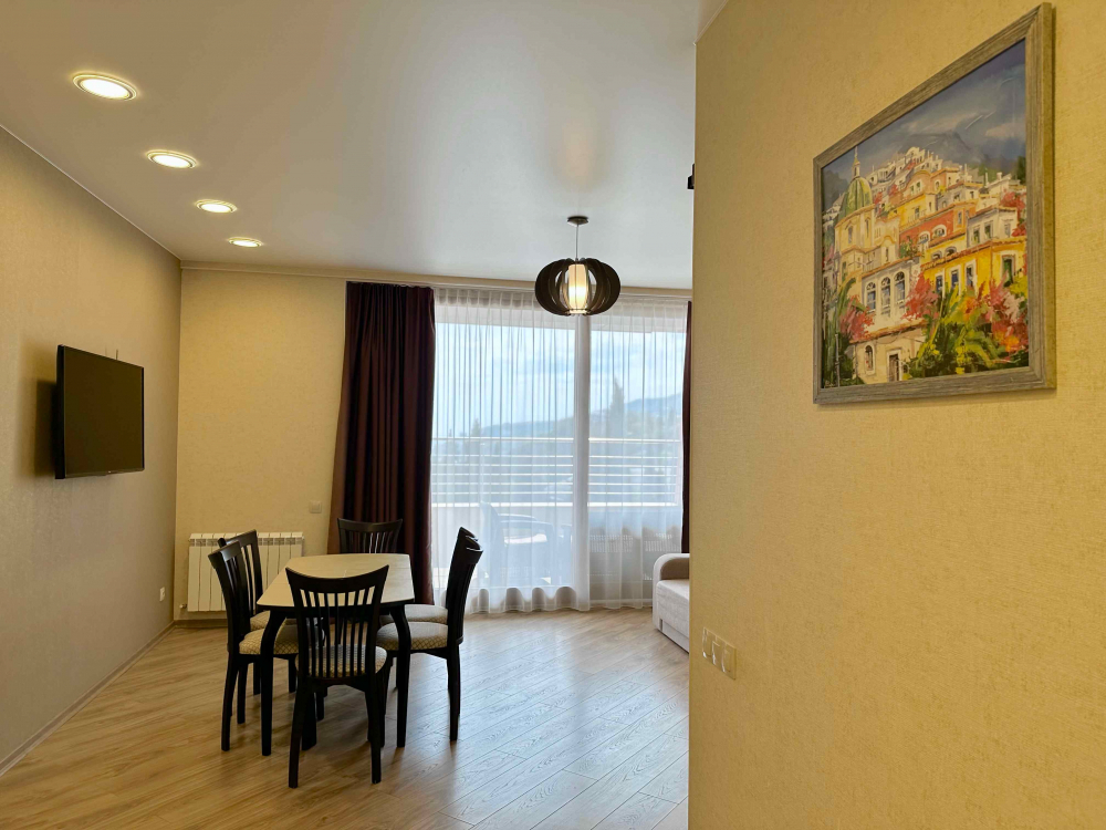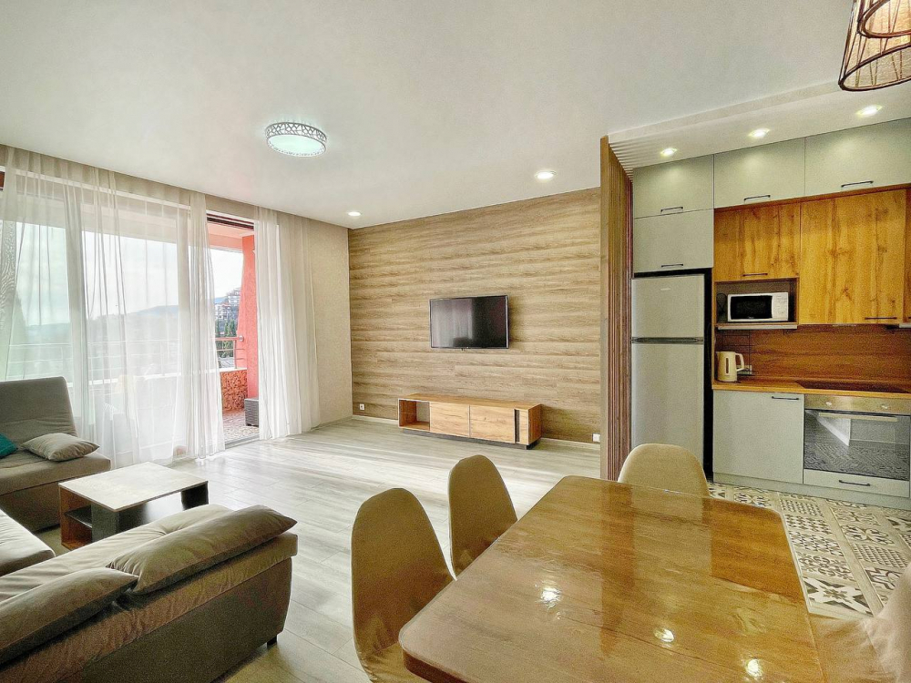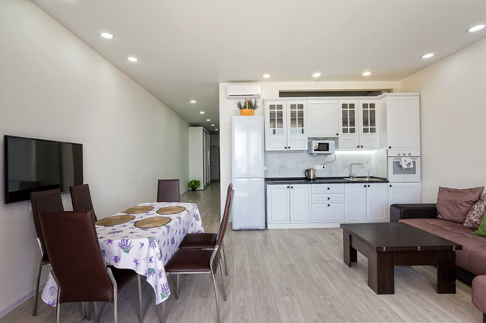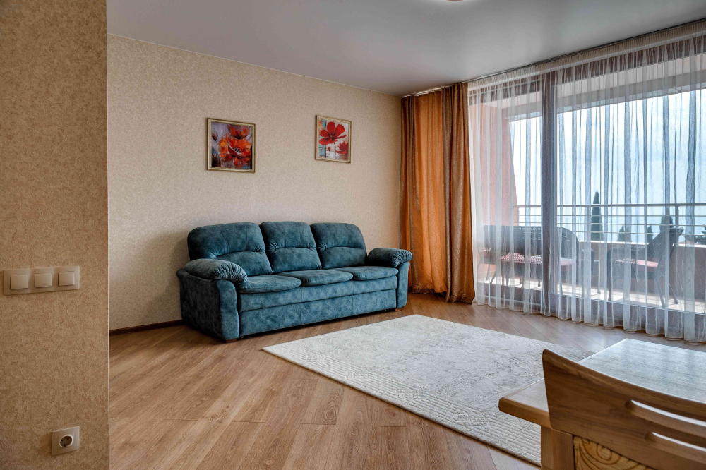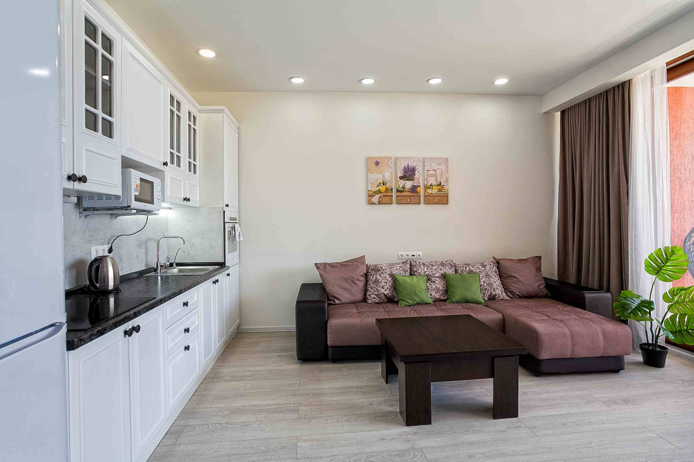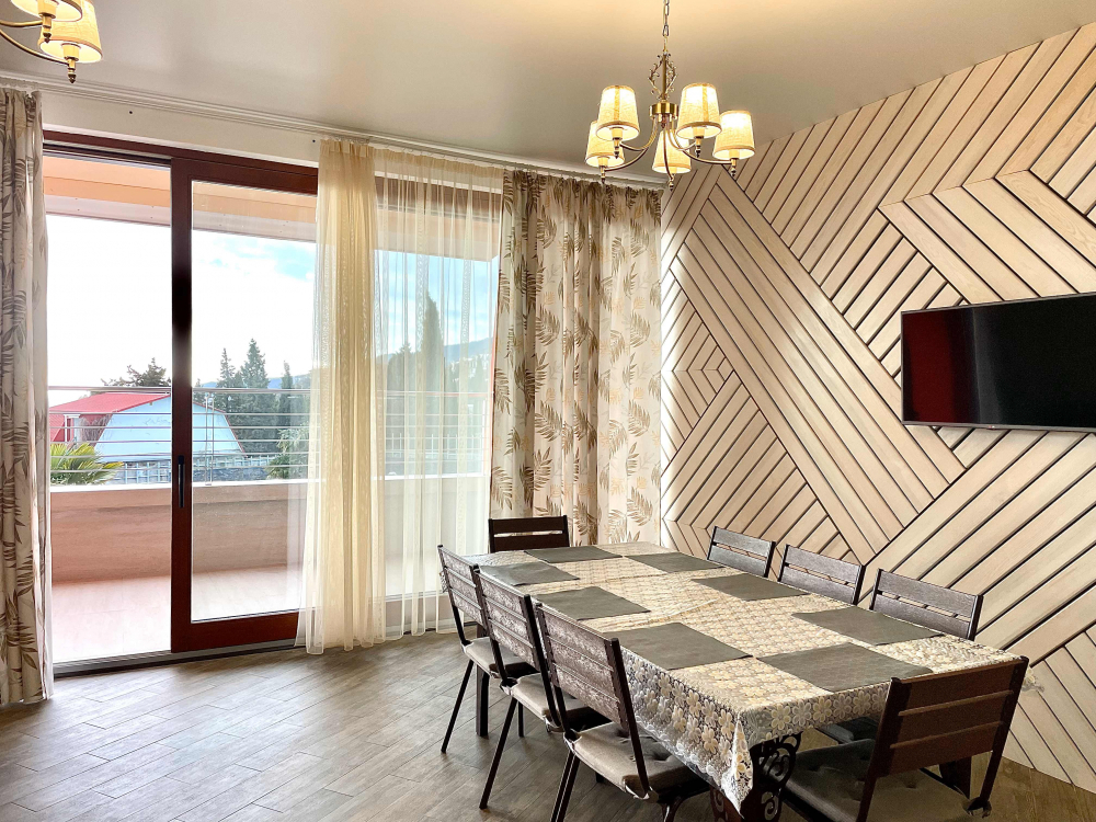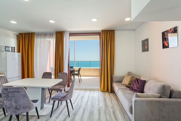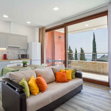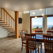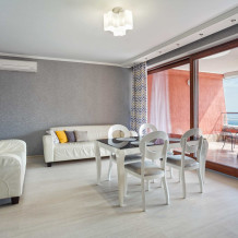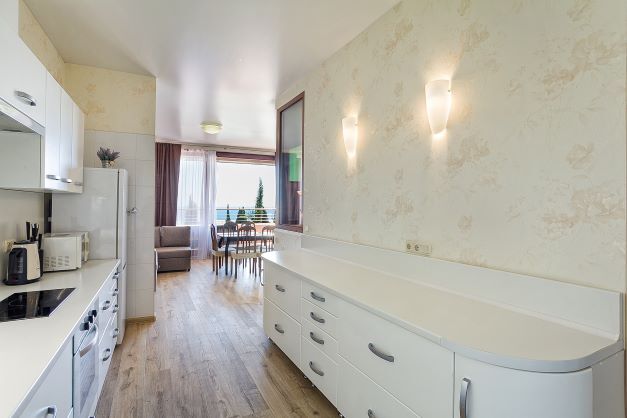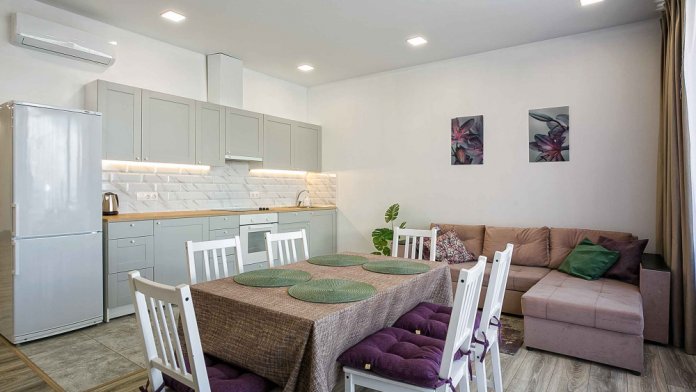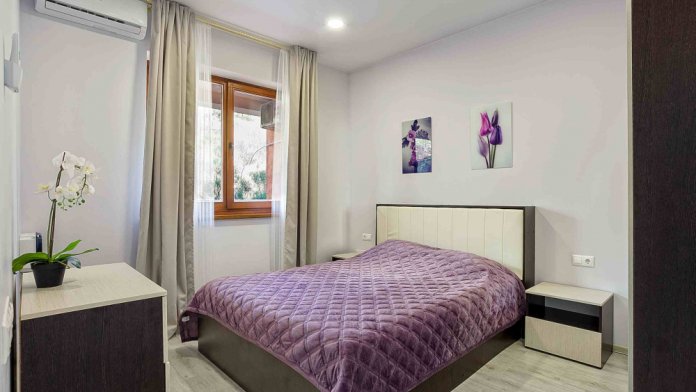 Все апартаменты укомплектованы современной бытовой техникой. В каждых апартаментах имеются постельные принадлежности - белье и полотенца, а так же необходимый набор кухонных принадлежностей и посуды. Комплектация апартаментов отвечает самым высоким требованиям. Из всех апартаментов открывается незабываемый вид на море и горы.