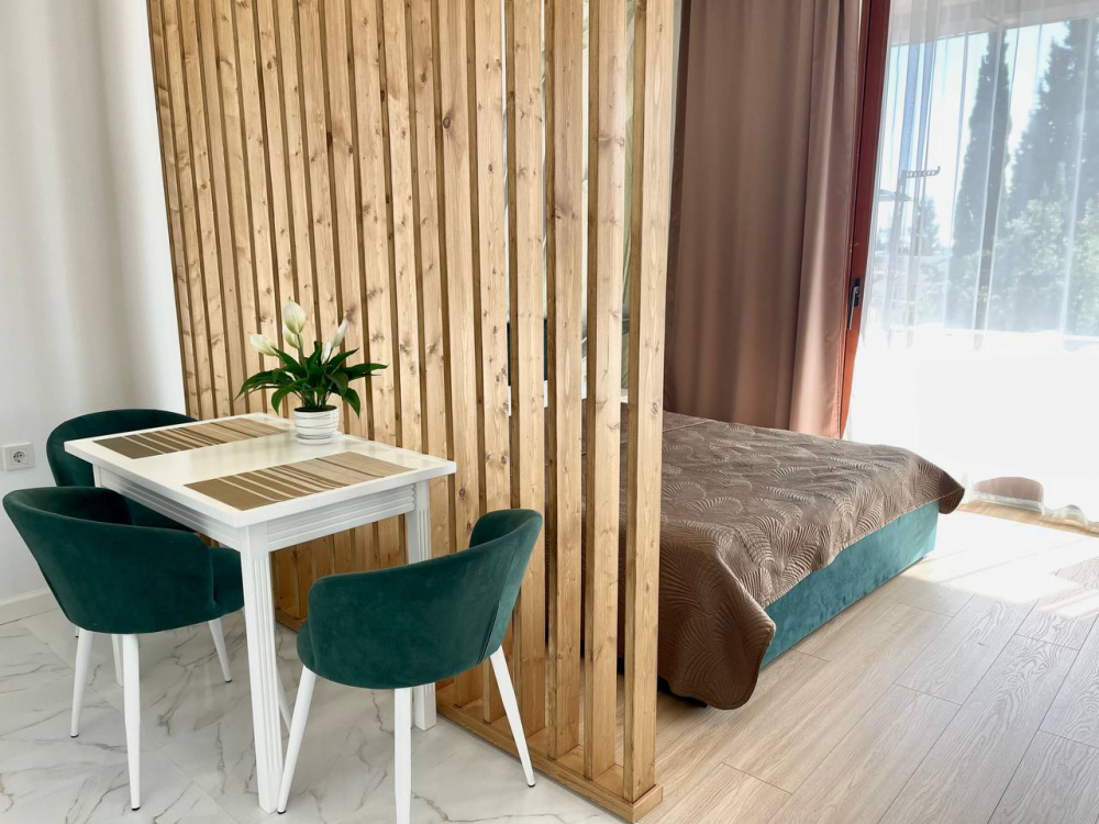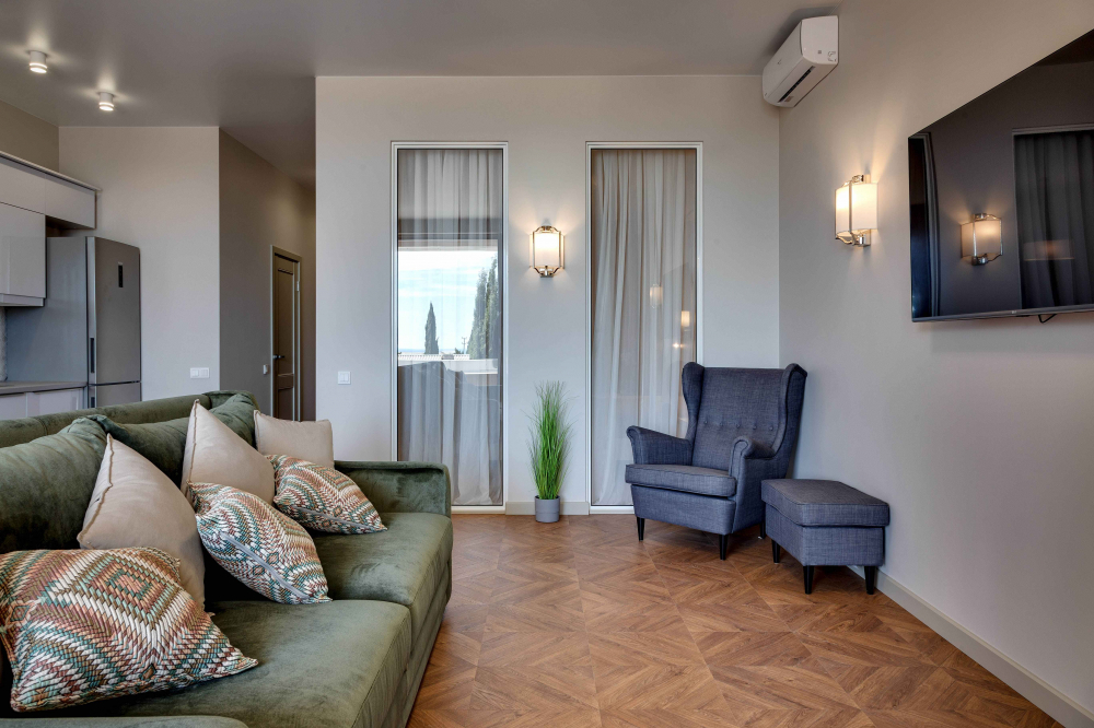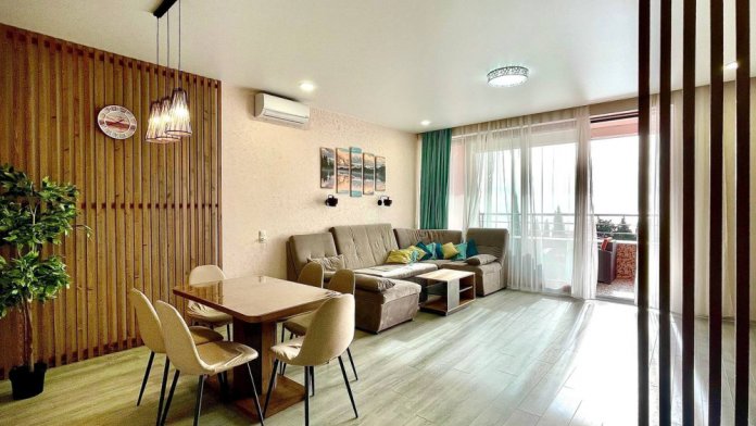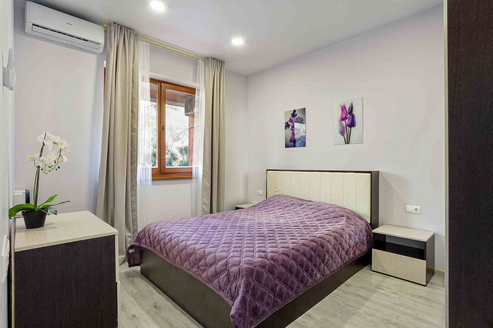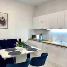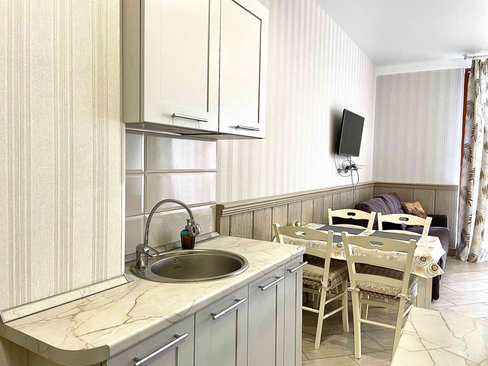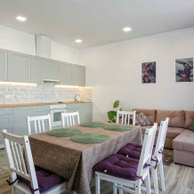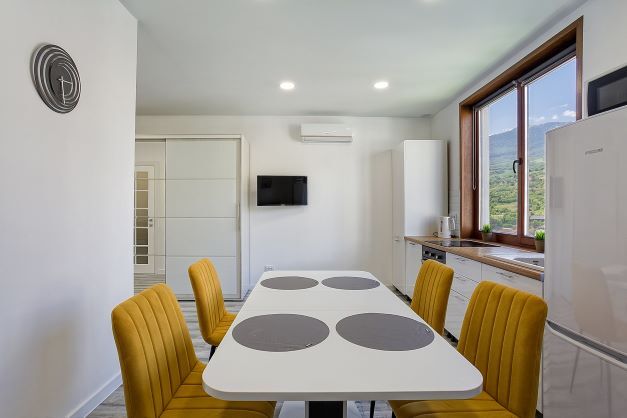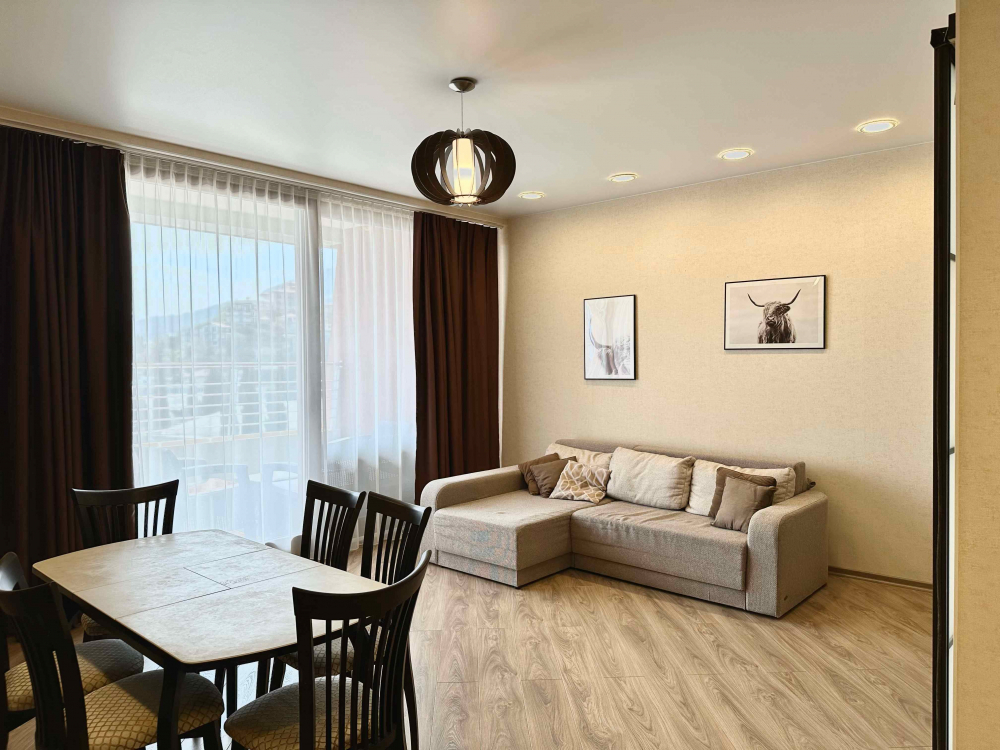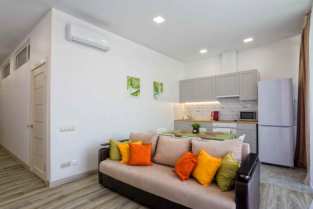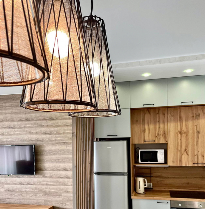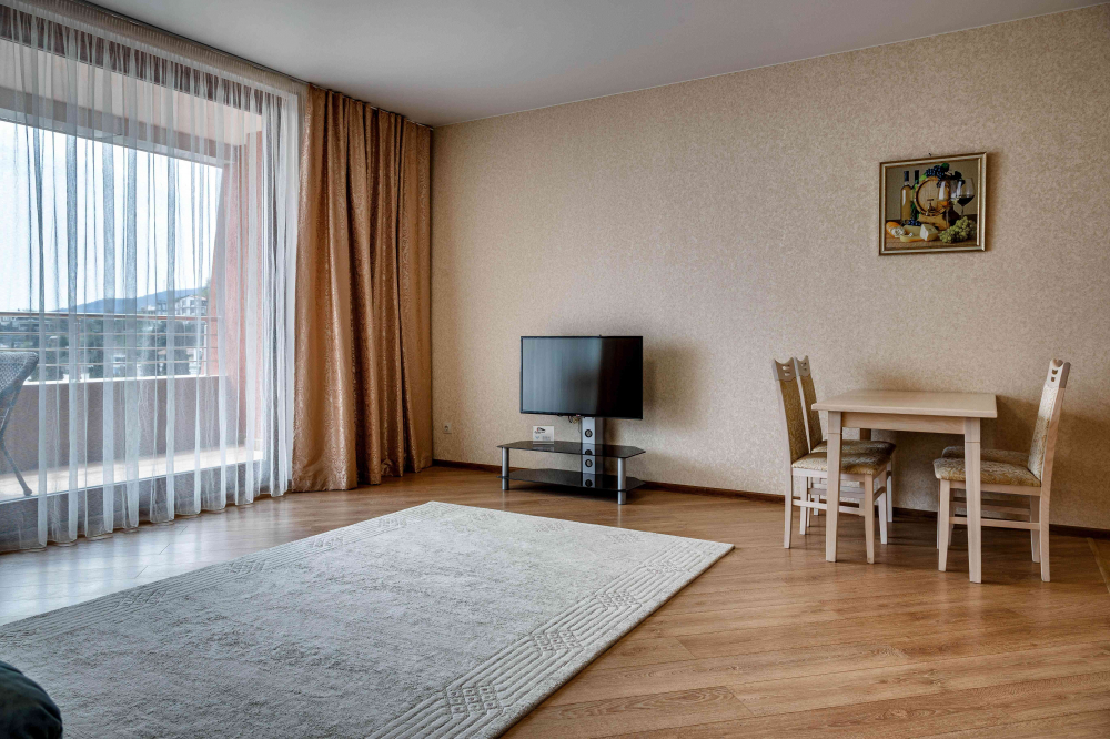 Все апартаменты укомплектованы современной бытовой техникой. В каждых апартаментах имеются постельные принадлежности - белье и полотенца, а так же необходимый набор кухонных принадлежностей и посуды. Комплектация апартаментов отвечает самым высоким требованиям. Из всех апартаментов открывается незабываемый вид на море и горы.