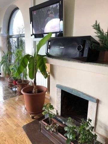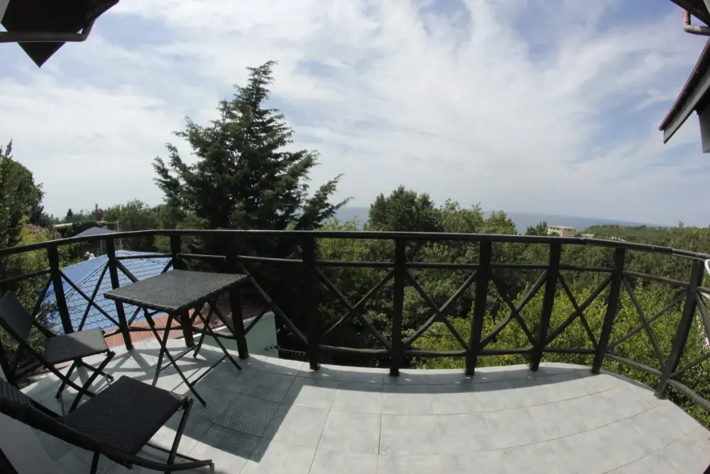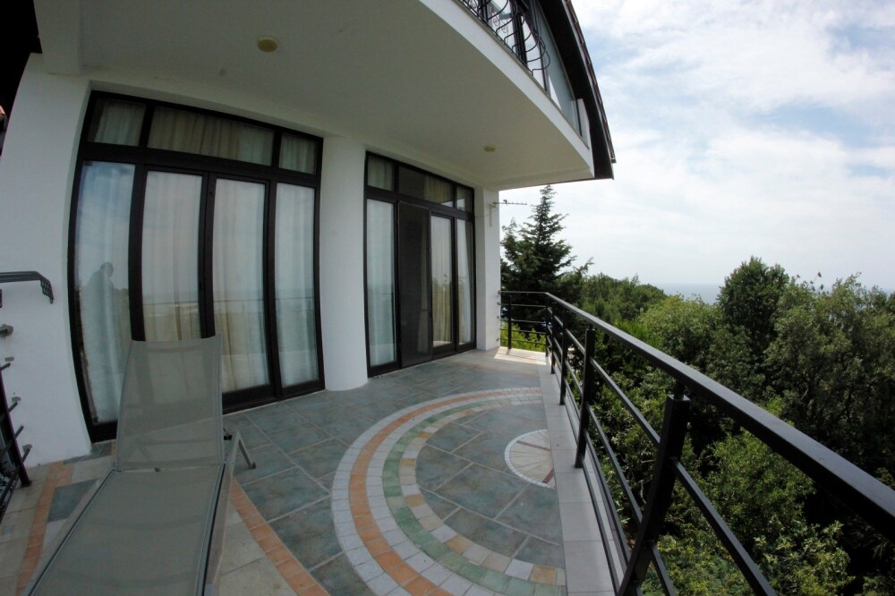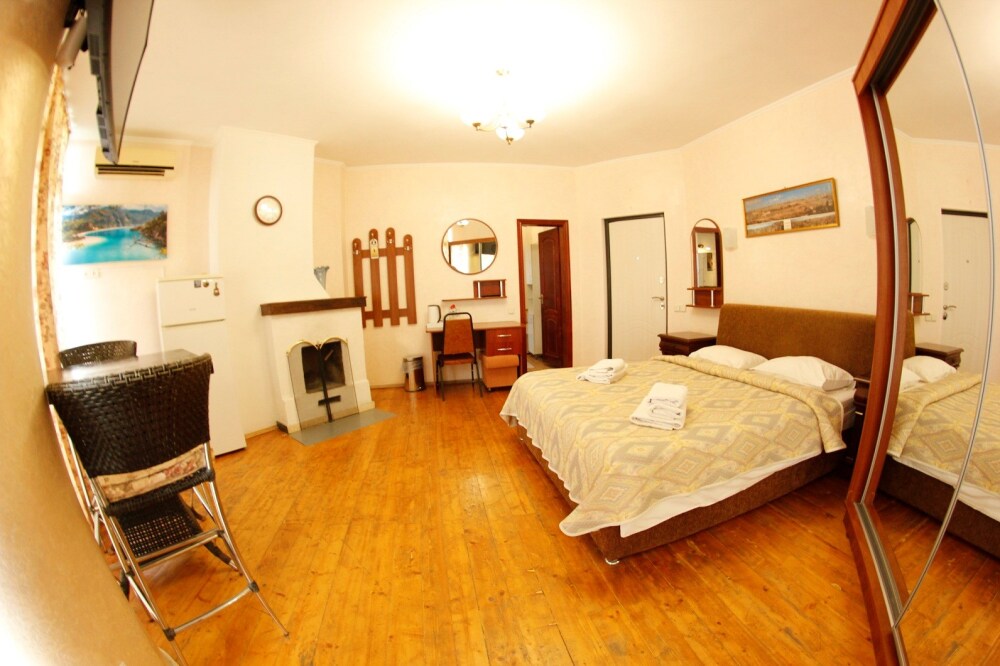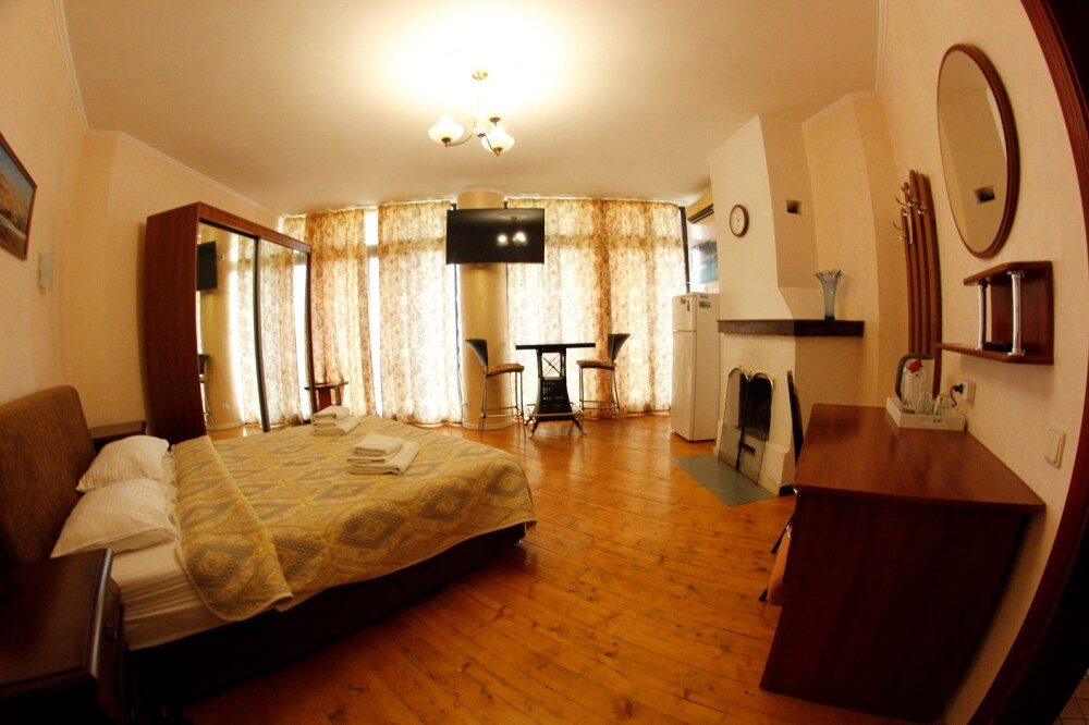 Уютный семейный номер с камином и огромным балконом с видом на море и горы.