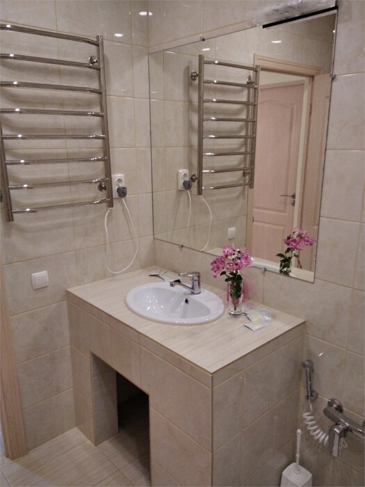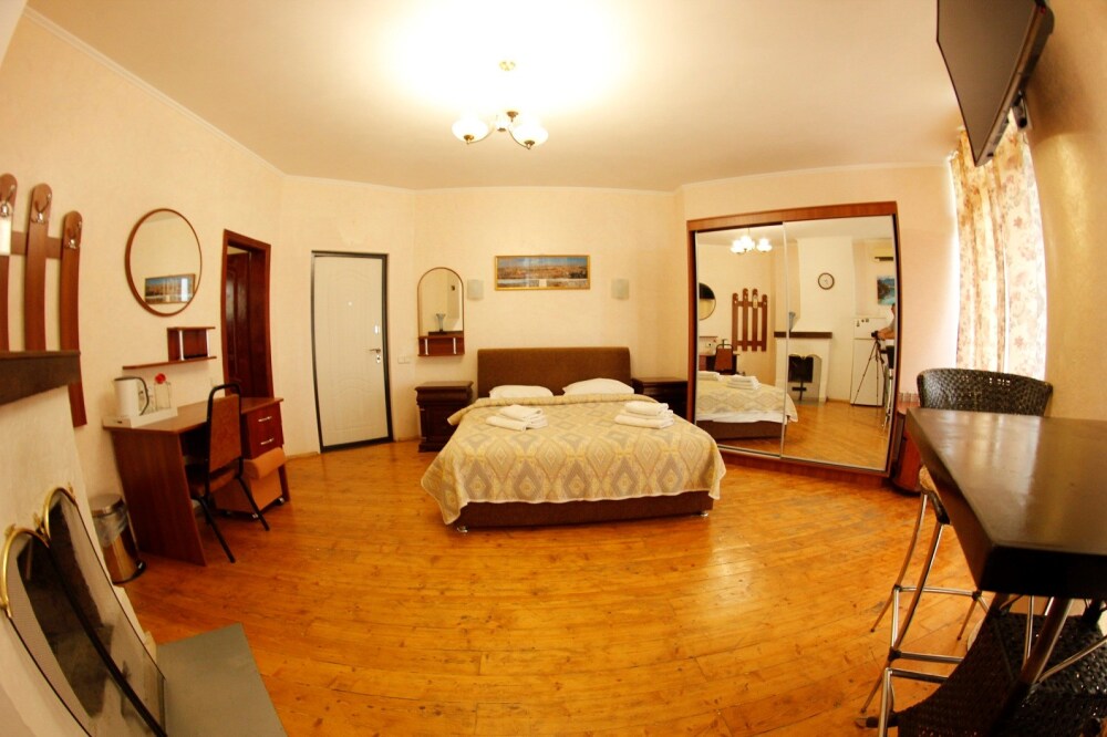 Индивидуальной особенностью данного номера является его планировка, благодаря декоративной перегородки площадь номера делится на две части и визуально получается как бы две комнаты.