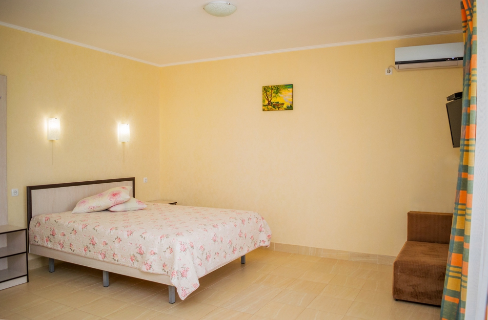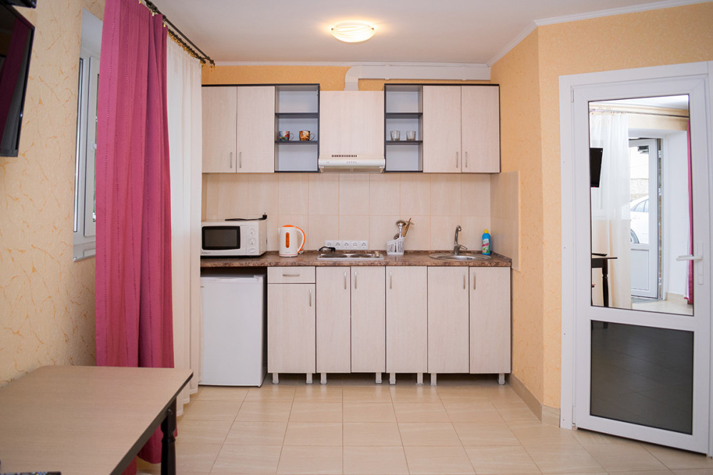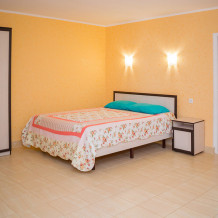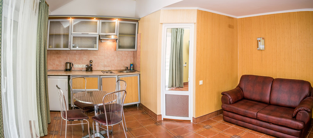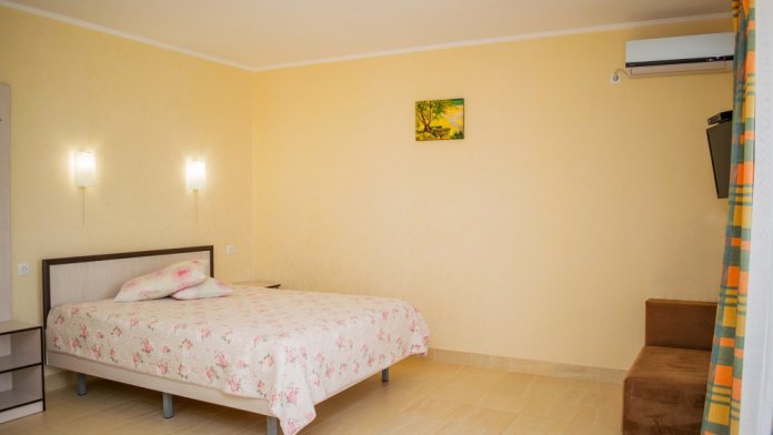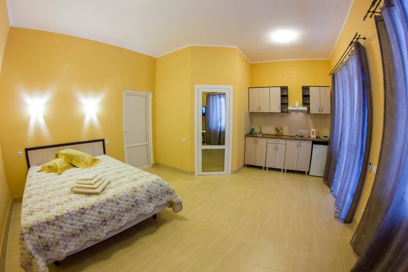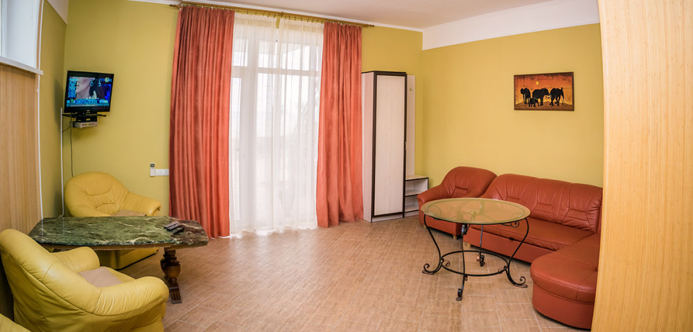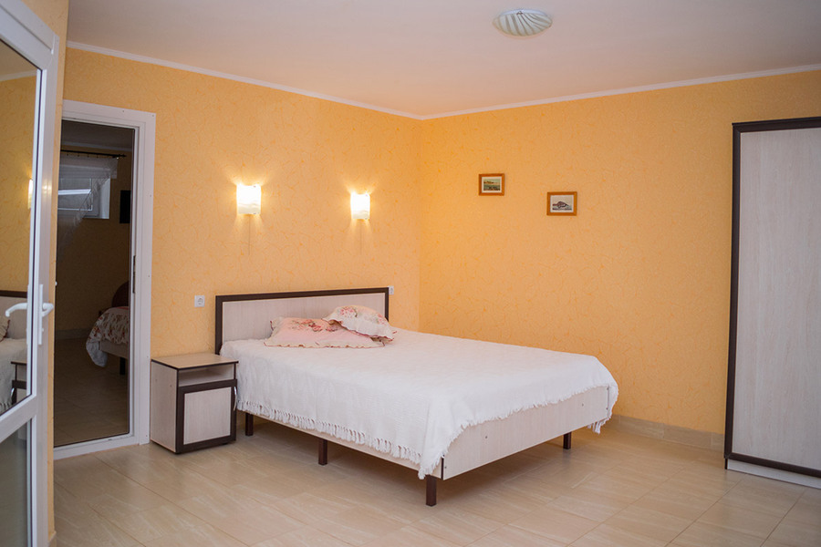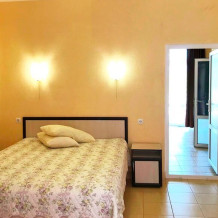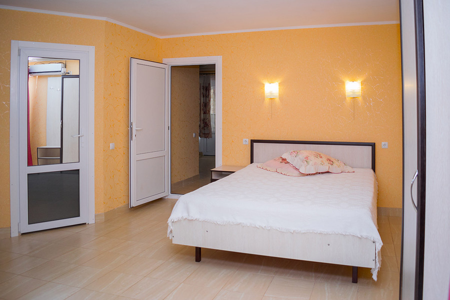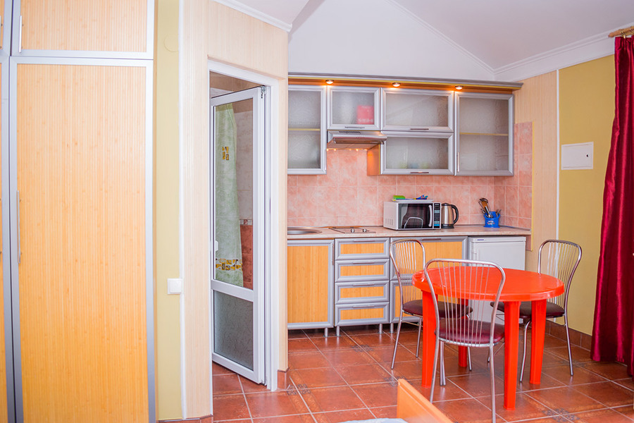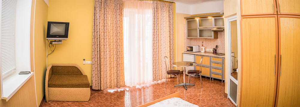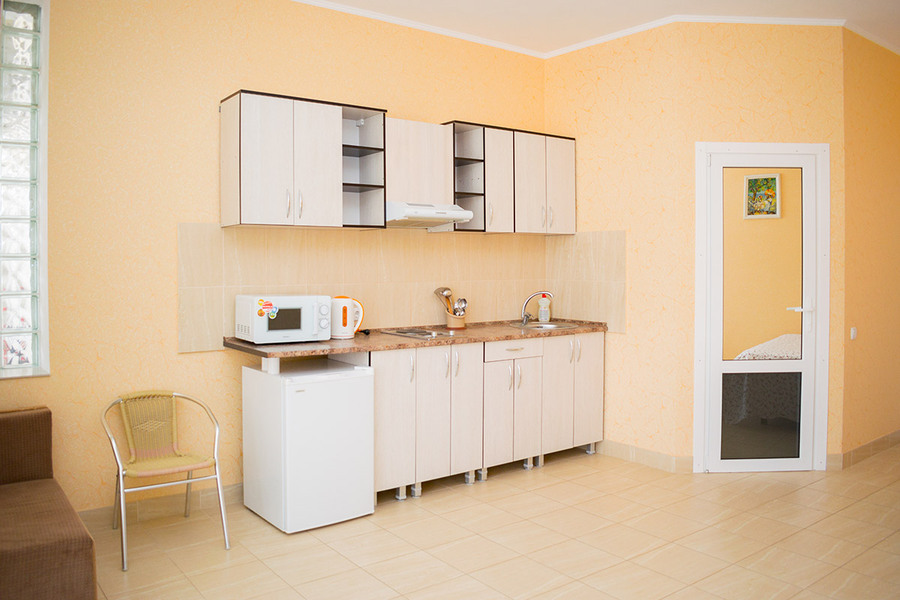 Оснащение: двуспальная кровать 160х200 в каждом номере; прикроватные тумбочки; удобный угловой диван; столики; телевизор; кондиционер; платяной шкаф; кухня (с холодильником, плиткой, электрическим чайником и микроволновой печью); санузел с душем в каждой комнате; отдельный выход из каждой комнаты.