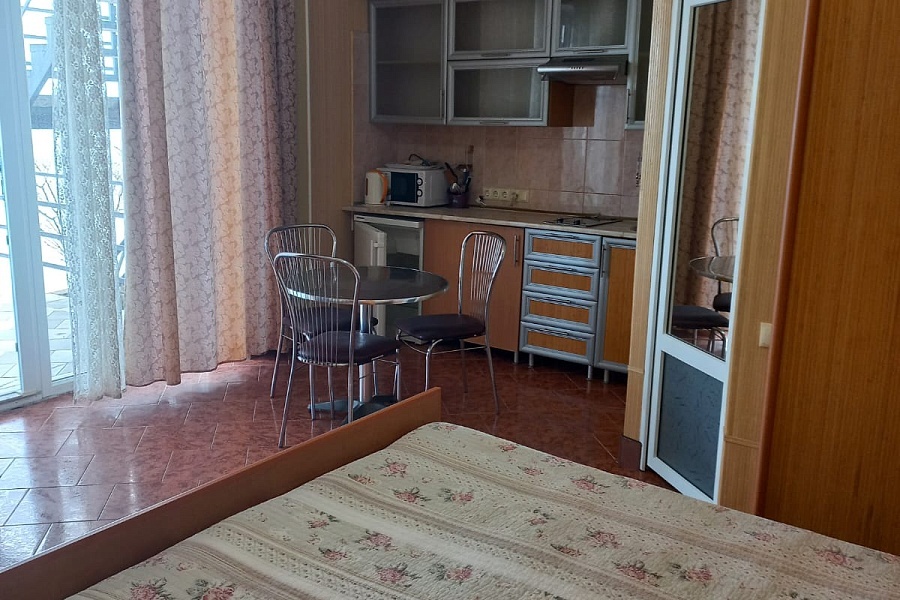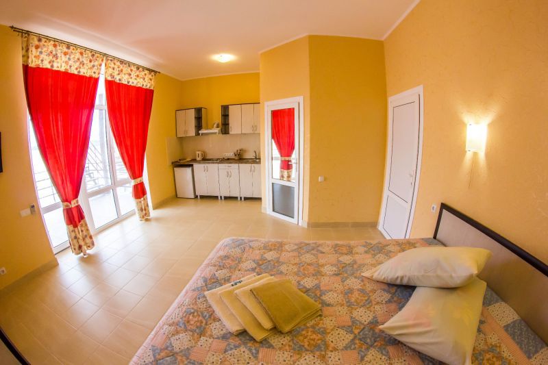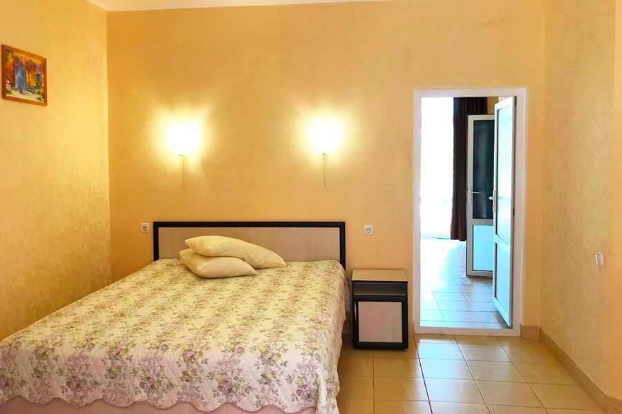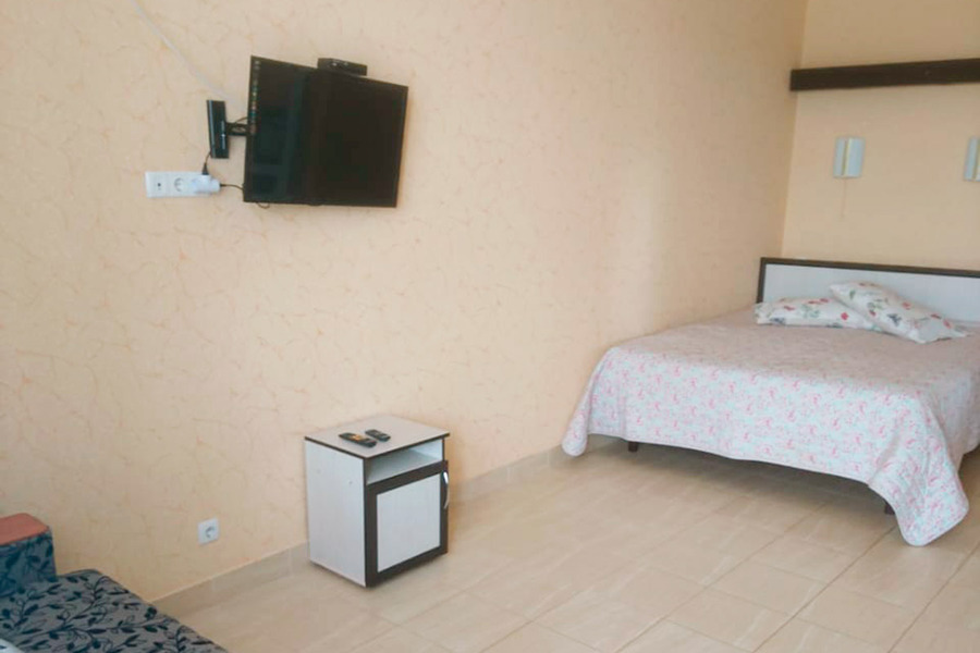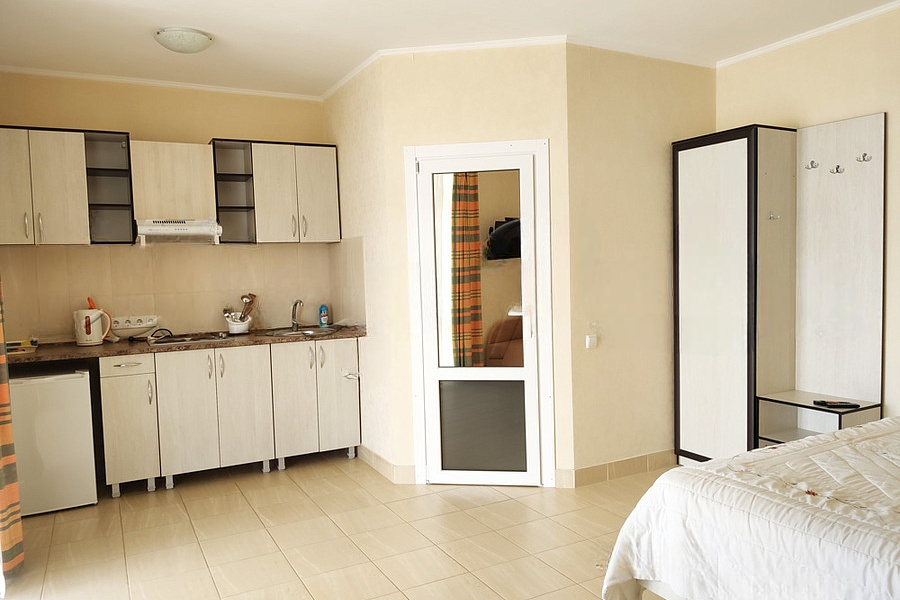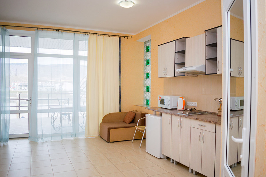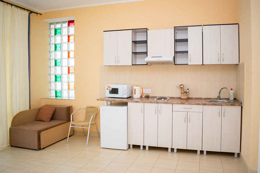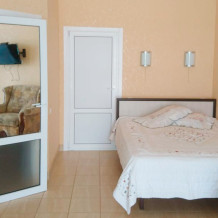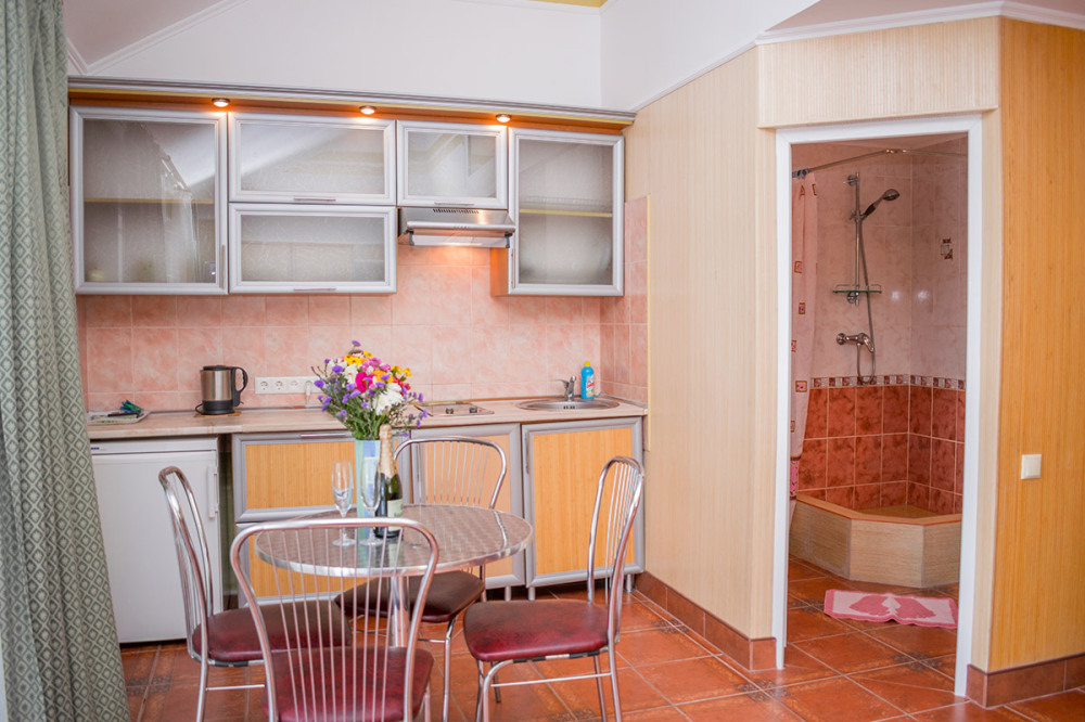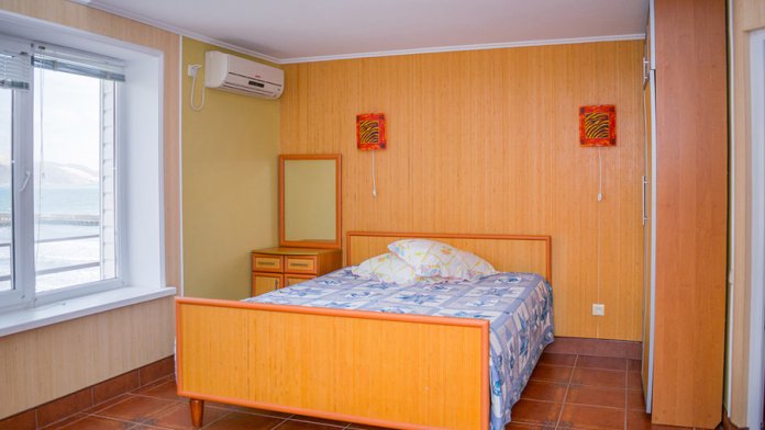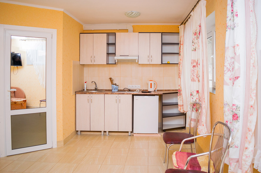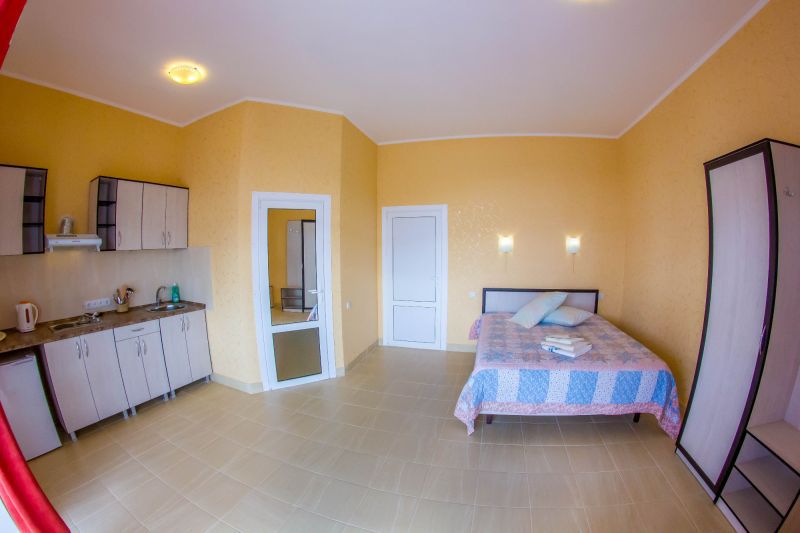 Оснащение: двуспальная кровать 160х200 в каждом номере; прикроватные тумбочки; удобный угловой диван; столики; телевизор; кондиционер; платяной шкаф; кухня (с холодильником, плиткой, электрическим чайником и микроволновой печью); санузел с душем в каждой комнате; отдельный выход из каждой комнаты.