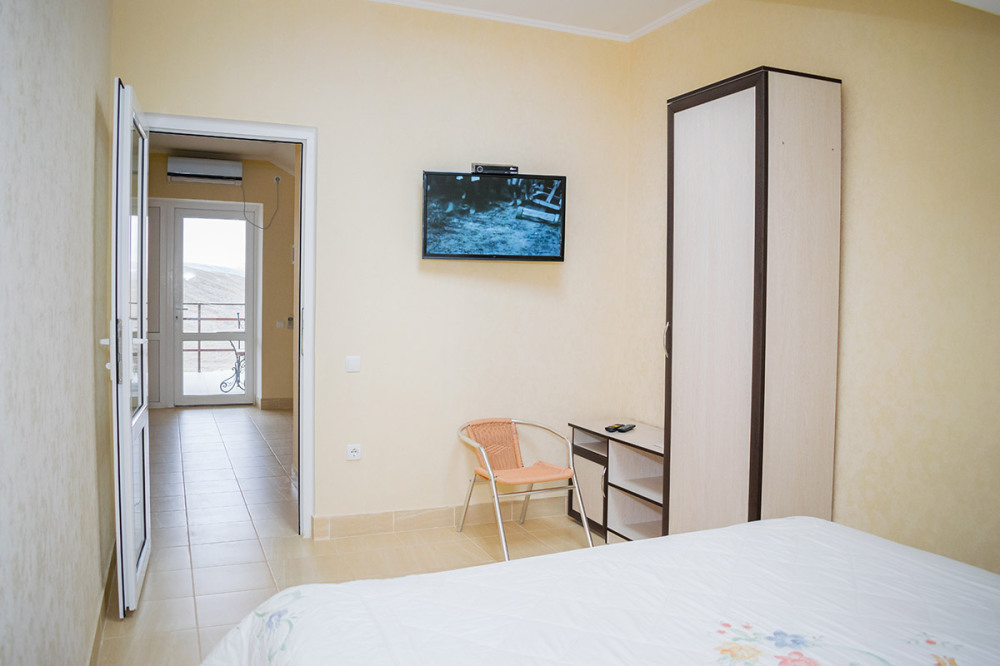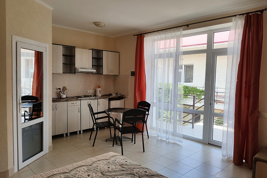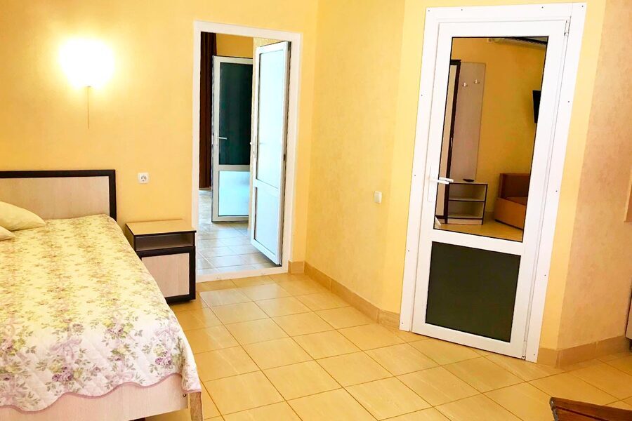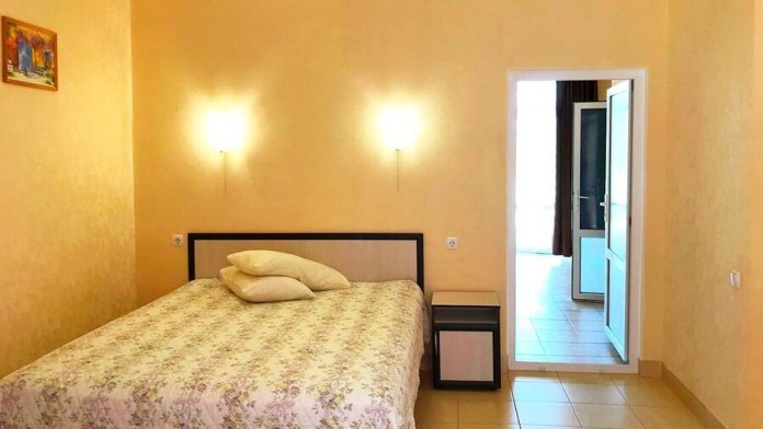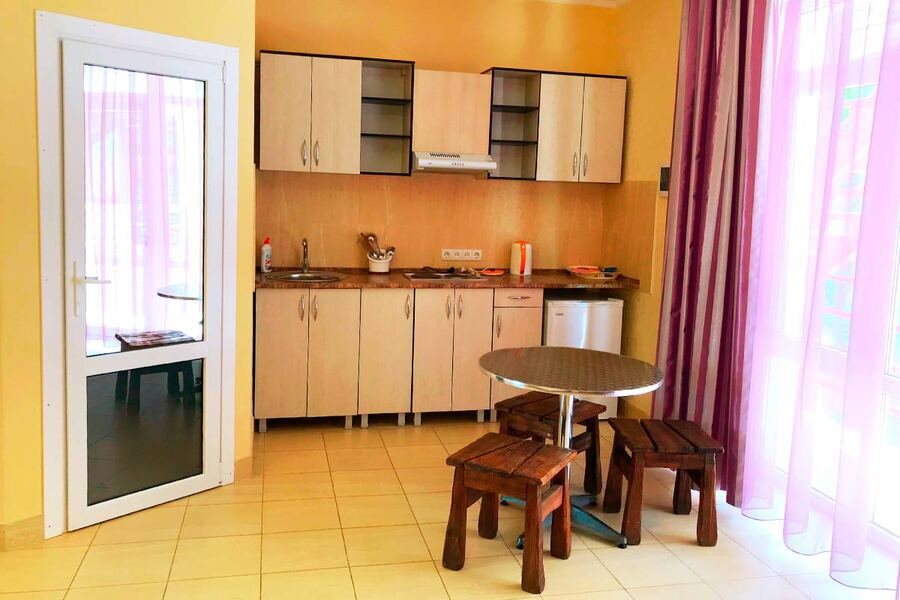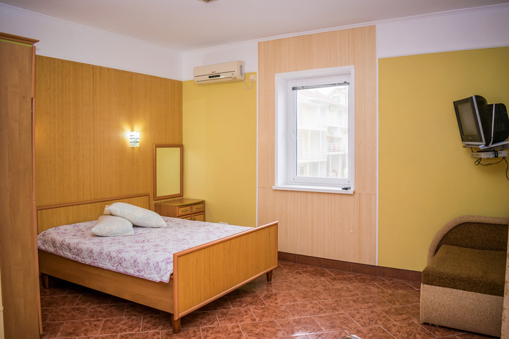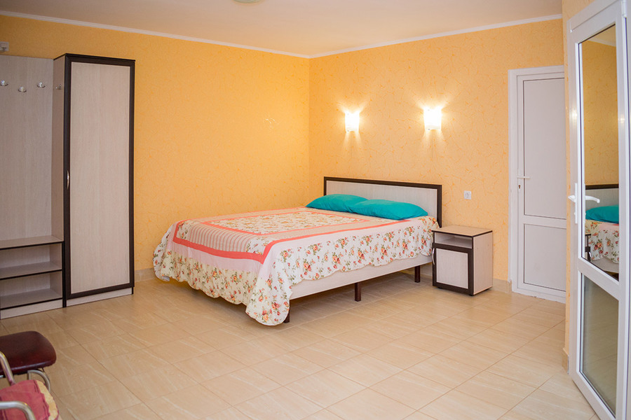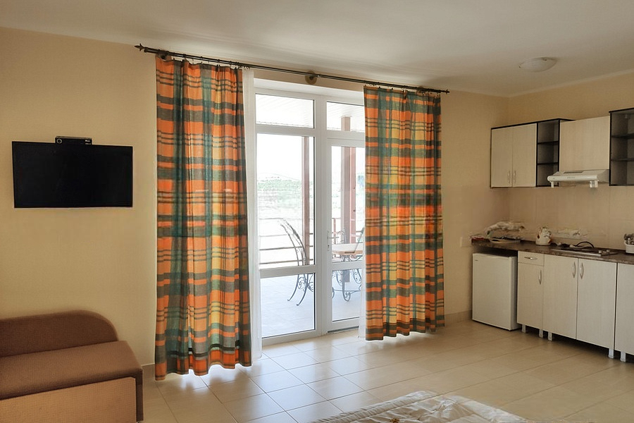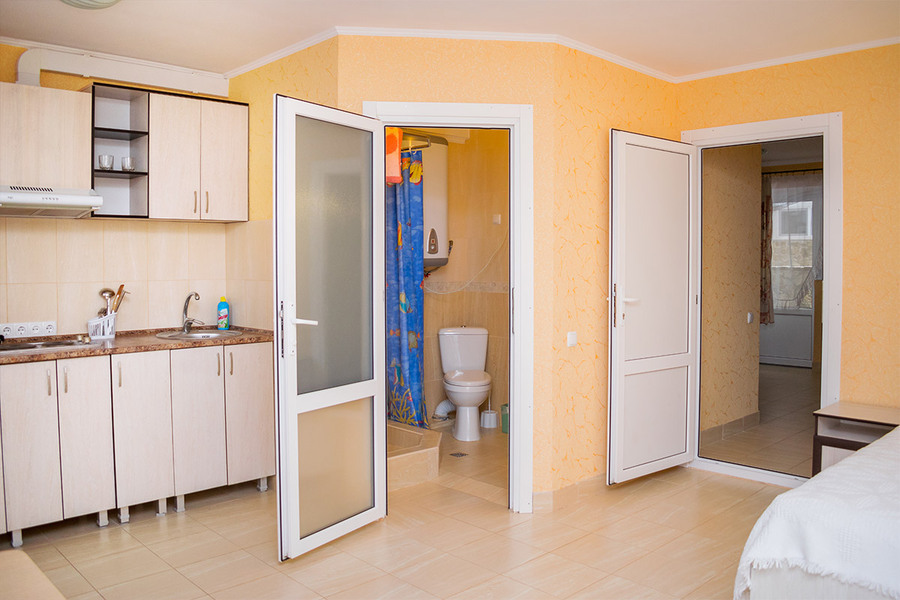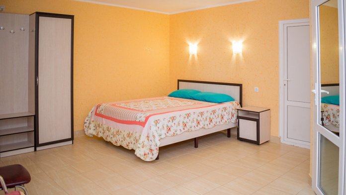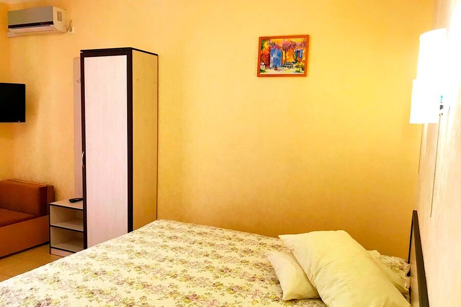 Оснащение: двуспальная кровать 160х200 в каждом номере; прикроватные тумбочки; удобный угловой диван; столики; телевизор; кондиционер; платяной шкаф; кухня (с холодильником, плиткой, электрическим чайником и микроволновой печью); санузел с душем в каждой комнате; отдельный выход из каждой комнаты.