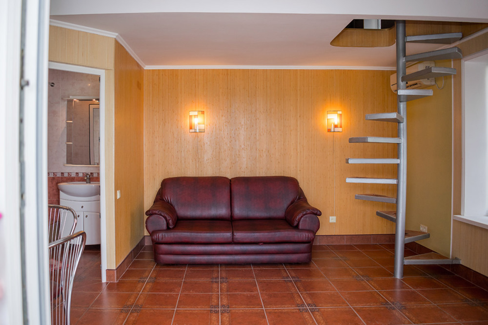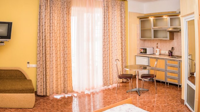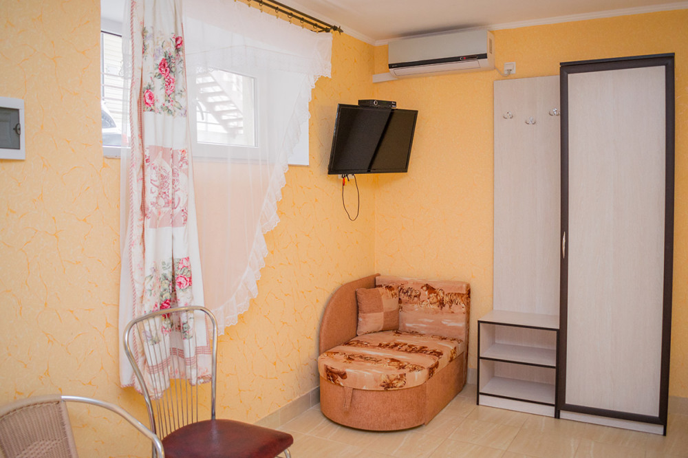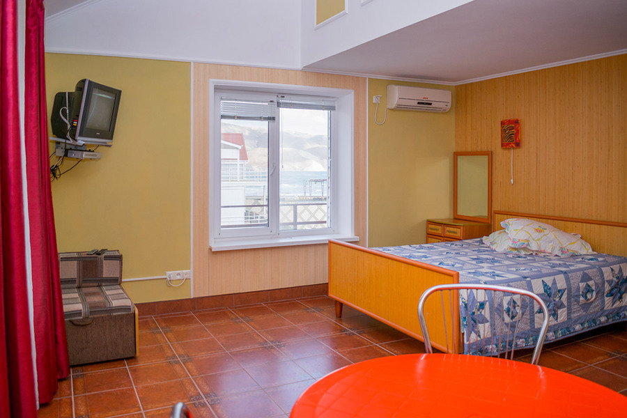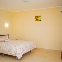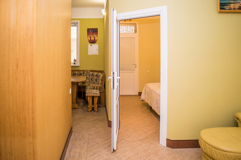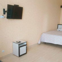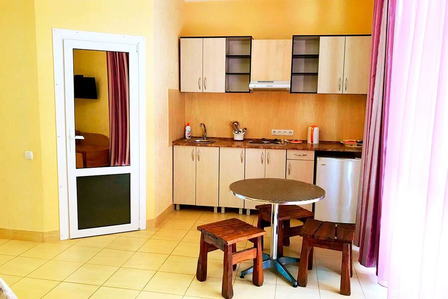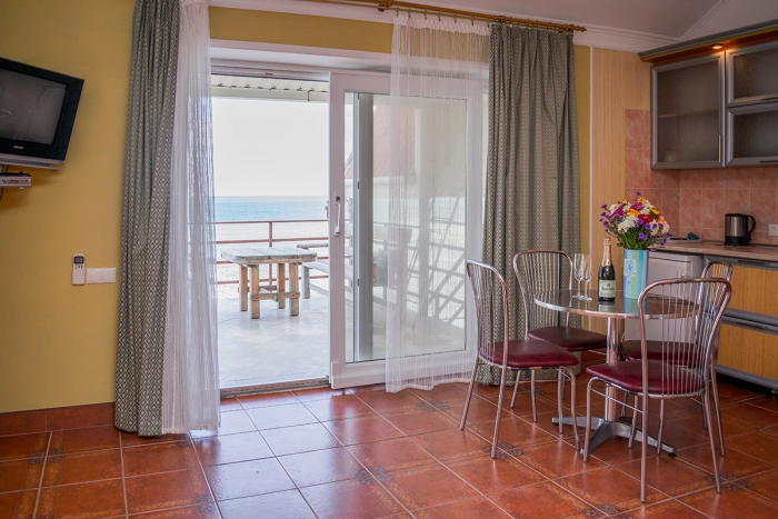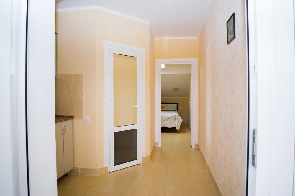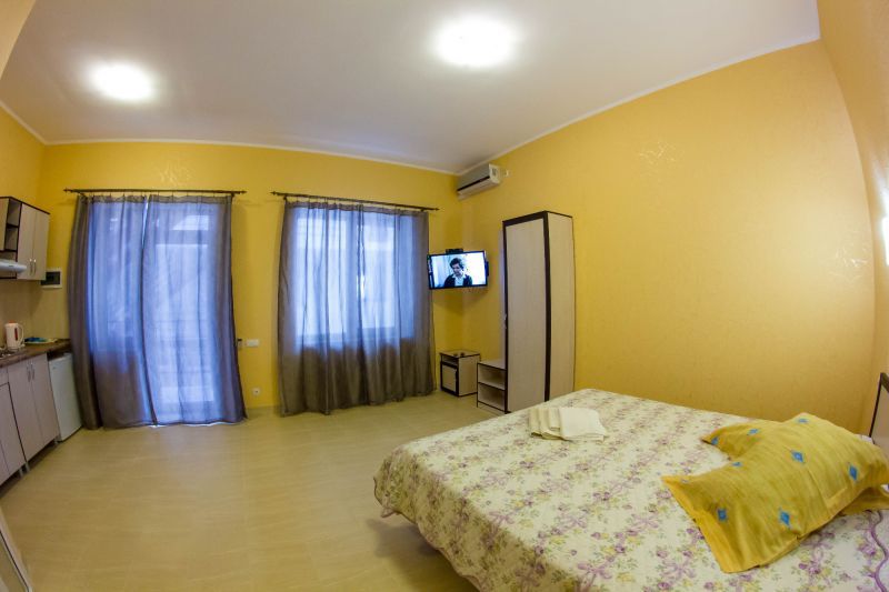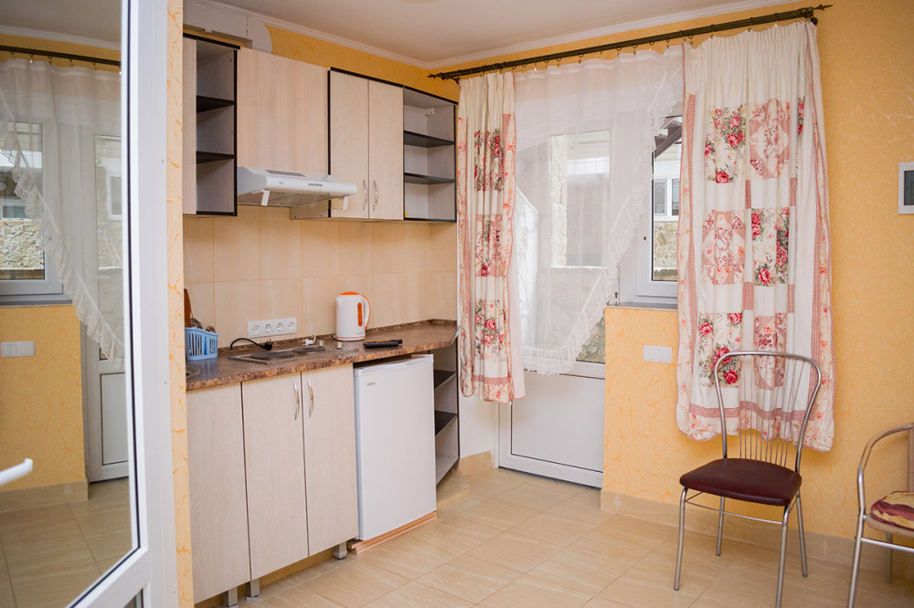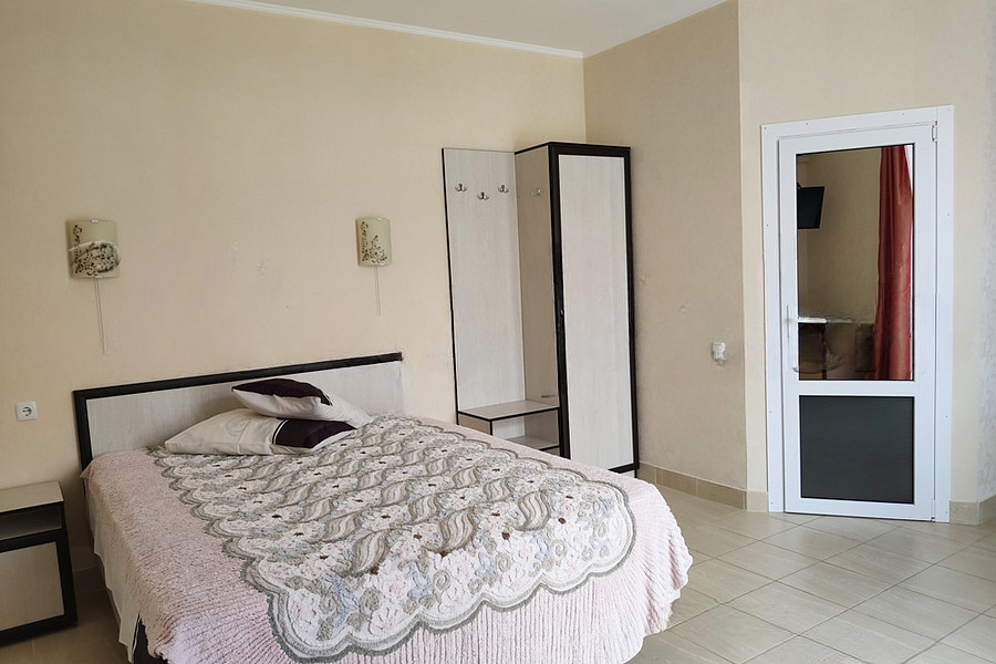 Оснащение: двуспальная кровать 160х200 в каждом номере; прикроватные тумбочки; удобный угловой диван; столики; телевизор; кондиционер; платяной шкаф; кухня (с холодильником, плиткой, электрическим чайником и микроволновой печью); санузел с душем в каждой комнате; отдельный выход из каждой комнаты.
