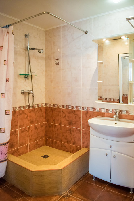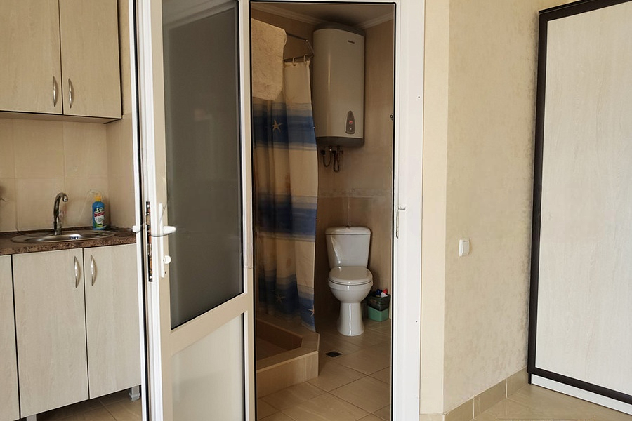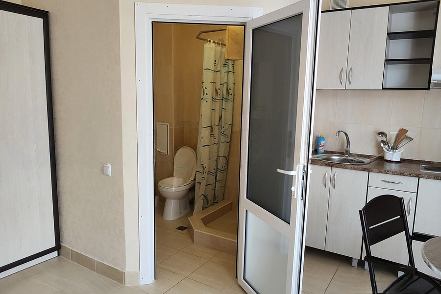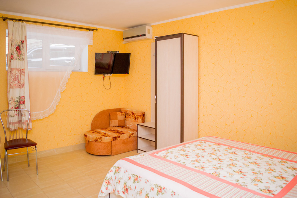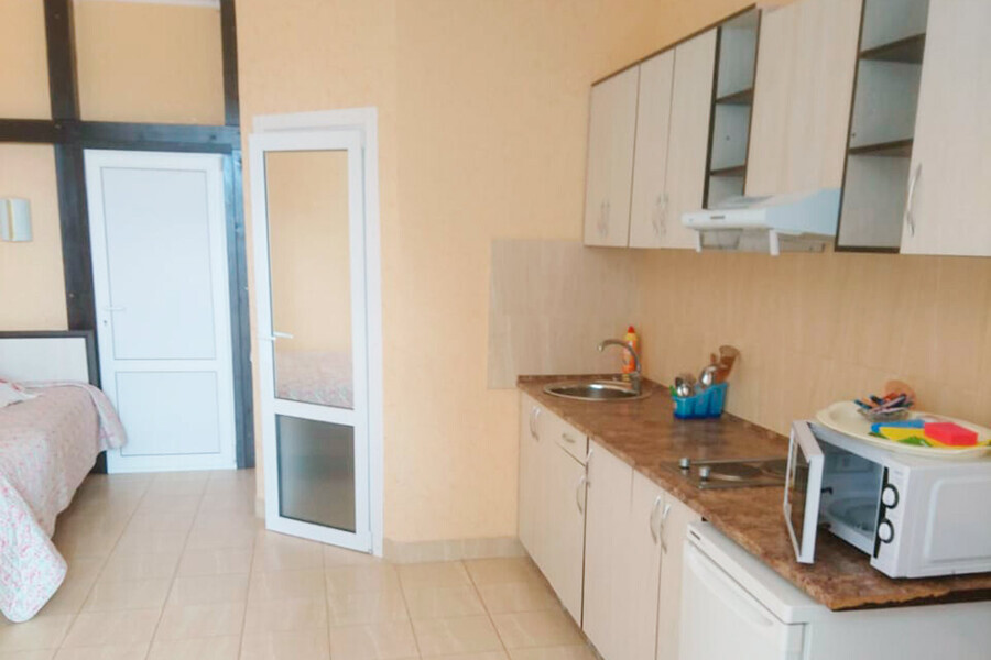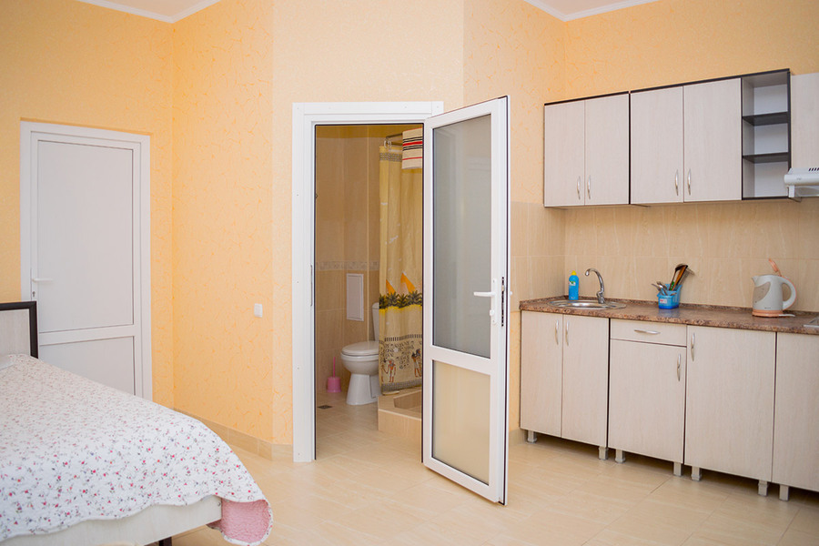 Оснащение: двуспальная кровать 160х200; прикроватная тумбочка; удобный угловой диван; столики; телевизор; кондиционер; платяной шкаф; кухня (с холодильником, плиткой, электрическим чайником и микроволновой печью); санузел с душем; отдельный вход.