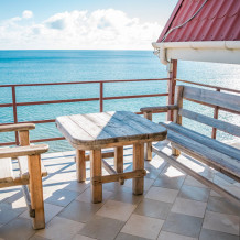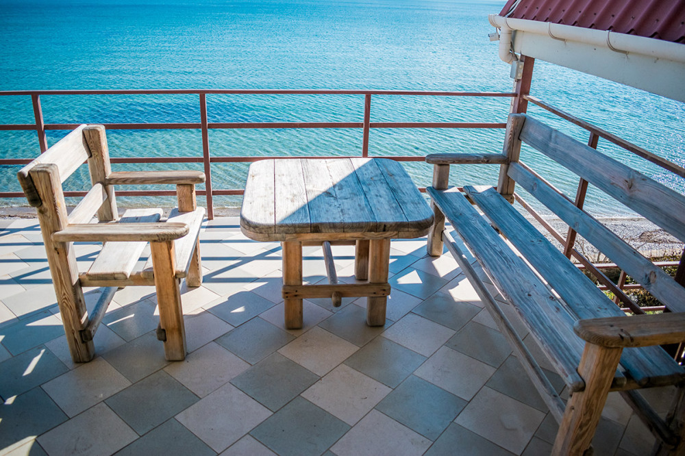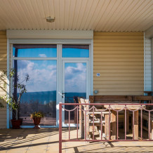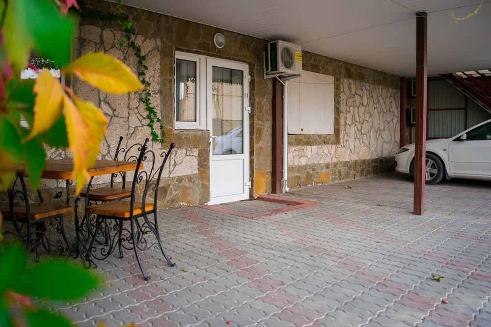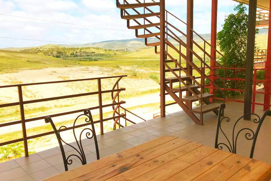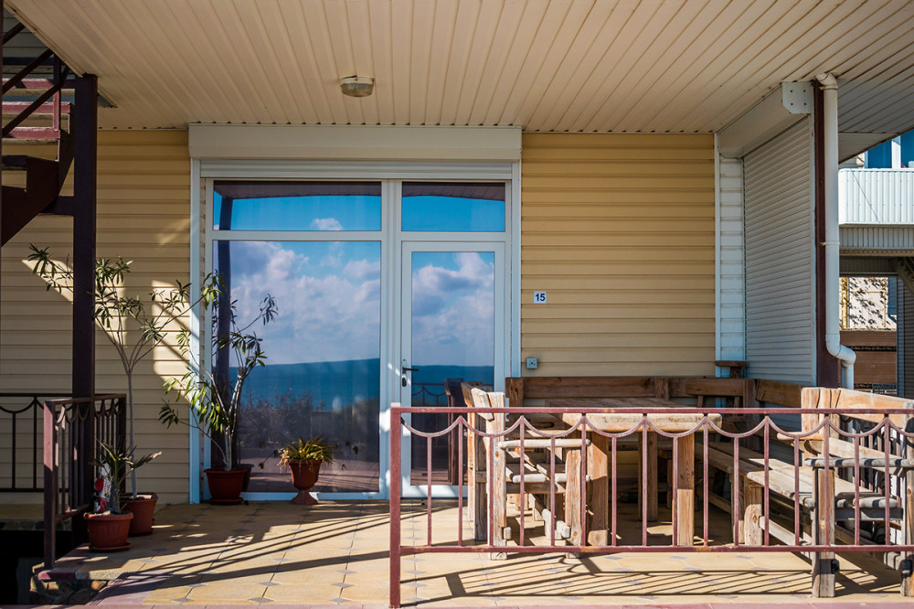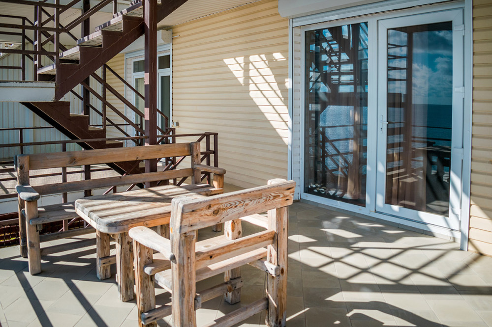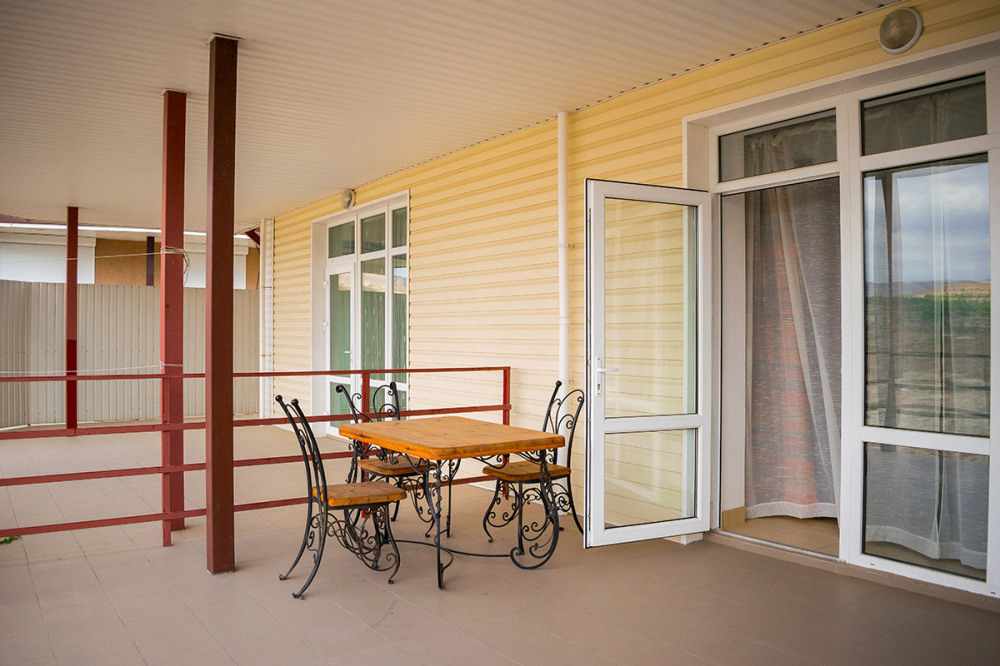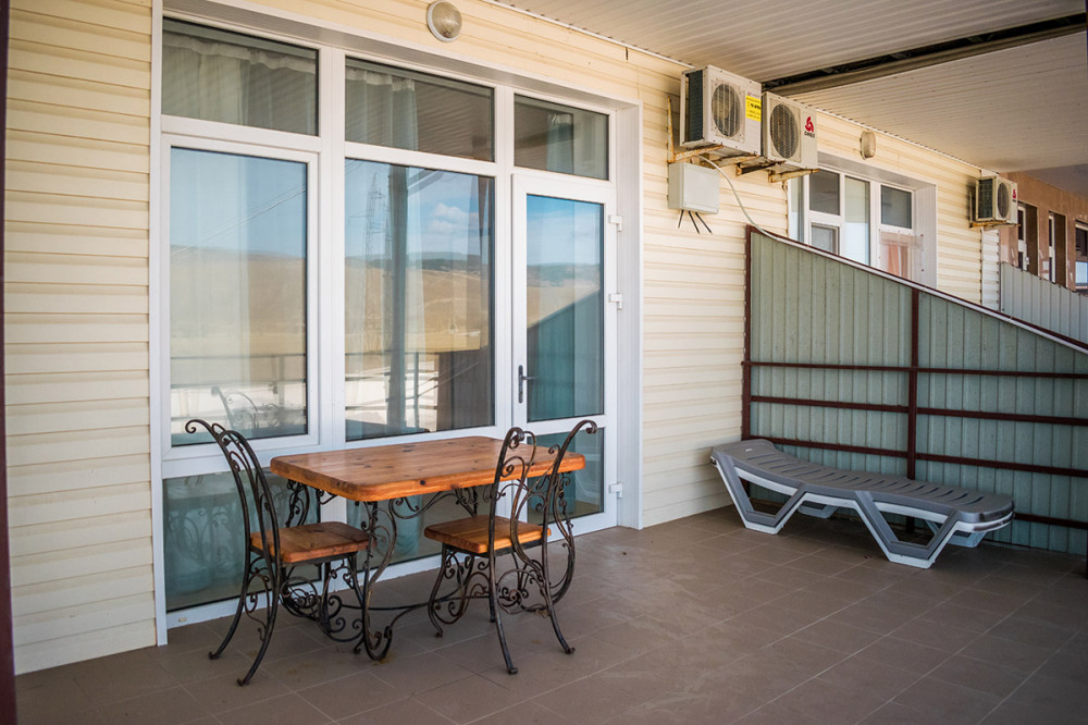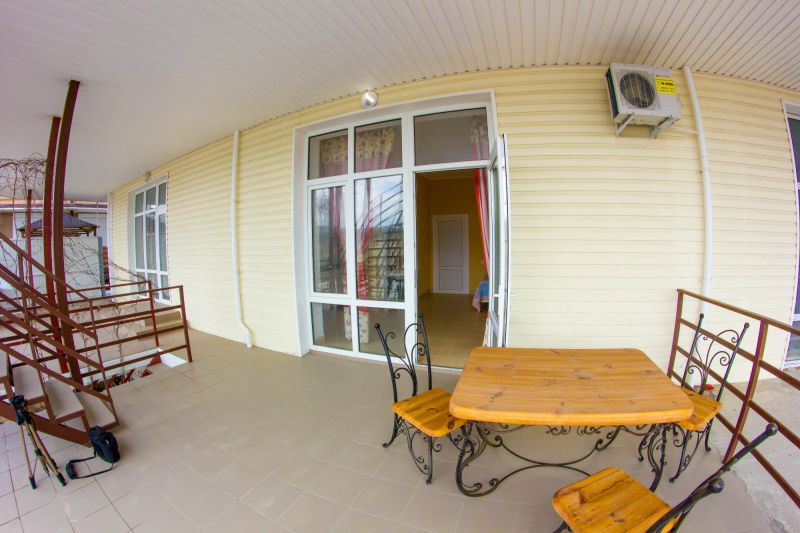 Оснащение: двуспальная кровать 160х200; прикроватная тумбочка; удобный кожаный диван; кожаные кресла; столики; телевизор; кондиционер; платяной шкаф; кухня (с холодильником, плиткой, электрическим чайником и микроволновой печью); санузел с душем; балкон с летней мебелью; отдельный вход.