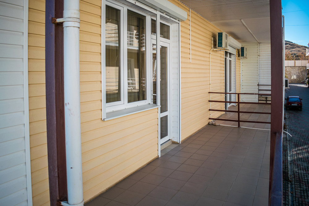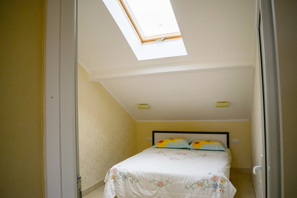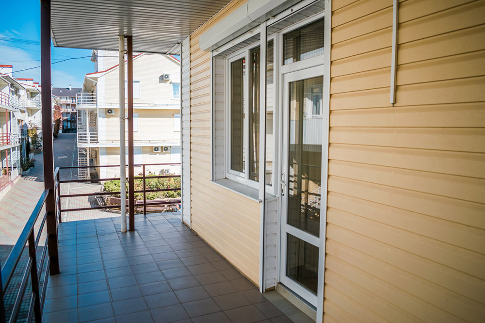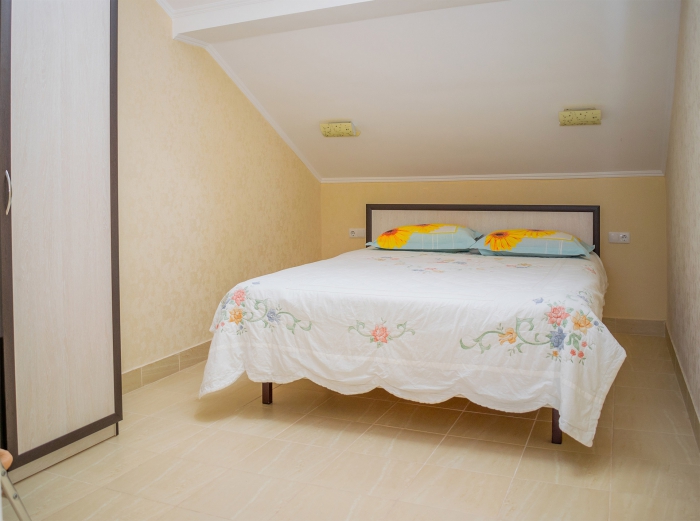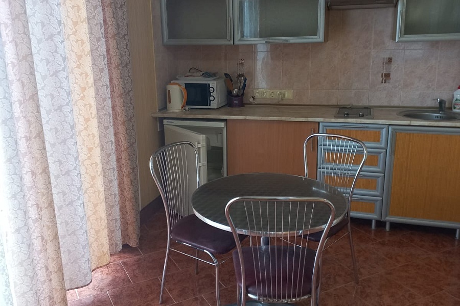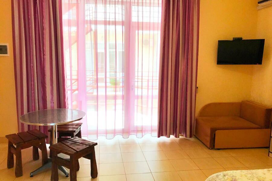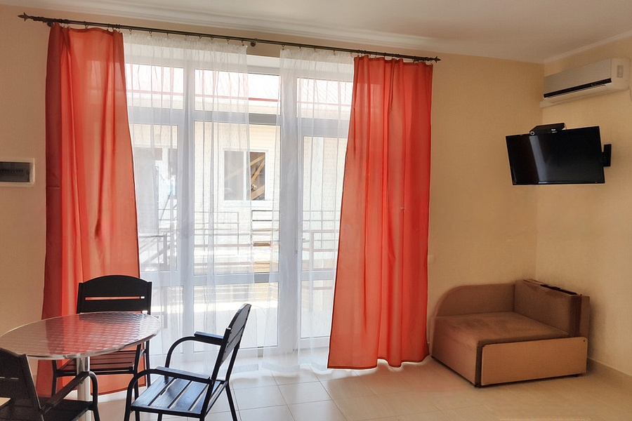 Оснащение: двуспальная кровать 160х200; прикроватная тумбочка; удобный угловой диван; столики; телевизор; кондиционер; платяной шкаф; кухня (с холодильником, плиткой, электрическим чайником и микроволновой печью); санузел с душем; балкон с летней мебелью; отдельный вход.