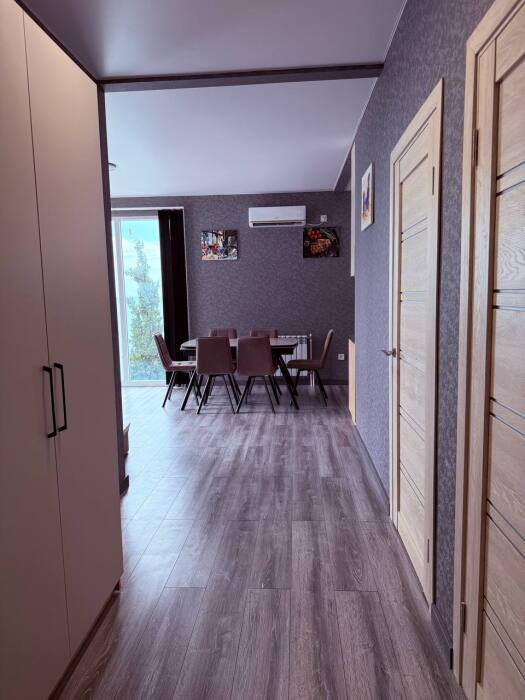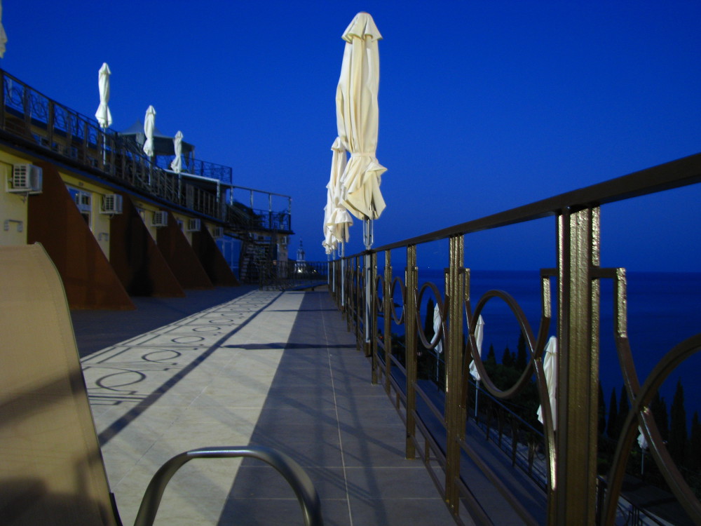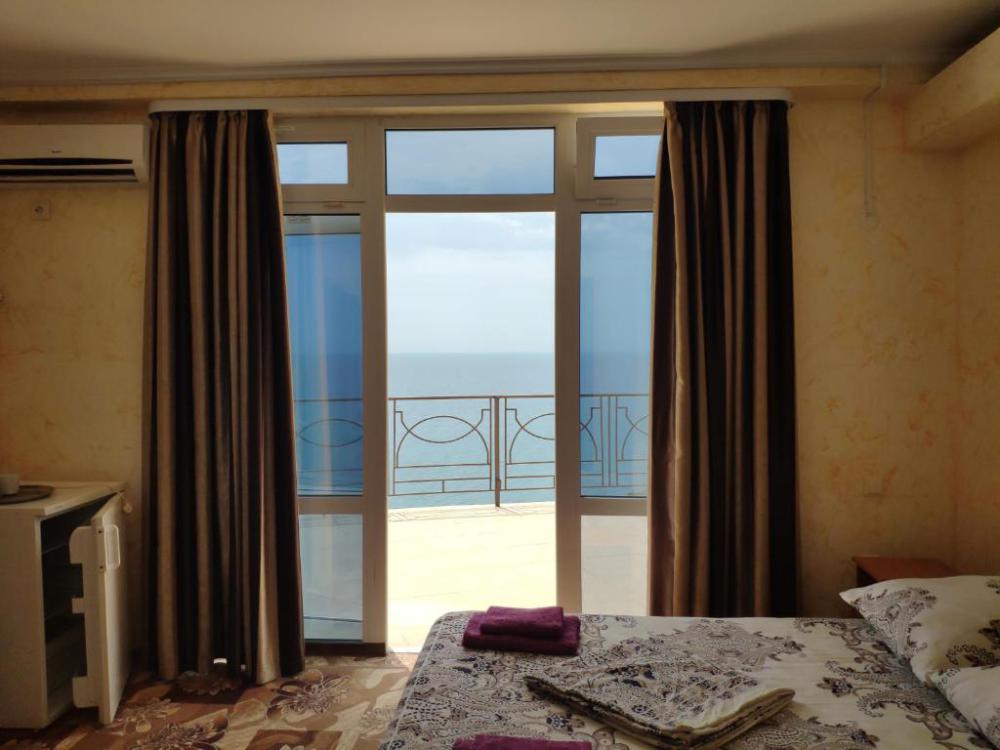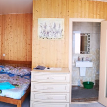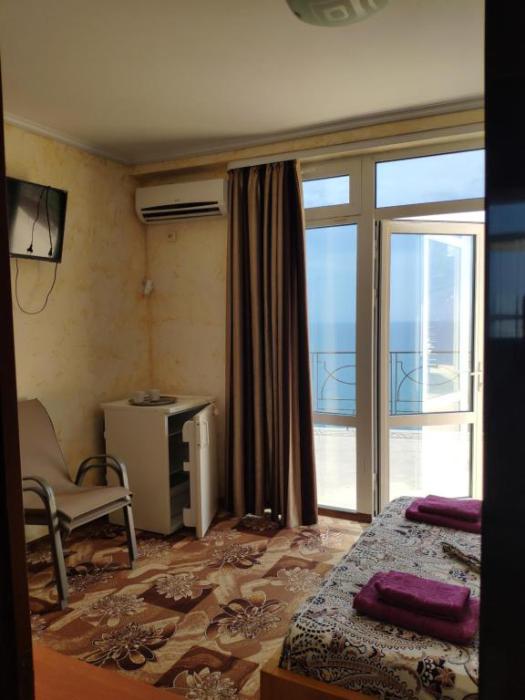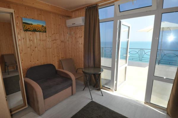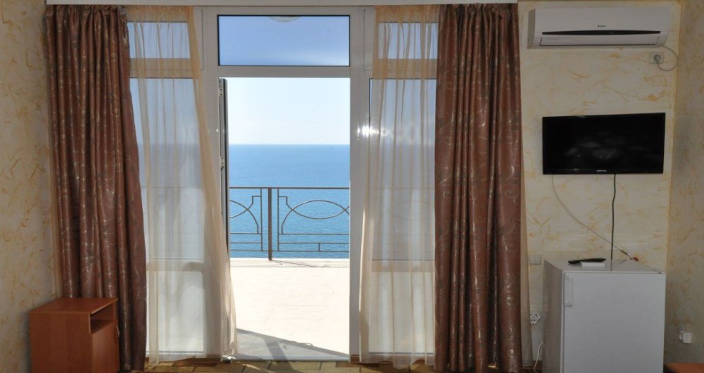 Улучшенный, с повышенной комфортностью и видом на море. В номере имеются: кондиционер, двухспальная кровать, кресло-кровать, шкаф, комод, столик, кресла, зеркало, телевизор, холодильник, электрический чайник с набором чашек, свой санузел+душ (одноразовый гель для душа, шампунь, жидкое мыло во флаконе с дозатором, туалетная бумага, большое и маленькое полотенца). Уборка номера раз в 3-4 дня, замена постельного белья - раз в пять дней.