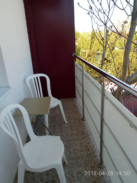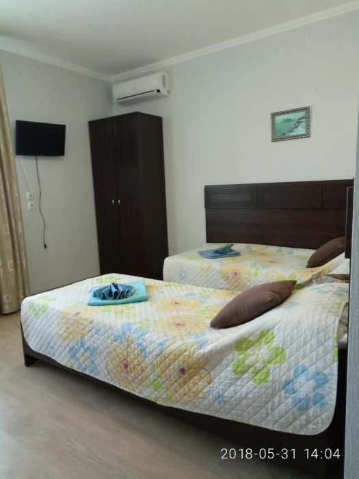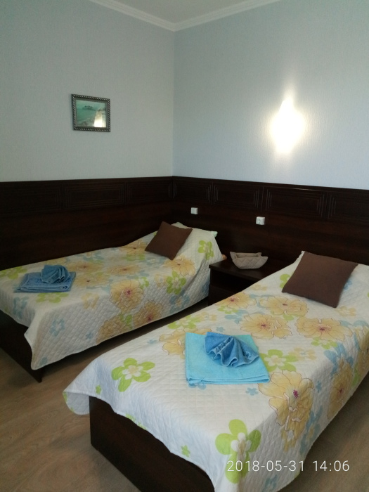 В номере 1 двуспальная кровать или 2 односпальные кровати, 1 диван-кровать. В номере есть балкон с садовой мебелью. На окнах москитные сетки.