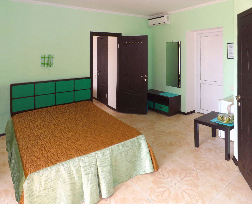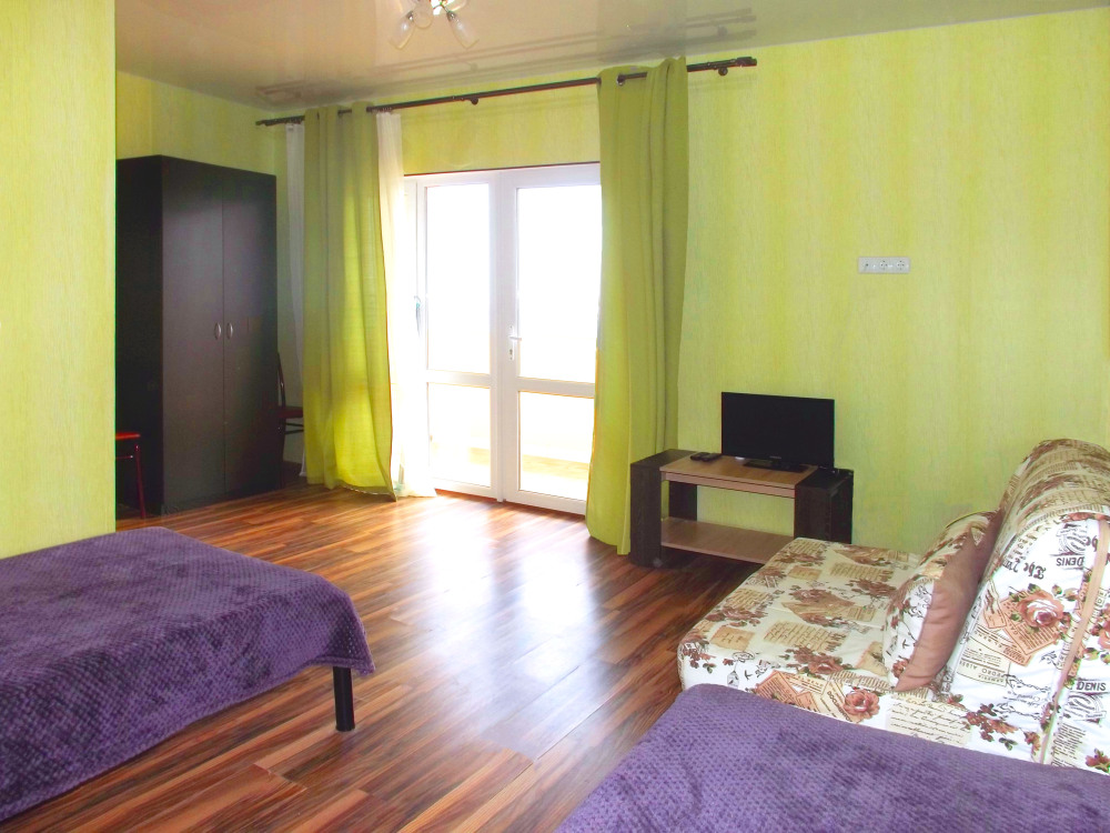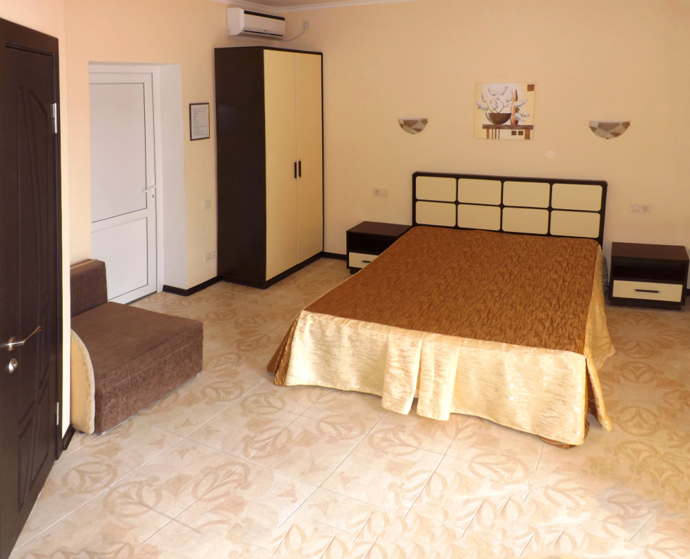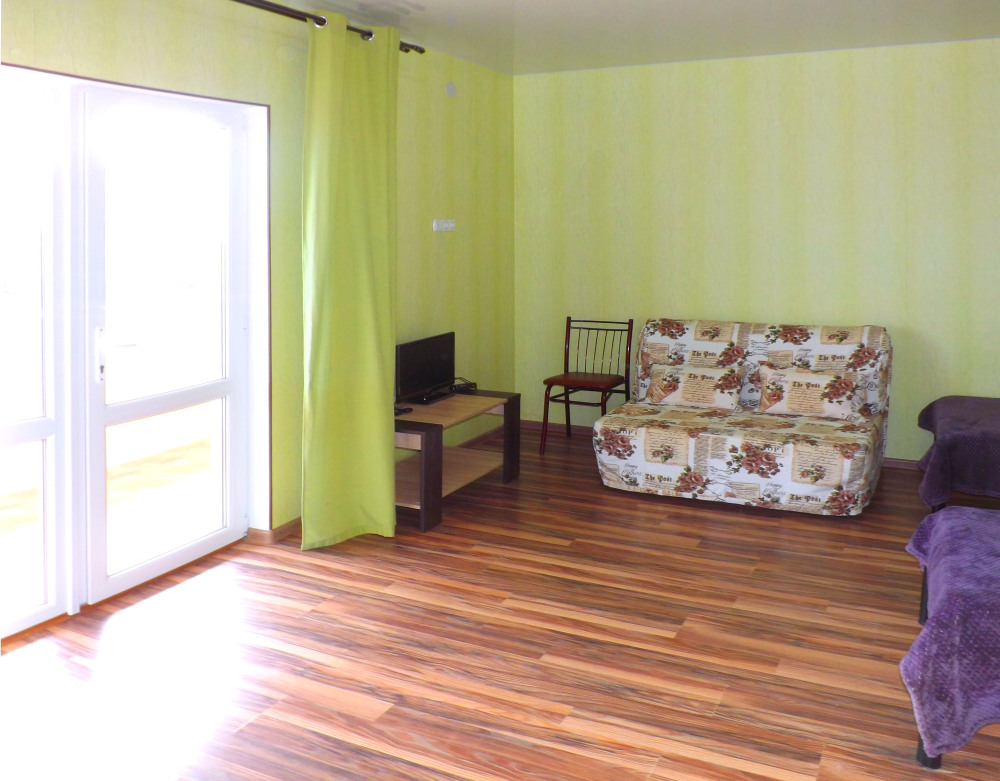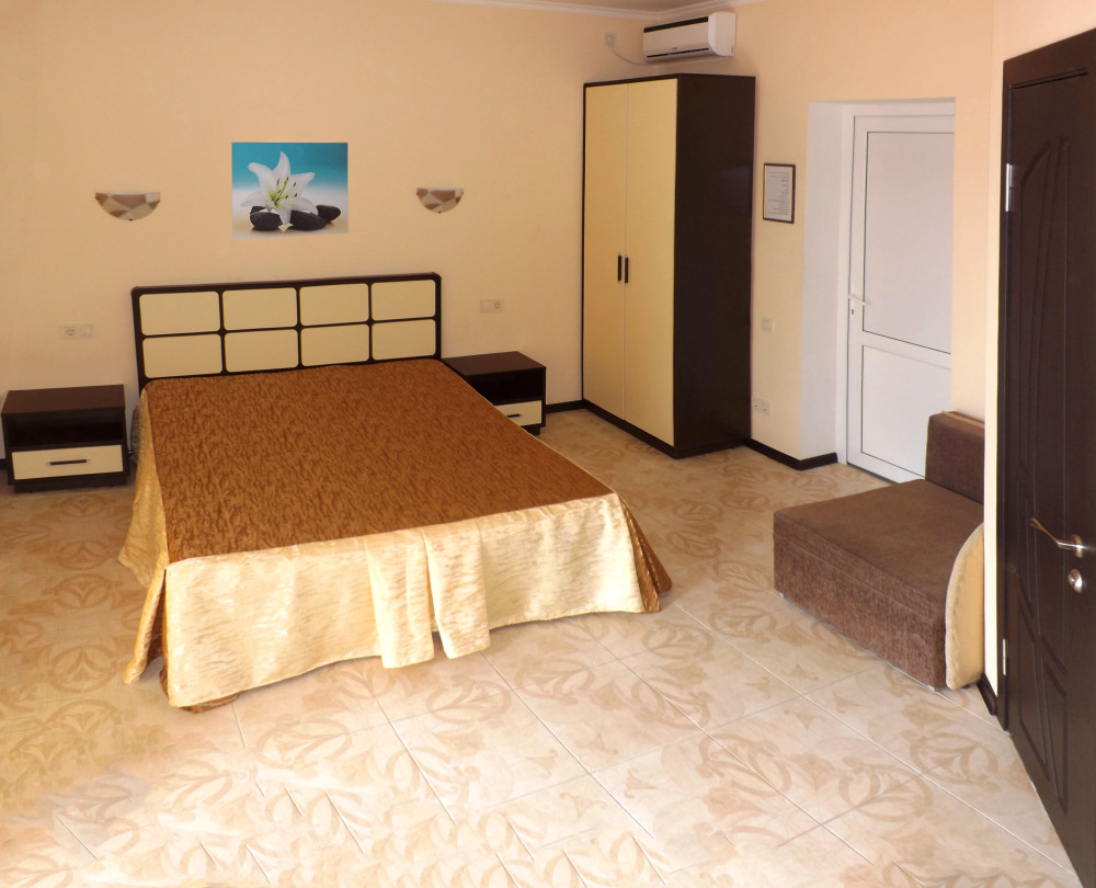 В номере две большие комнаты (в первой комнате двухспальная кровать, во второй две раздельные кровати и раскладной 1.5 спальный диван-кровать), индивидуальный большой балкон (из каждой комнаты есть выход на балкон), расположен на 3-м этаже Виллы Васалия. Панорамный вид на море. Удобства: санузел(фен в санузле), комплект полотенец, мини-холодильник, кондиционер(в комнате с двухспальной кроватью), цифровое TV, чайник, зона отдыха на балконе(стол+стулья). Есть возможность воспользоваться микроволновой печью, плитой, стиральной машиной и утюгом. Стоимость за размещение 5-ти гостей.