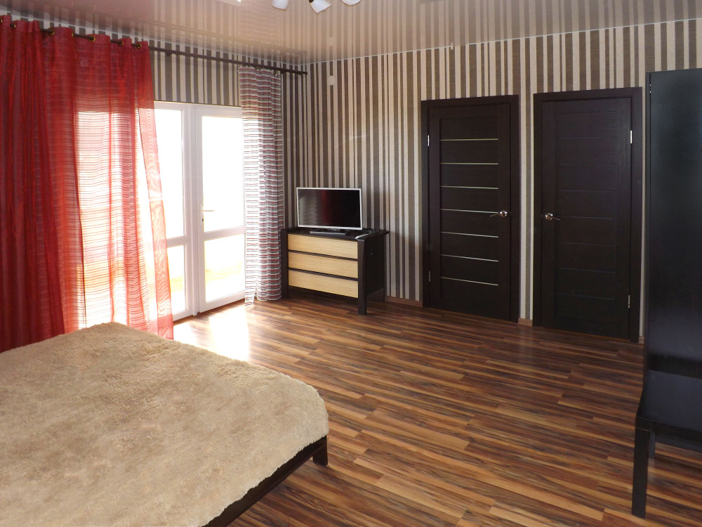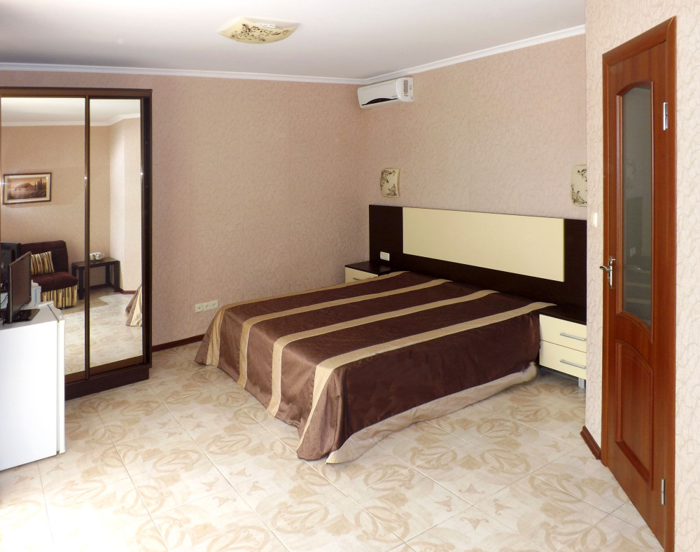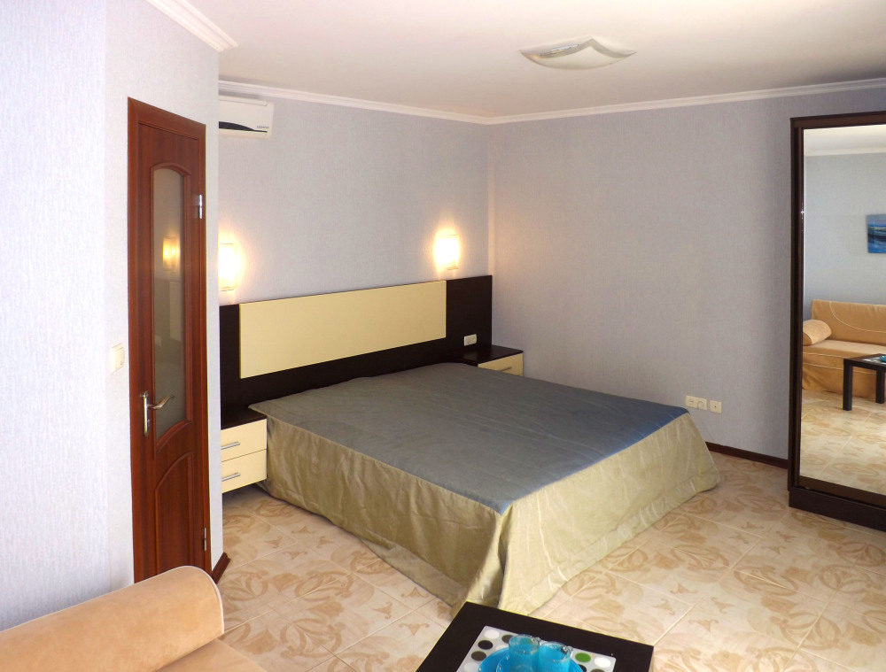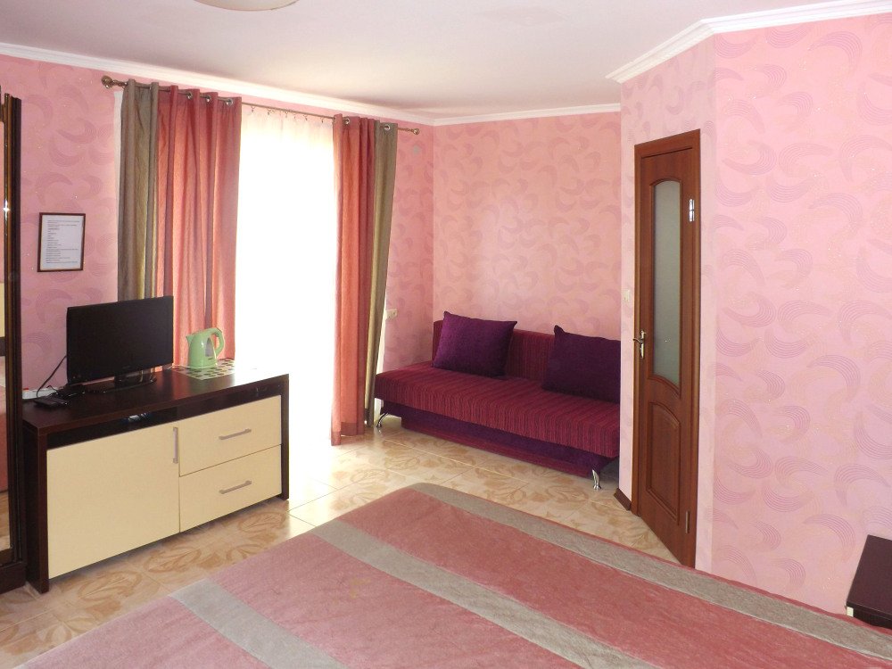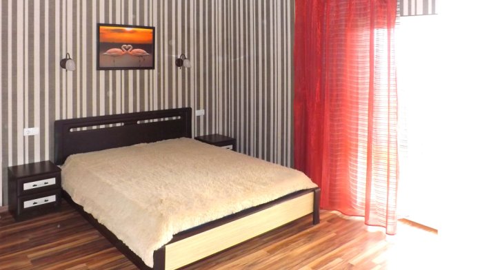 В номере две большие комнаты (в первой комнате двухспальная кровать, во второй две раздельные кровати и раскладной 1.5 спальный диван-кровать), индивидуальный большой балкон (из каждой комнаты есть выход на балкон), расположен на 3-м этаже Виллы Васалия. Панорамный вид на море. Удобства: санузел(фен в санузле), комплект полотенец, мини-холодильник, кондиционер(в комнате с двухспальной кроватью), цифровое TV, чайник, зона отдыха на балконе(стол+стулья). Есть возможность воспользоваться микроволновой печью, плитой, стиральной машиной и утюгом. Стоимость за размещение 5-ти гостей.