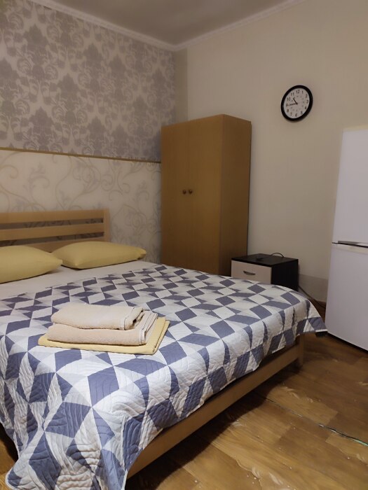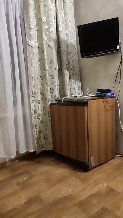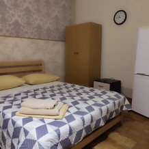 Номер находится на 1 этаже.В номере двухспальная кровать,тумбочки,шкаф, телевизор, холодильник, кондиционер.