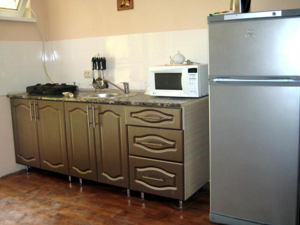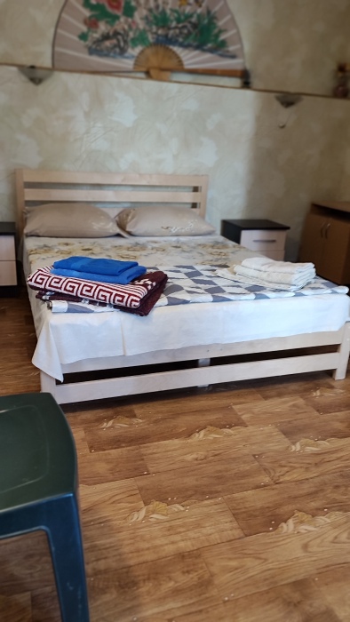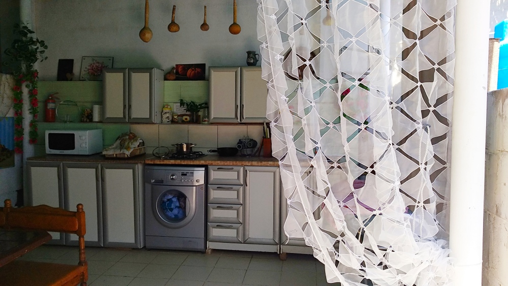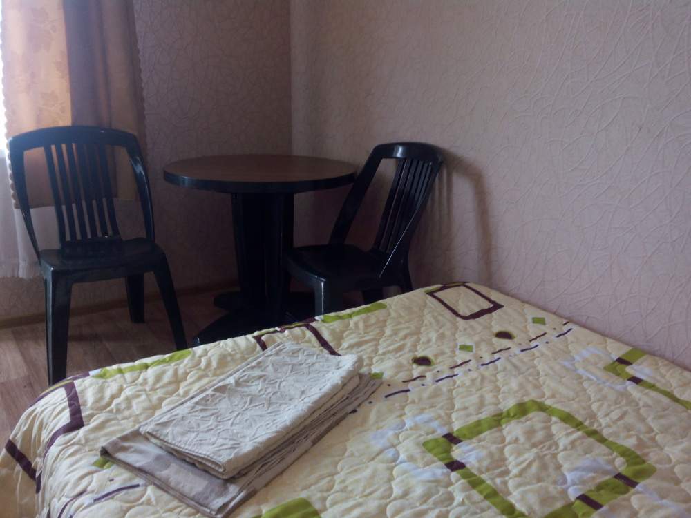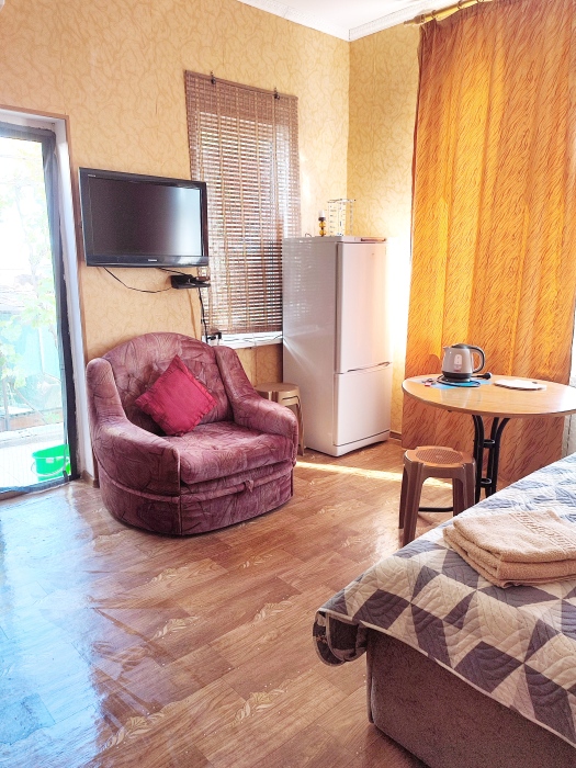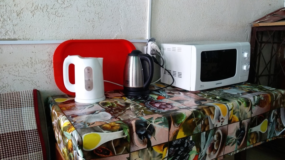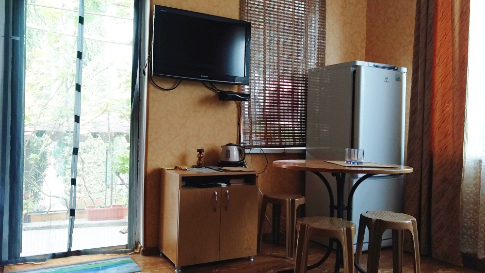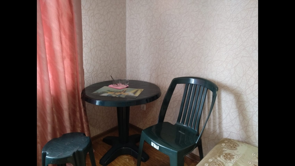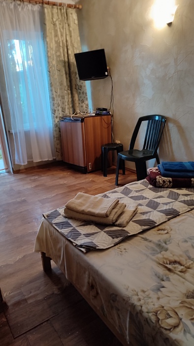 Четырехместный номер на 1- ом этаже.У номера есть отдельный вход,свой санузел,кондиционер,столик возле номера и беседка.Кухня общая со стиральной машиной, микроволновой печью и двумя плитами рядом.