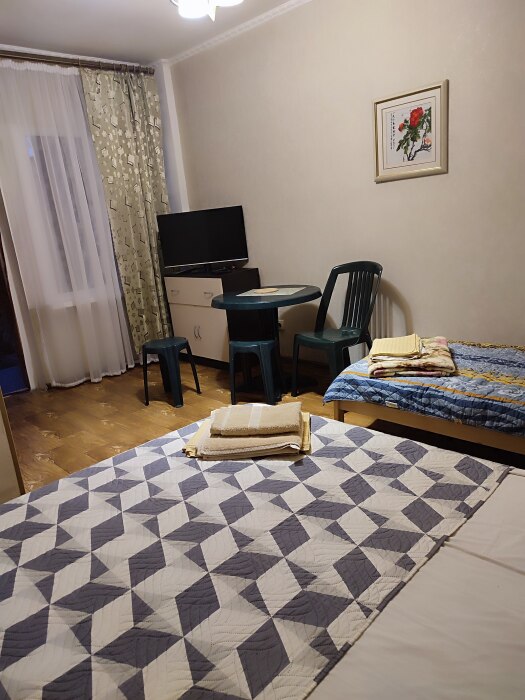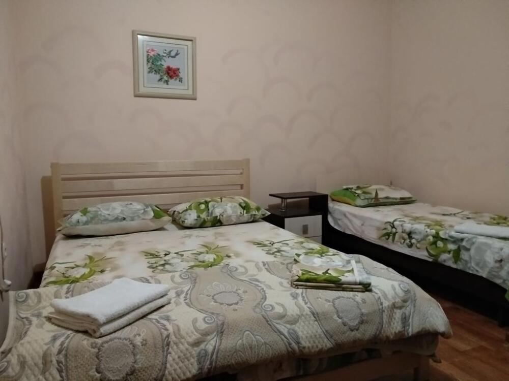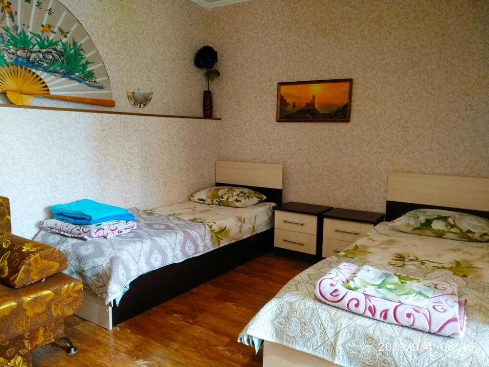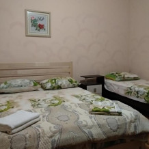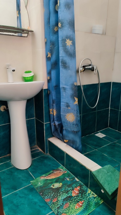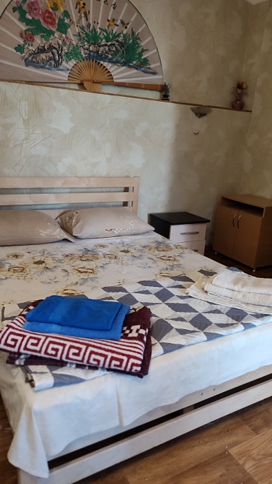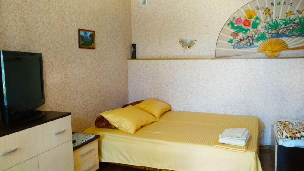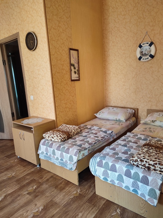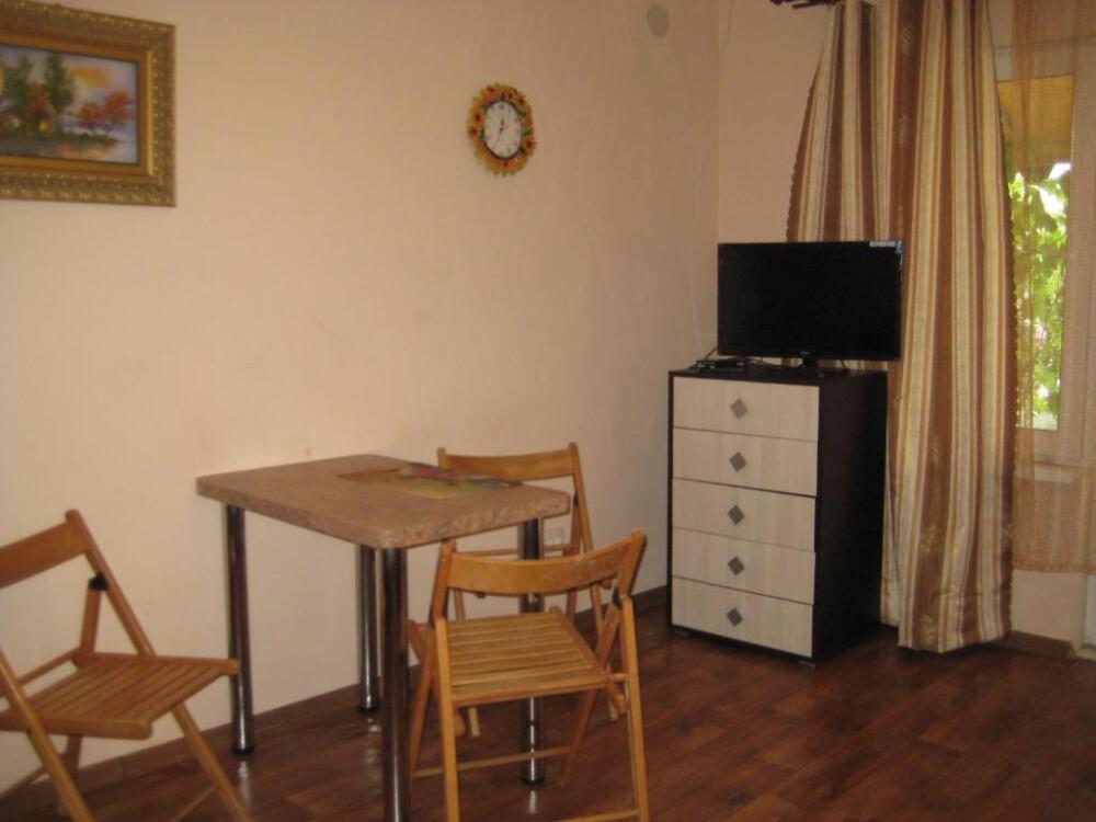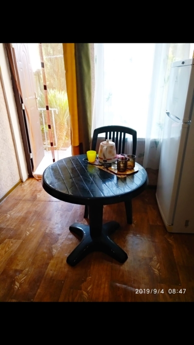 Четырехместный номер на 1- ом этаже.У номера есть отдельный вход,свой санузел,кондиционер,столик возле номера и беседка.Кухня общая со стиральной машиной, микроволновой печью и двумя плитами рядом.