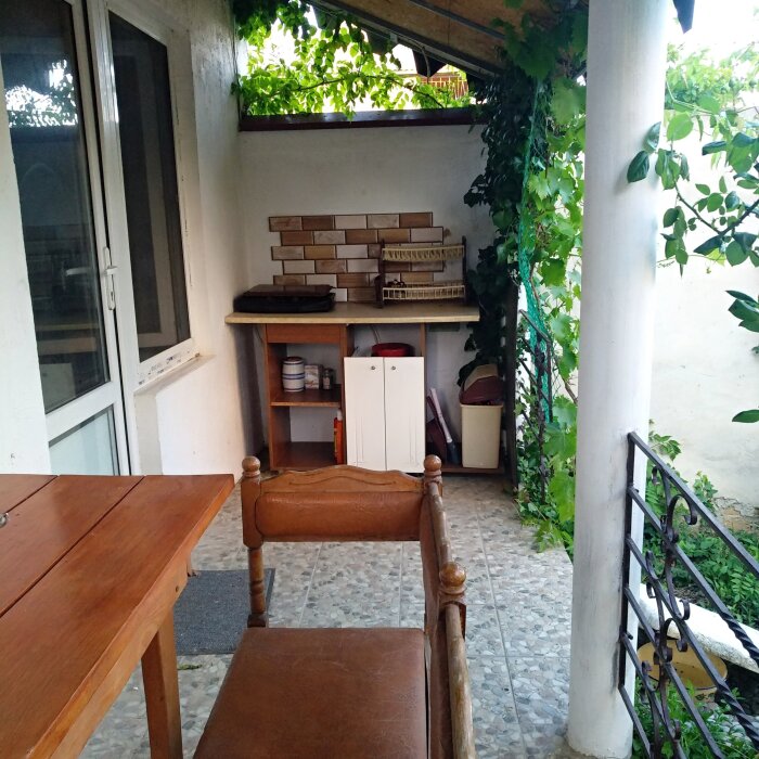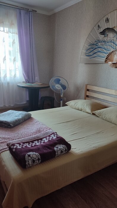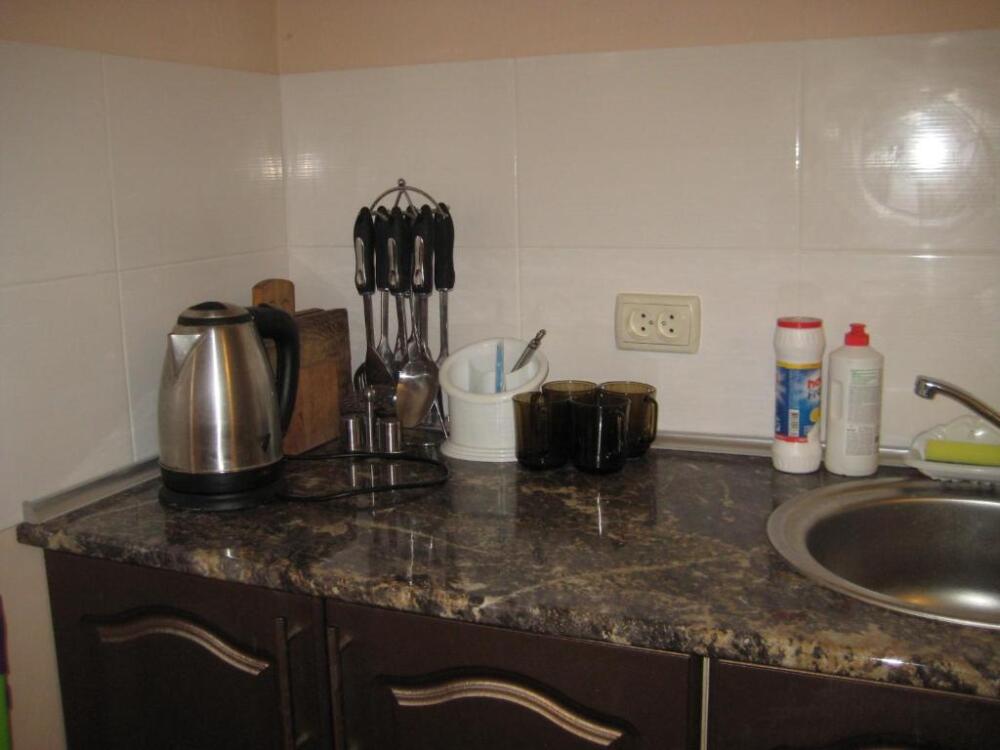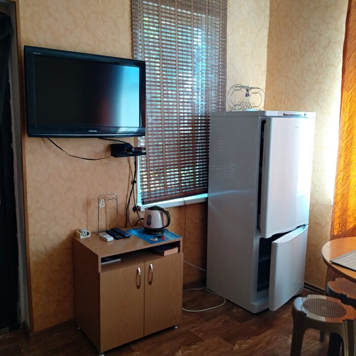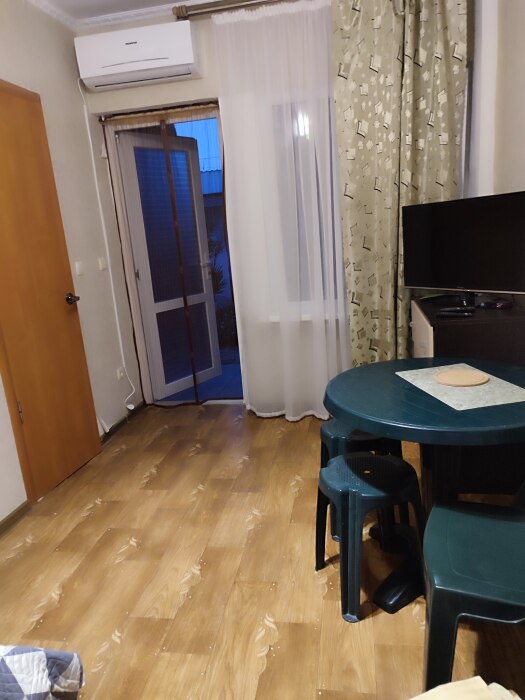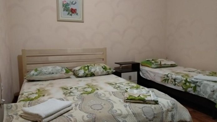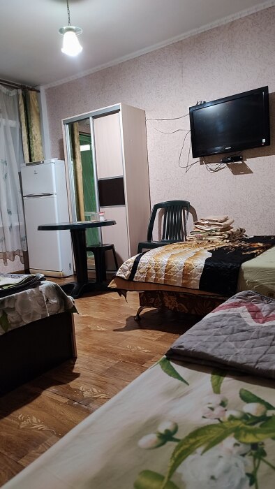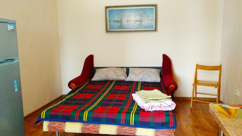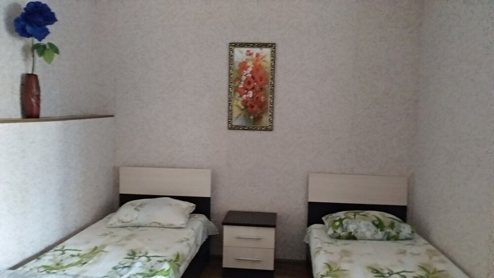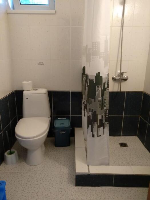 Четырехместный номер на 1- ом этаже.У номера есть отдельный вход,свой санузел,кондиционер,столик возле номера и беседка.Кухня общая со стиральной машиной, микроволновой печью и двумя плитами рядом.