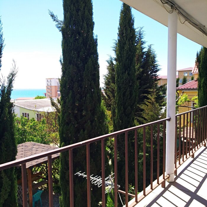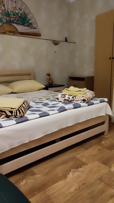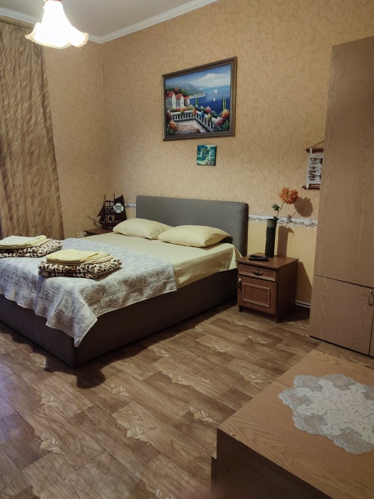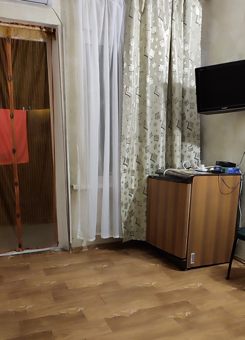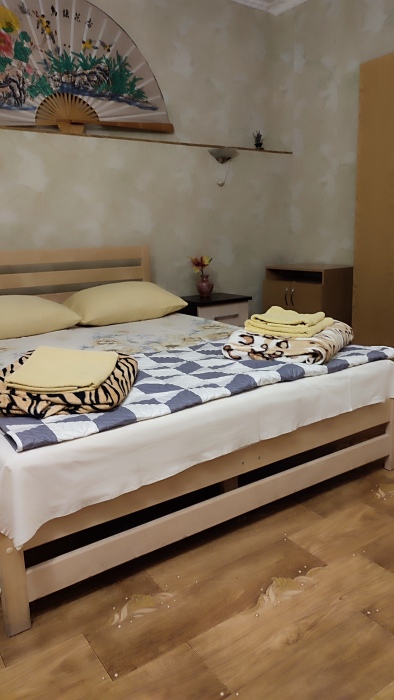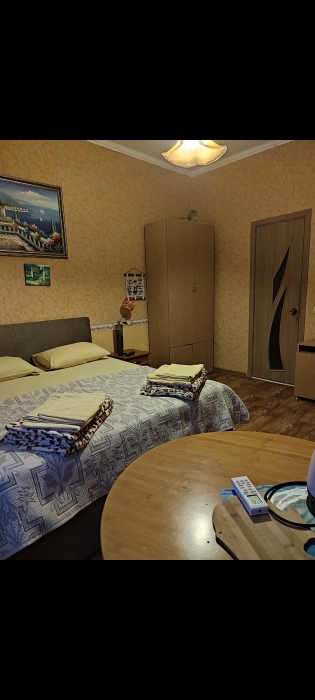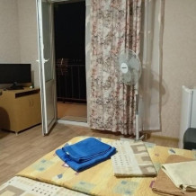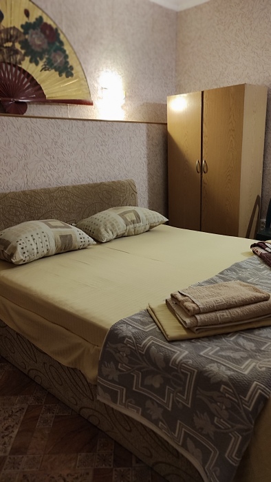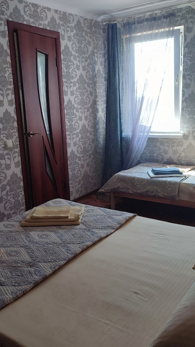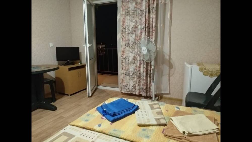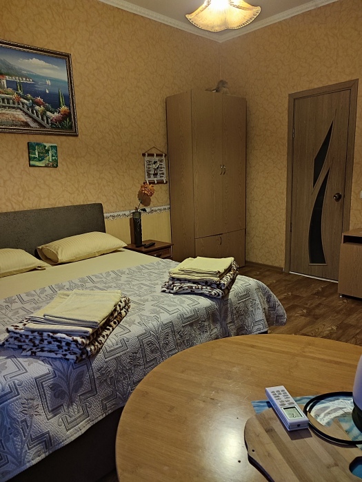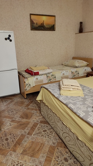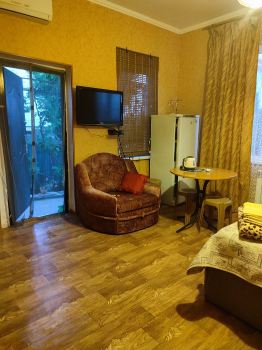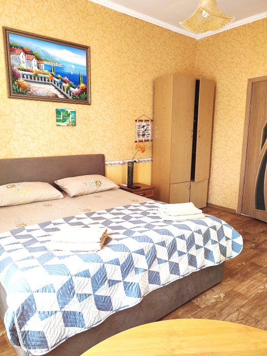 Номер состоит из двух отдельных комнат,с кондиционером в спальне,со своим балконом и своим кухонным уголком с газ.плитой., микроволновкой, мультиваркой.Рассчитан до 5 человек.