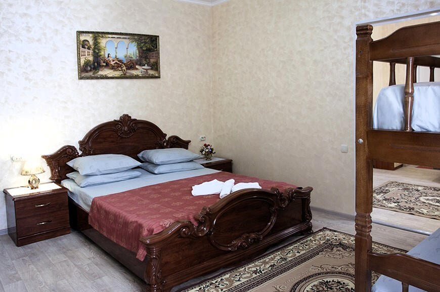 Основное место - двуспальная кровать (160/180*200 см) + двуспальный диван. Дополнительное место - двухъярусная кровать.
